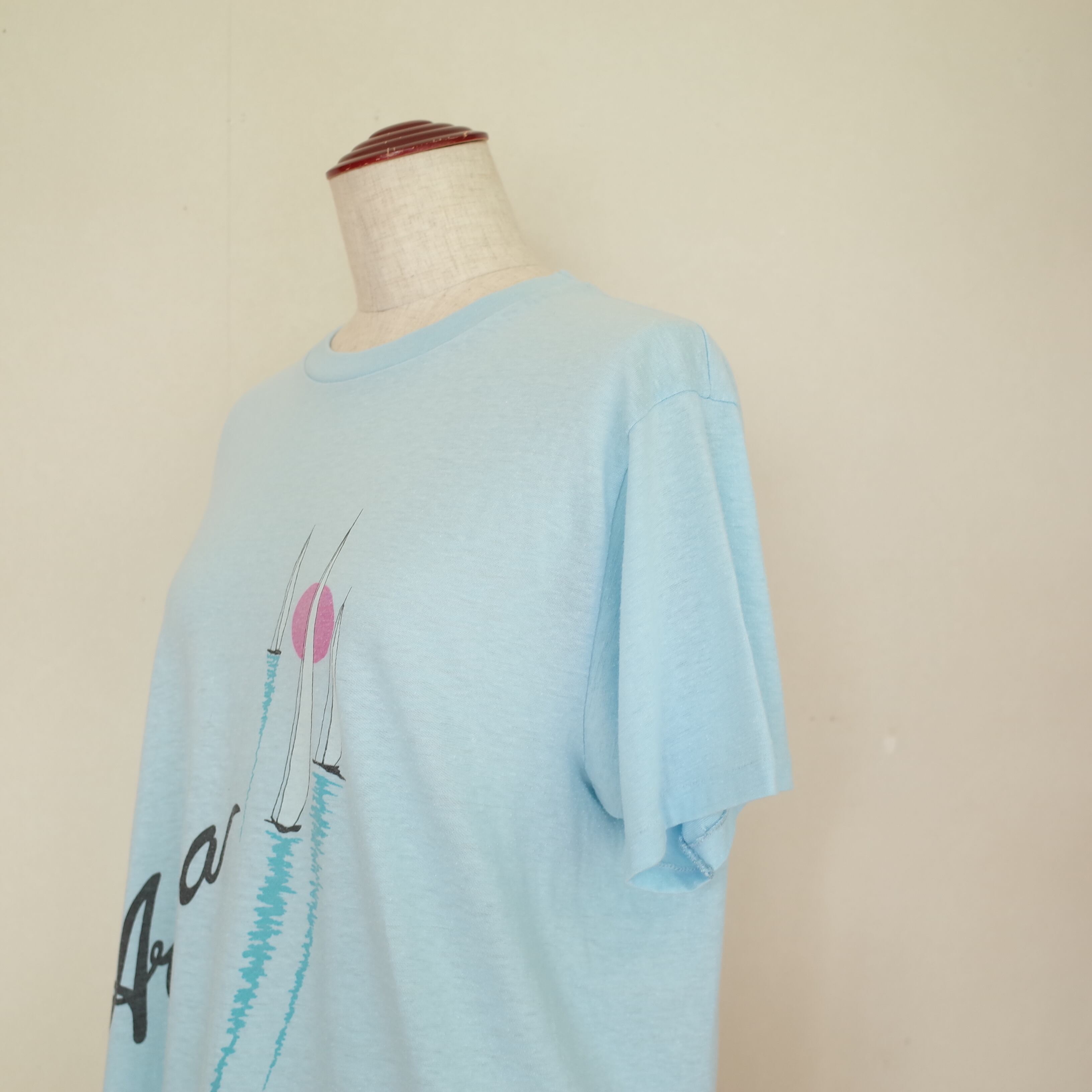 80年代アメリカ製アルバのスーベニアTシャツ。アルバは西インド諸島の南端部、南米ベネズエラの北西沖に浮かぶ島です。着込まれてクタクタになった生地感、プリントも染み込みプリントでとても雰囲気の良い一枚です。