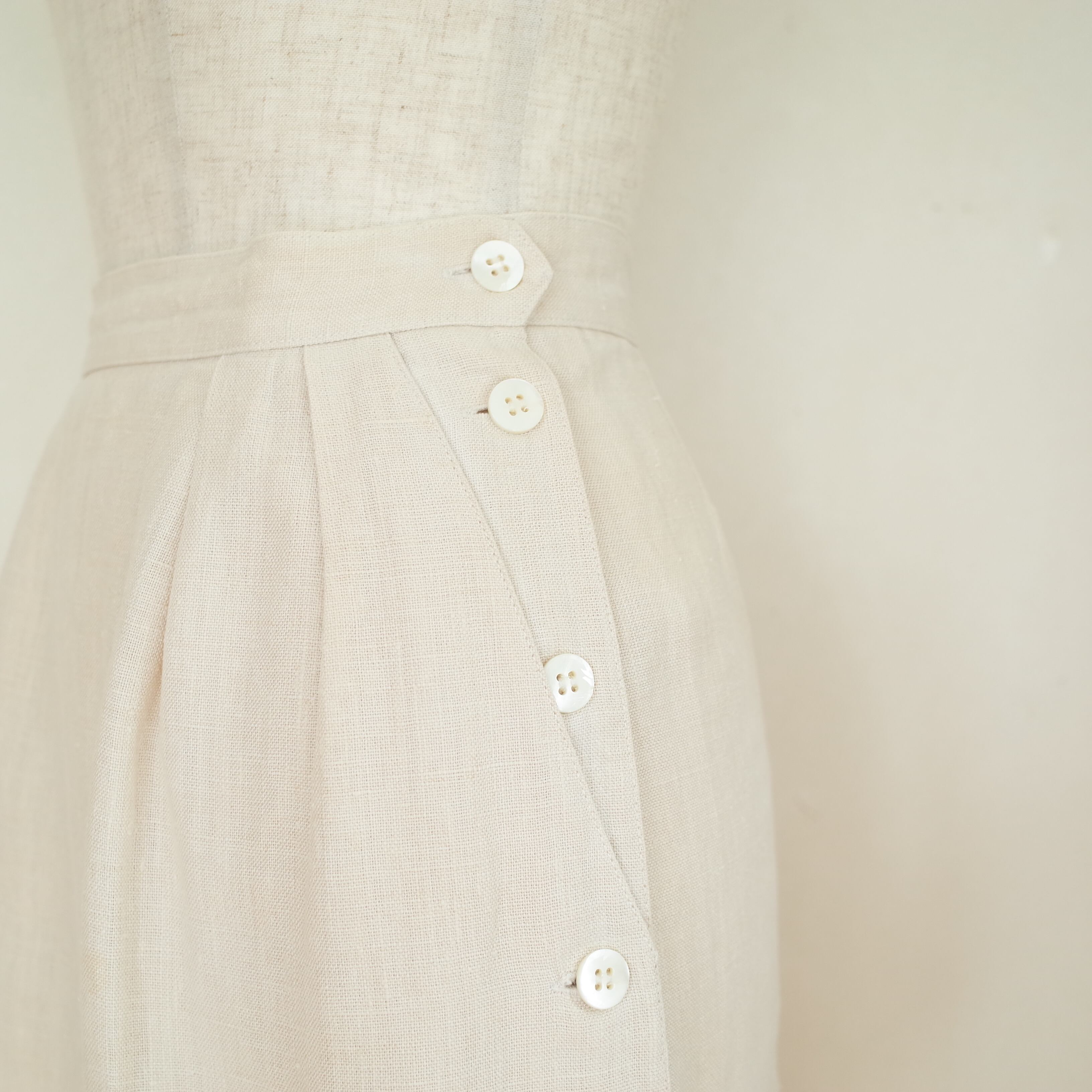 サイドがボタンになったリネン素材のスカート。これからの季節に活躍する膝下丈で、サイドのボタンでスリットの調節が可能です。デニムなどのボトムとレイヤーしても◎涼しくて、使い勝手のいい一枚です。裏地なし。
