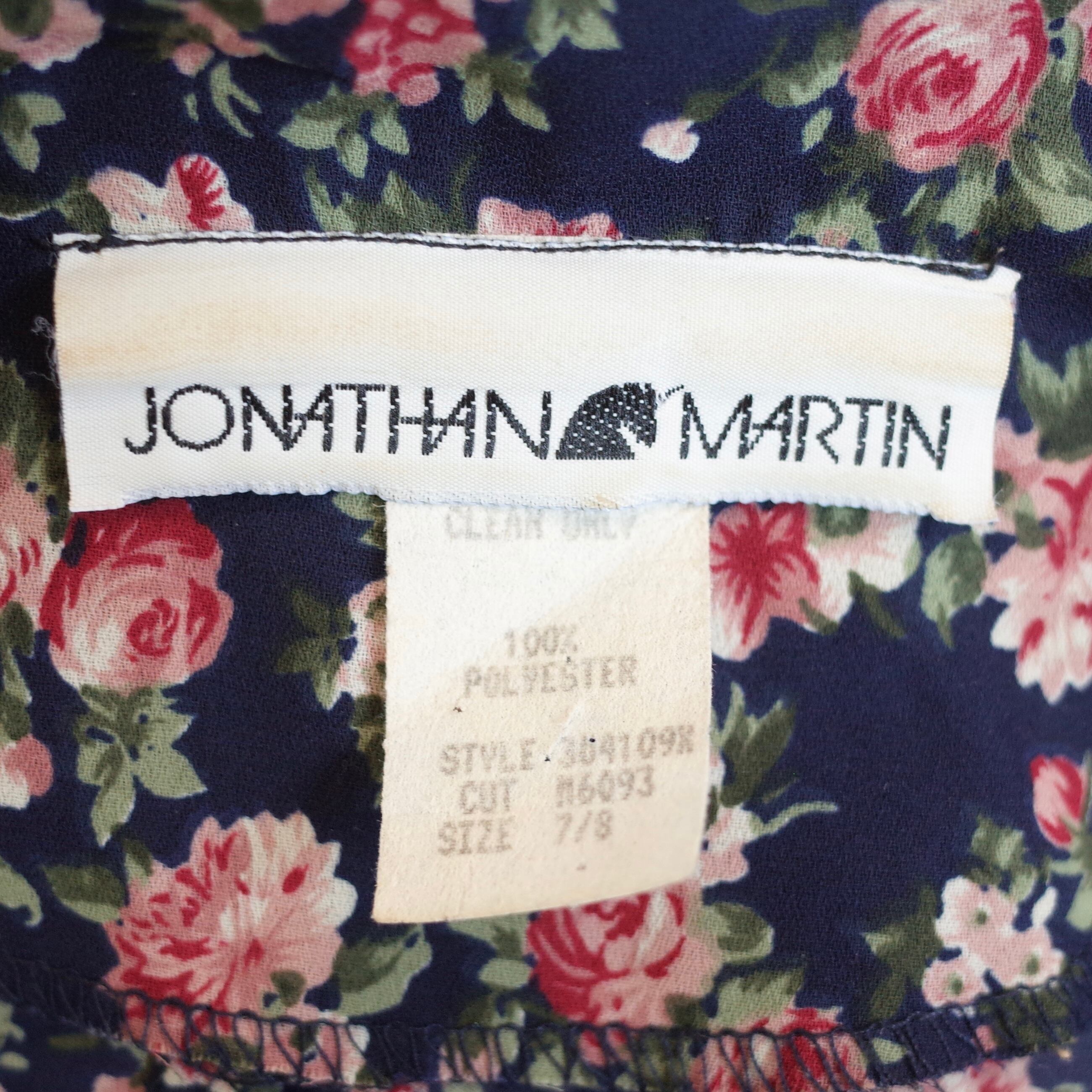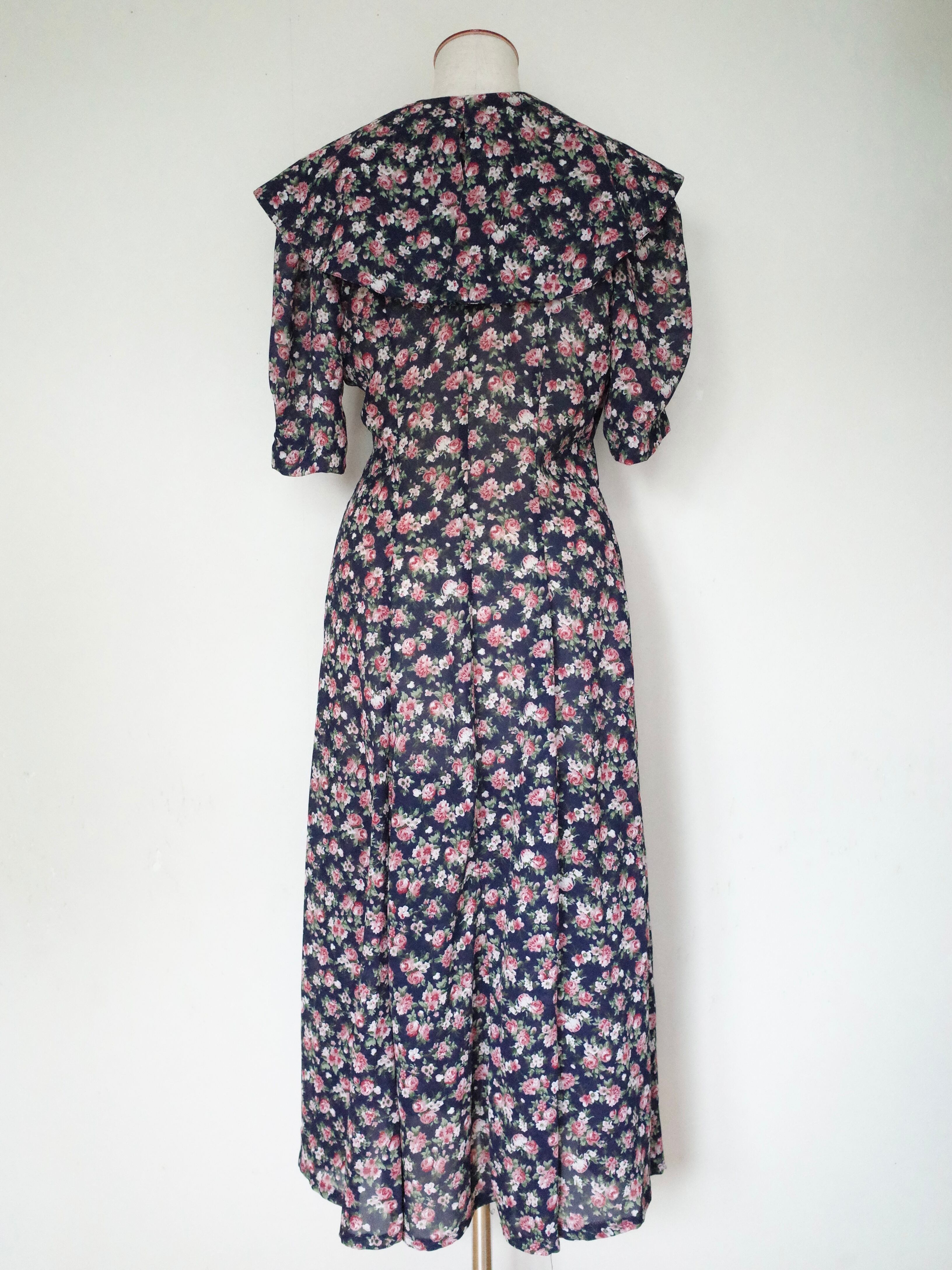 1980〜90年代アメリカ製のフラワープリントのマキシ丈ワンピース。5分丈の袖に、ウエストが少しシェイプされた綺麗なシルエットです。セーラーのように大きく付けられた襟がかわいい一枚。軽くて、薄ら透け感のあるシフォン素材です。前あきなので、インナーとボトムの上から羽織るスタイリングもおすすめです。