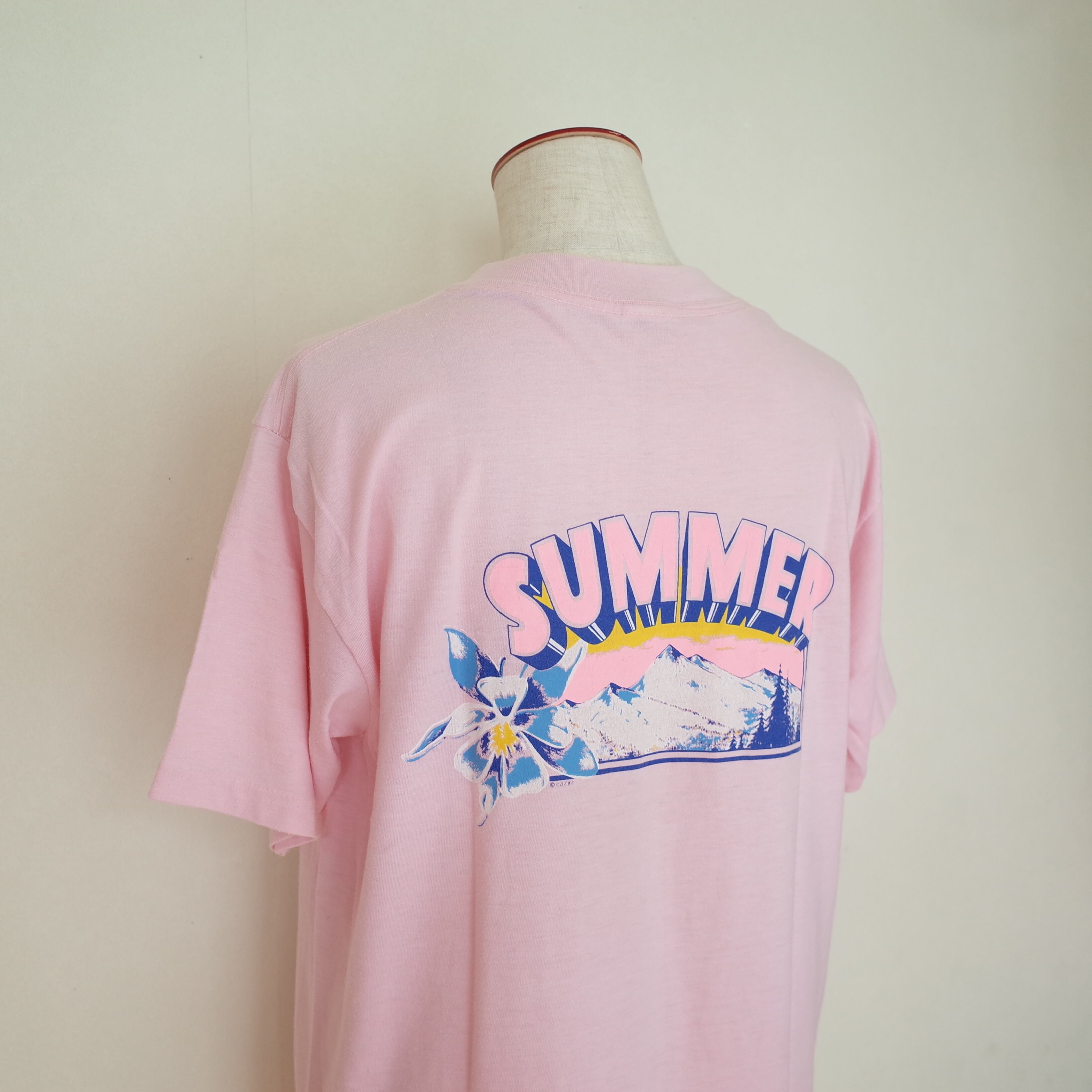 80年代アメリカ製両面プリントのTシャツ。フロントはシンプルなテキストプリントで、バックはSUMMERと描かれた目を惹くプリント。極端な雰囲気がたまらない一枚。ユニセックスで着用可能なサイズ感です。