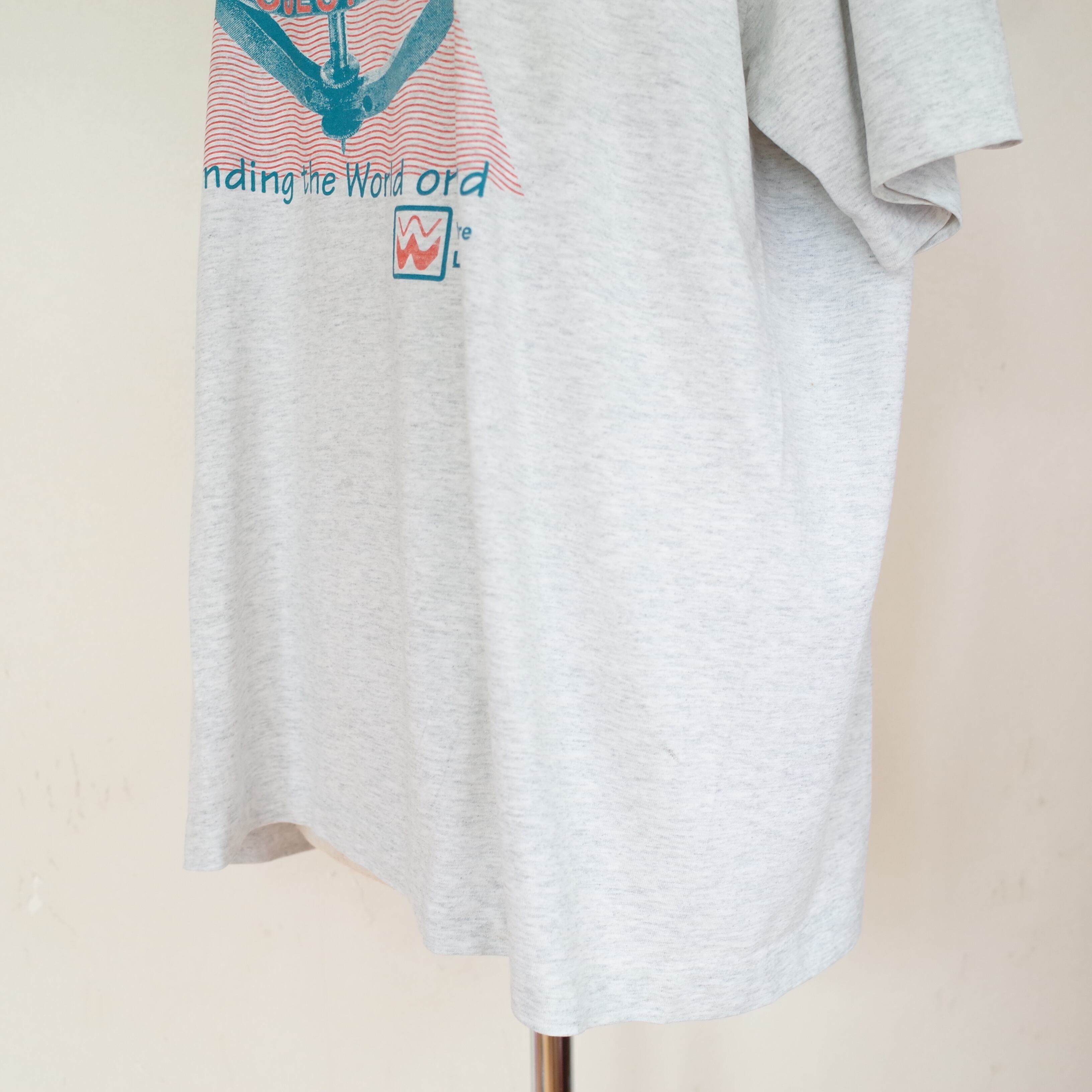 90年代アメリカ製ジャイロスコープがプリントされたTシャツ。ボディはFRUIT OF THE LOOMです。アッシュグレーのボディにエメラルドグリーンとオレンジ配色のプリントがGOODな一枚。ユニセックスで着用頂けるサイズ感です。