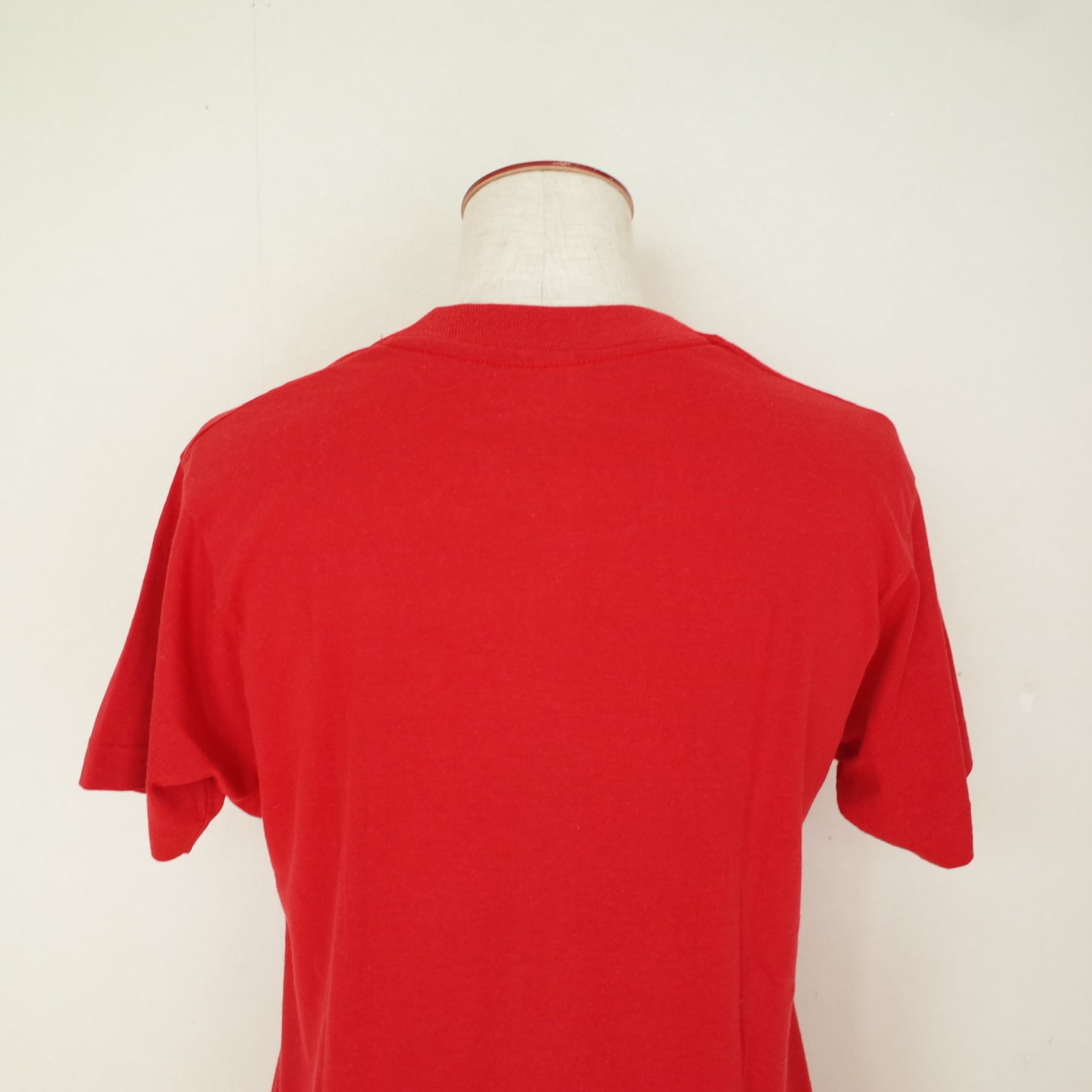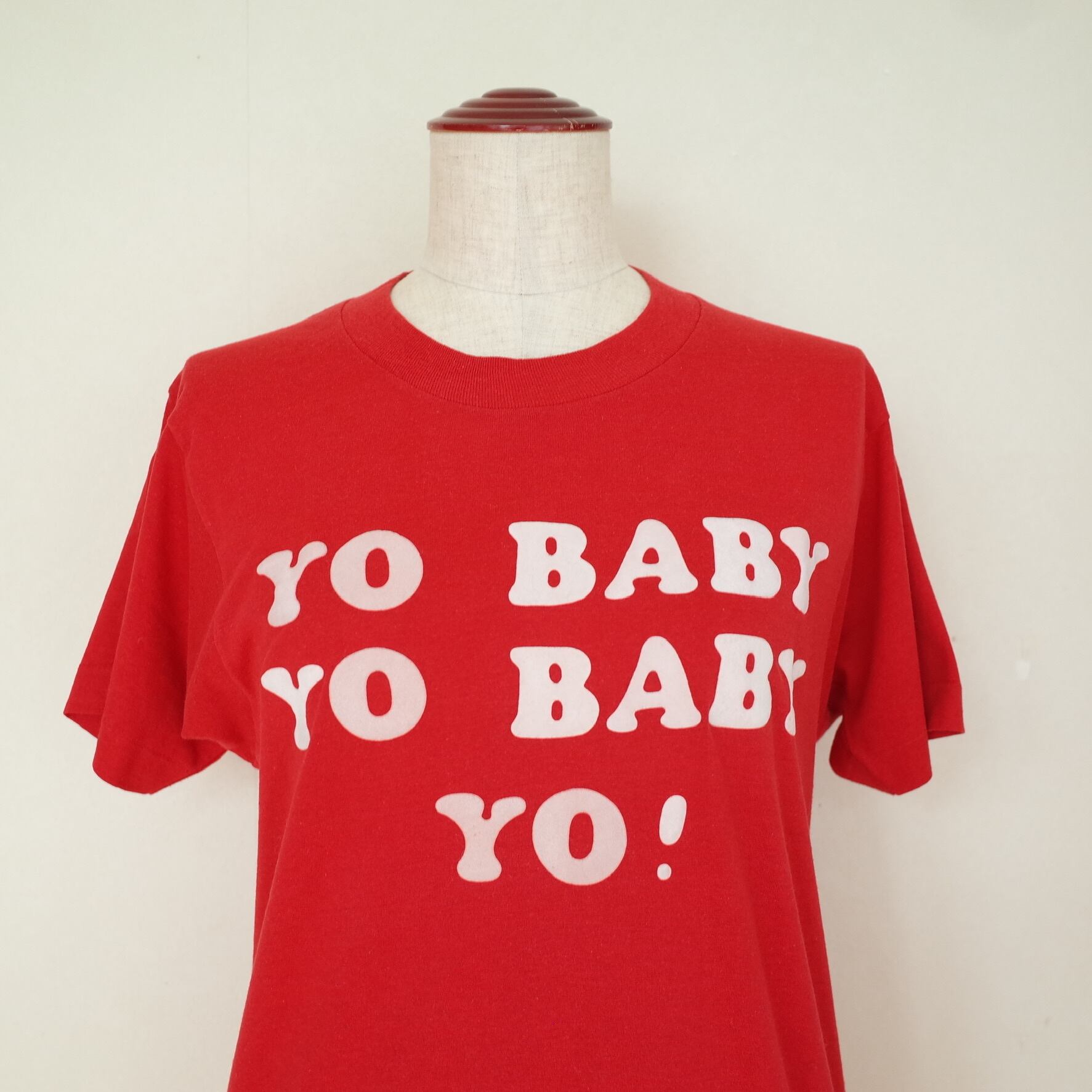80年代アメリカ製フロッキープリントのTシャツ。ボディはSCREEN STARSです。フェルトを貼り付けたようなシンプルなテキストのフロッキープリントがたまらない一枚。ユニセックスで着用頂けるサイズ感です。