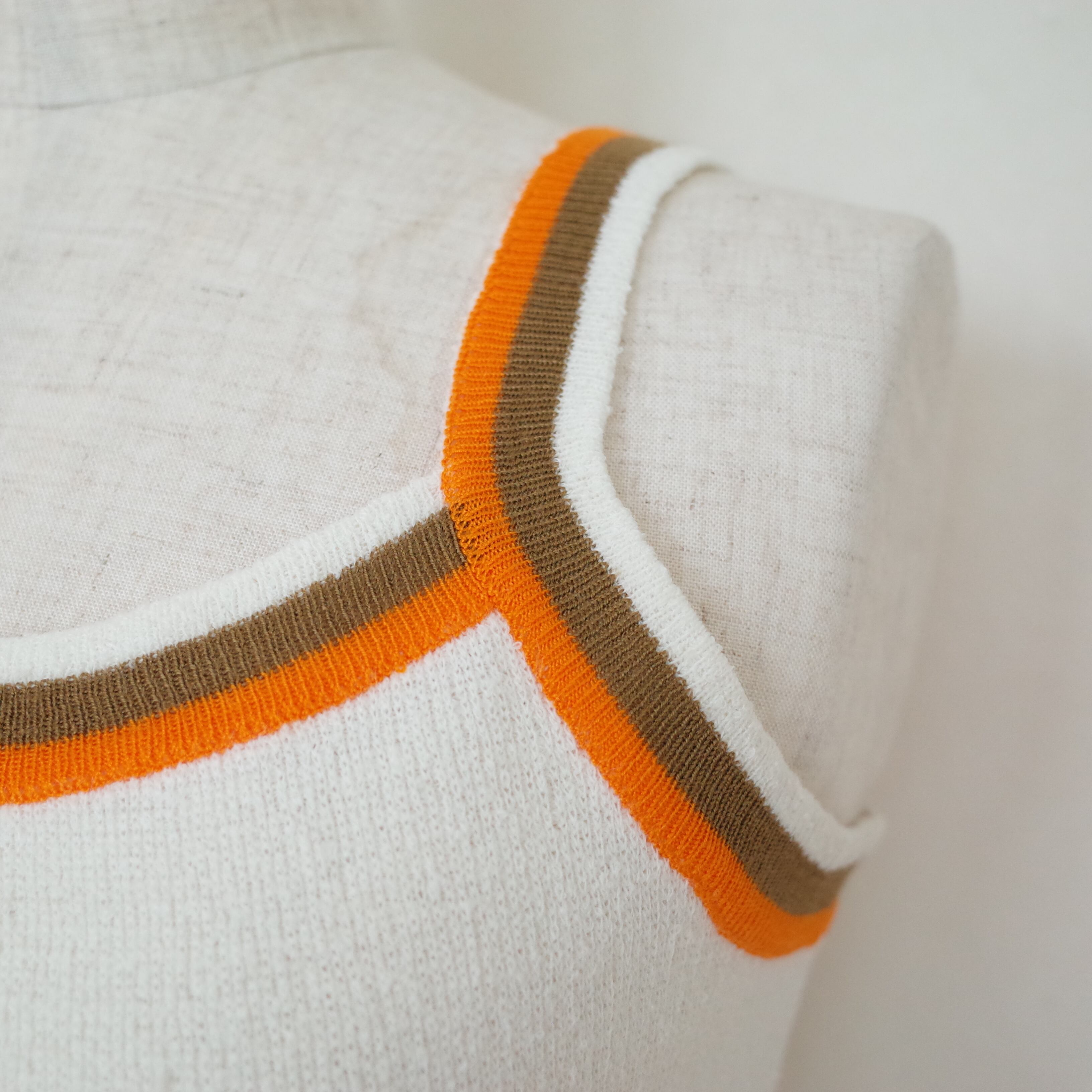 ブラウンとオレンジのラインがかわいいニット素材のキャミソール。アクリル100%なので、夏でもサラッと着用可能◎開襟シャツのインナーとしてや一枚で着てもGOODです。丈が短めなので、ハイウエストのボトムと合わせてバランス良く着用頂けます。