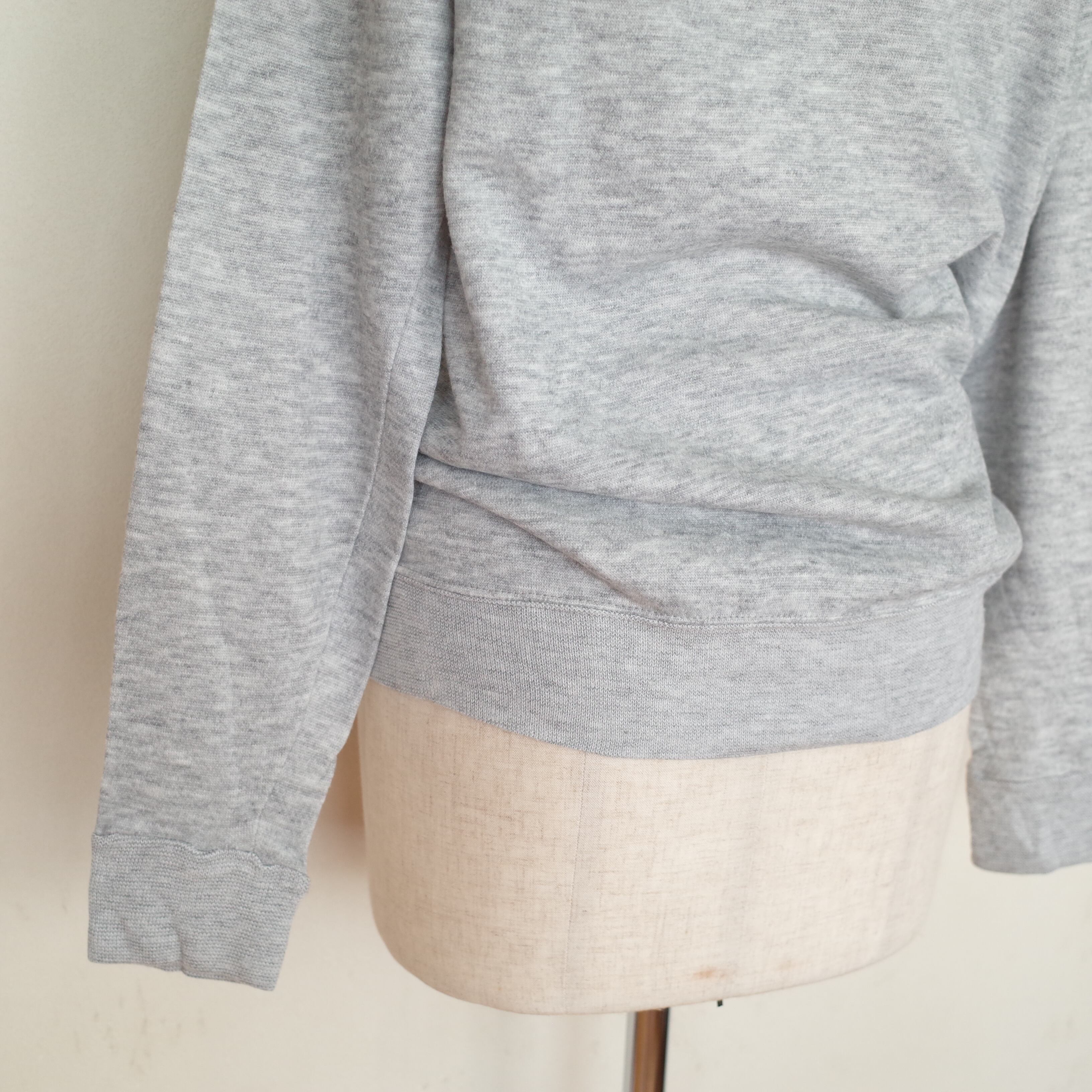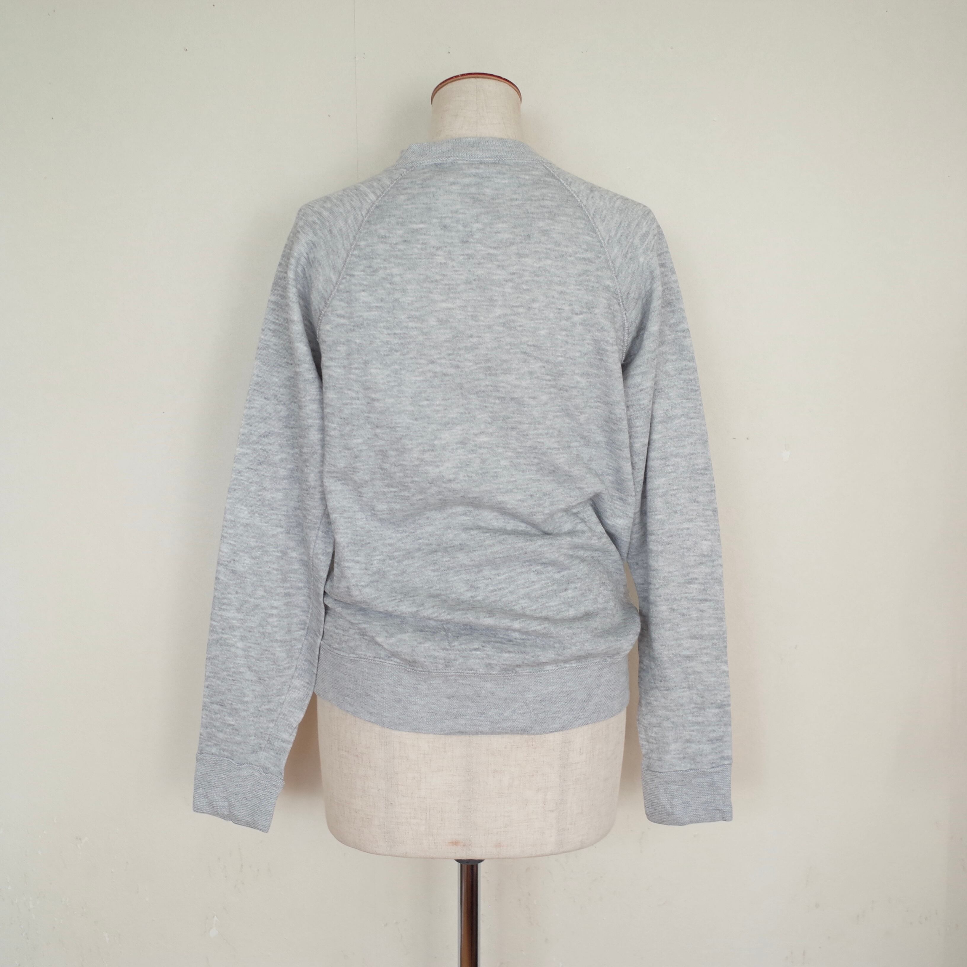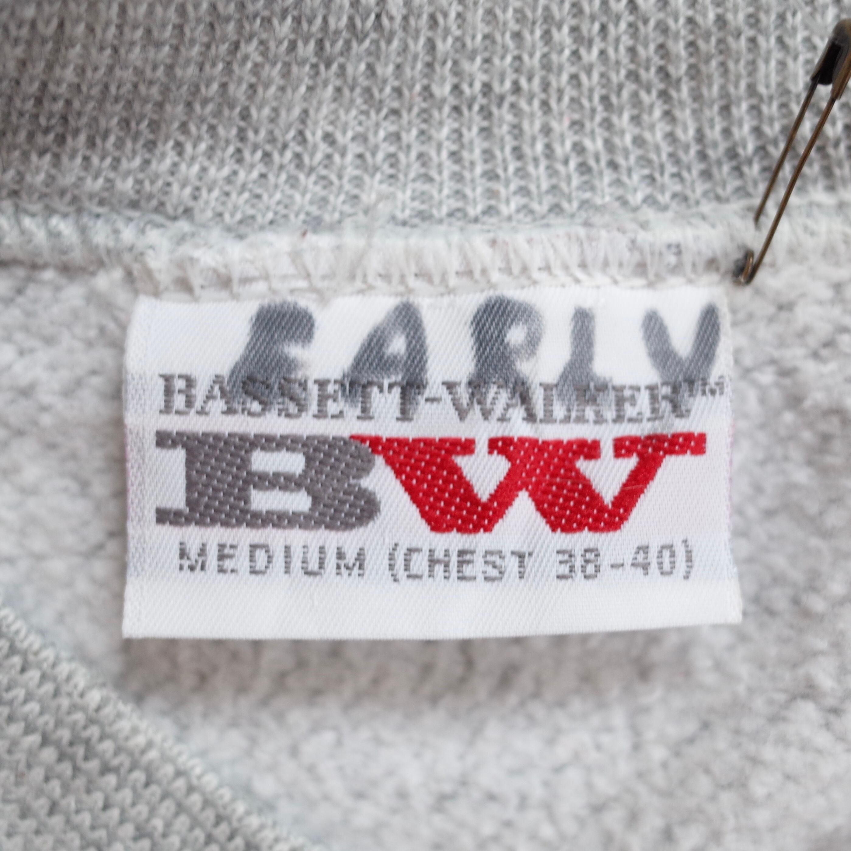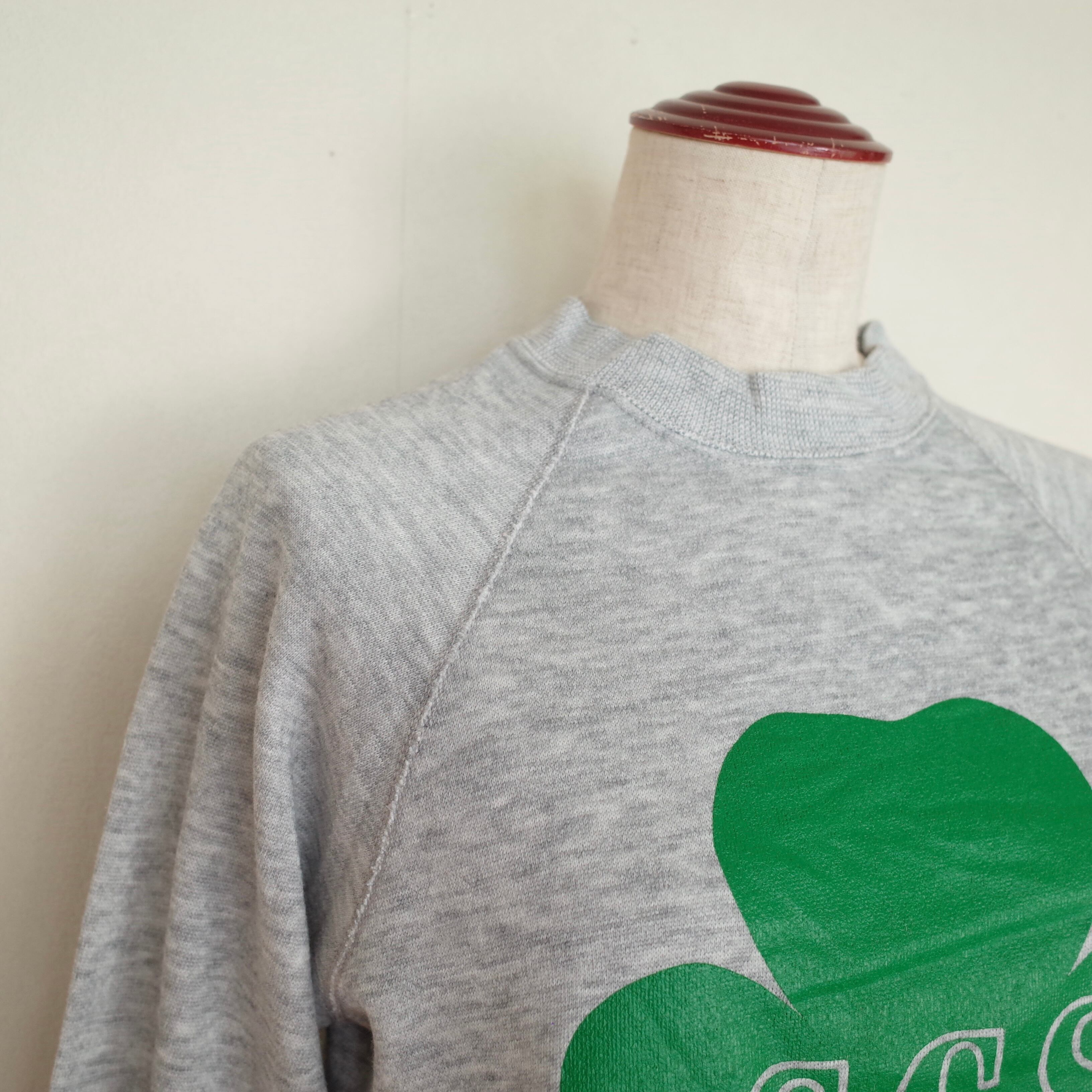 アメリカ製グリーンのクローバープリントが目を惹くスウェット。ボディはBASSETT WALKERです。杢感の良いライトグレーのカラーで、フィット感の良いラグランスリーブ。アクリル×コットン×ポリエステルの混紡素材で肌馴染みの良い柔らかな質感。古着ならではの風合いも魅力的です。一枚での着用はもちろんのこと、インナーとしても最適なサイズ感で、幅広く着回しの効くアイテムです。