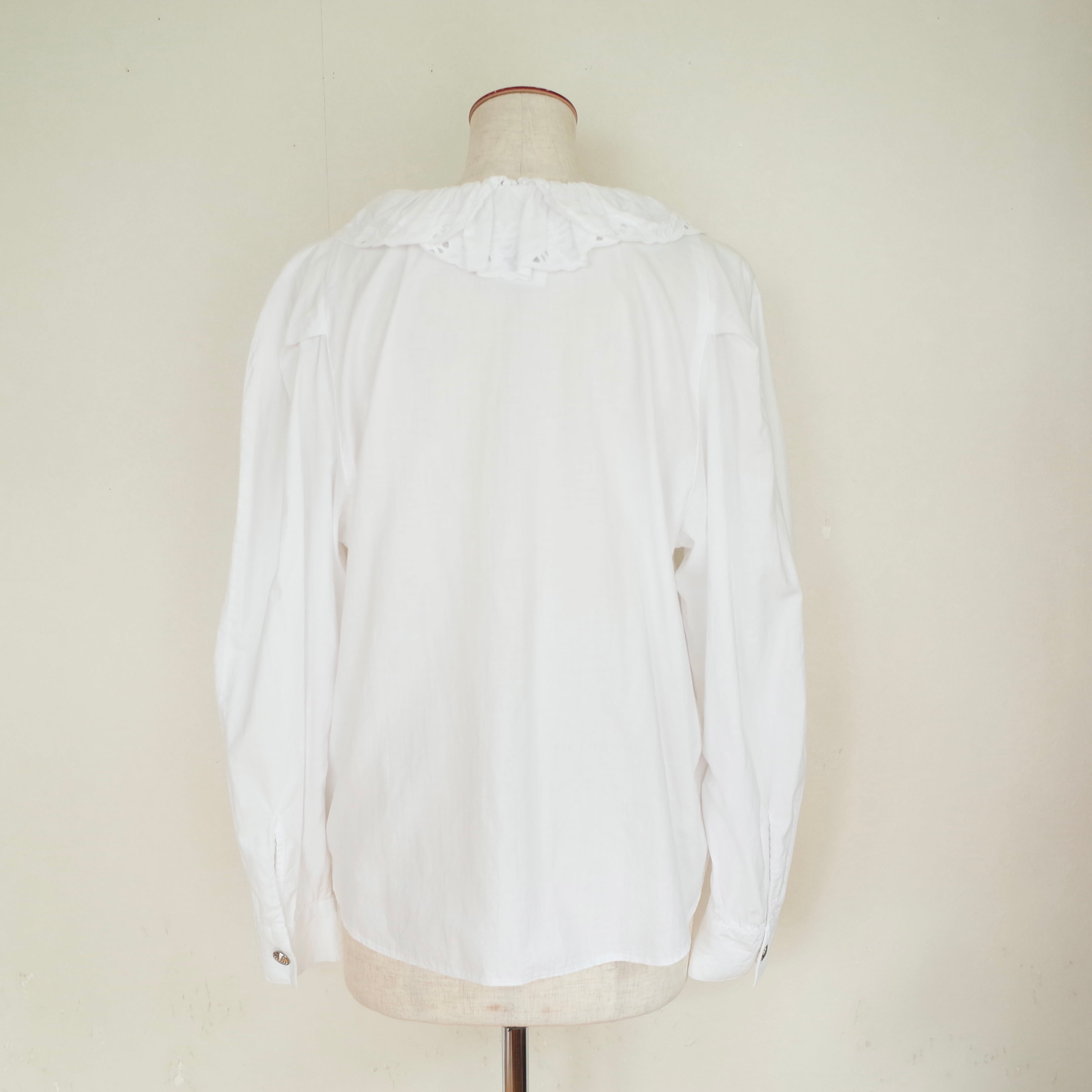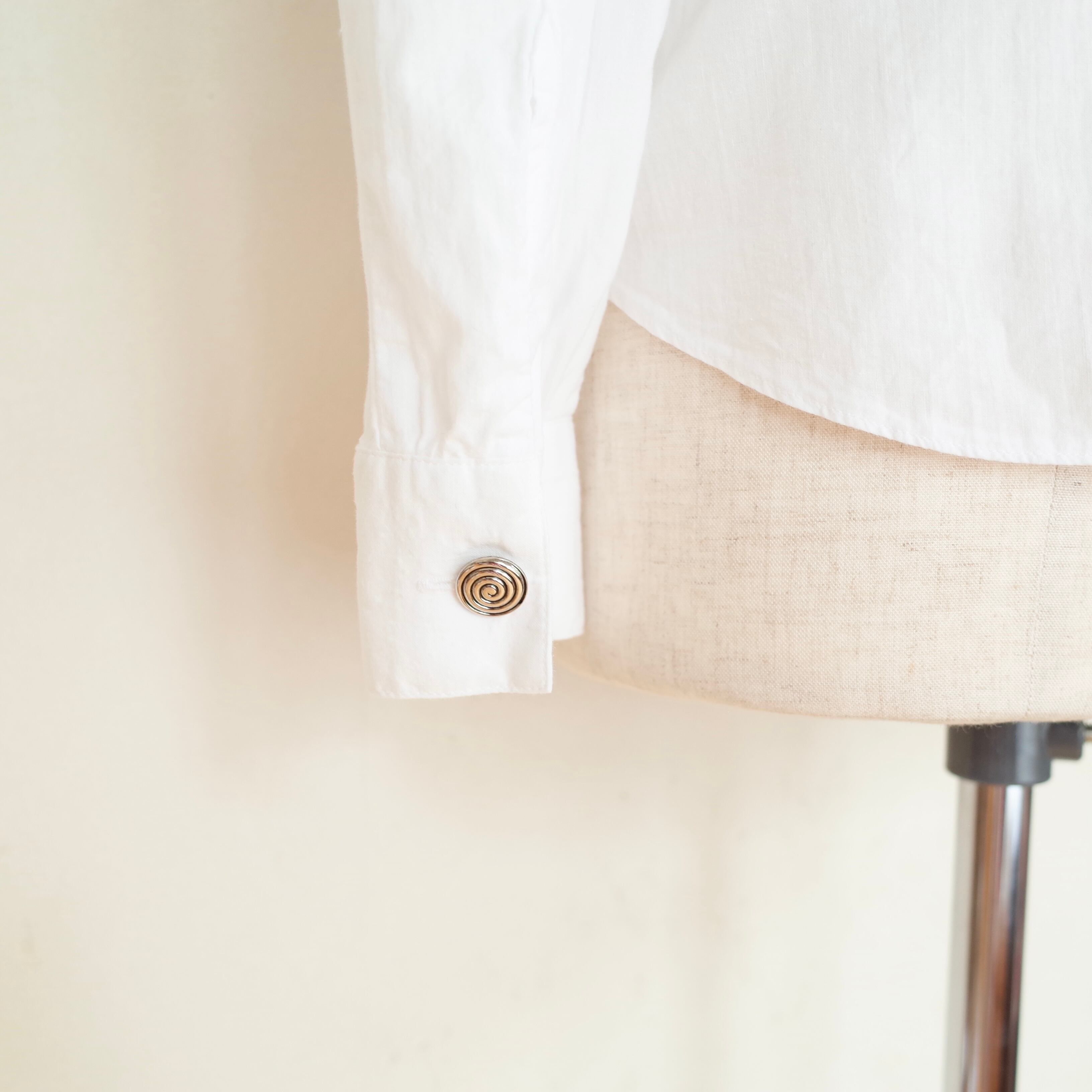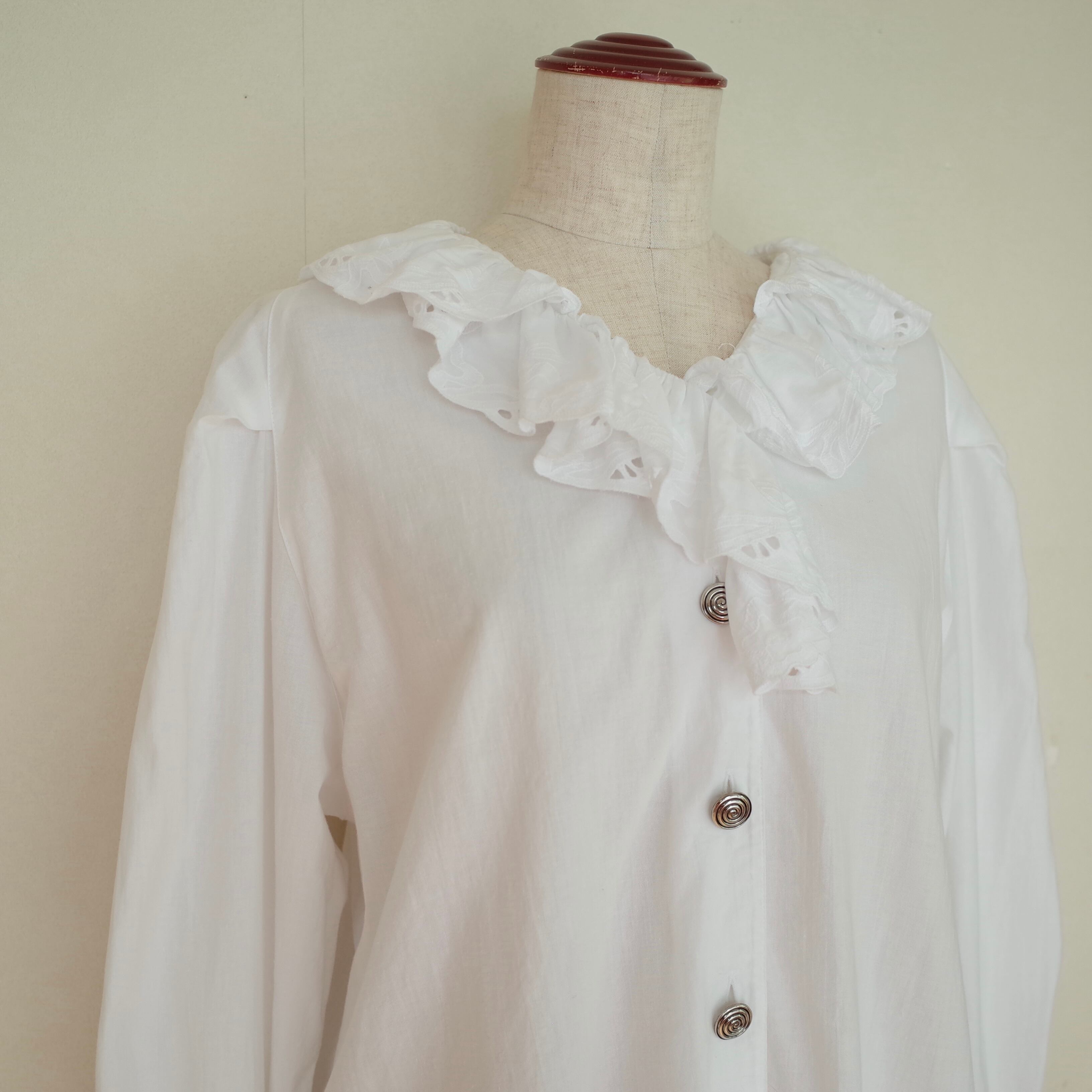 ドイツ製のコットンレースブラウス。シルバーの渦巻きボタンがアクセントになった一枚です。シャツのようにカットソーの上に羽織れるデザインなのも◎これからの季節は、スウェットやニットとレイヤーして襟元のレースを出したスタイルもおすすめ。幅広いコーディネートをお楽しみ頂けるアイテムです。