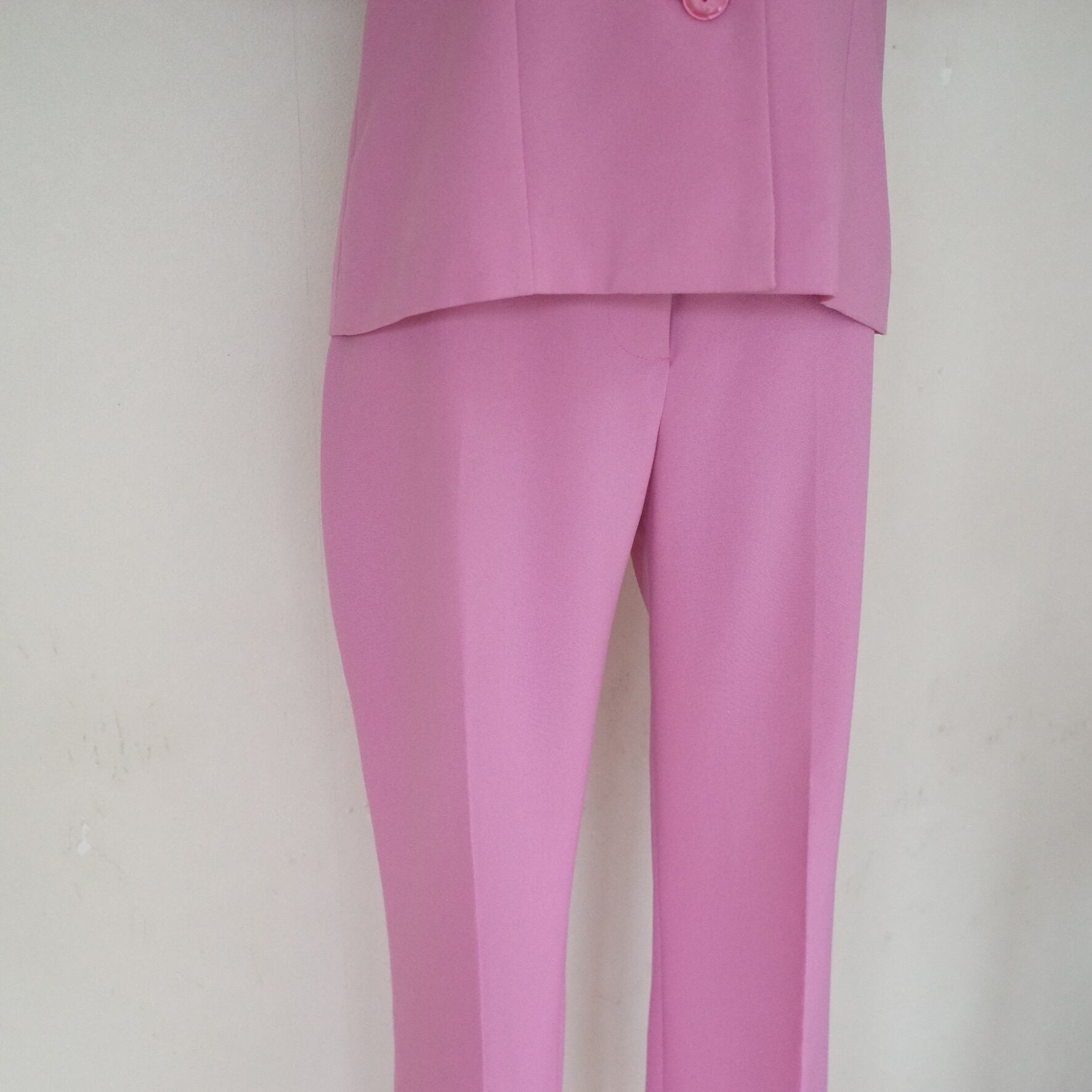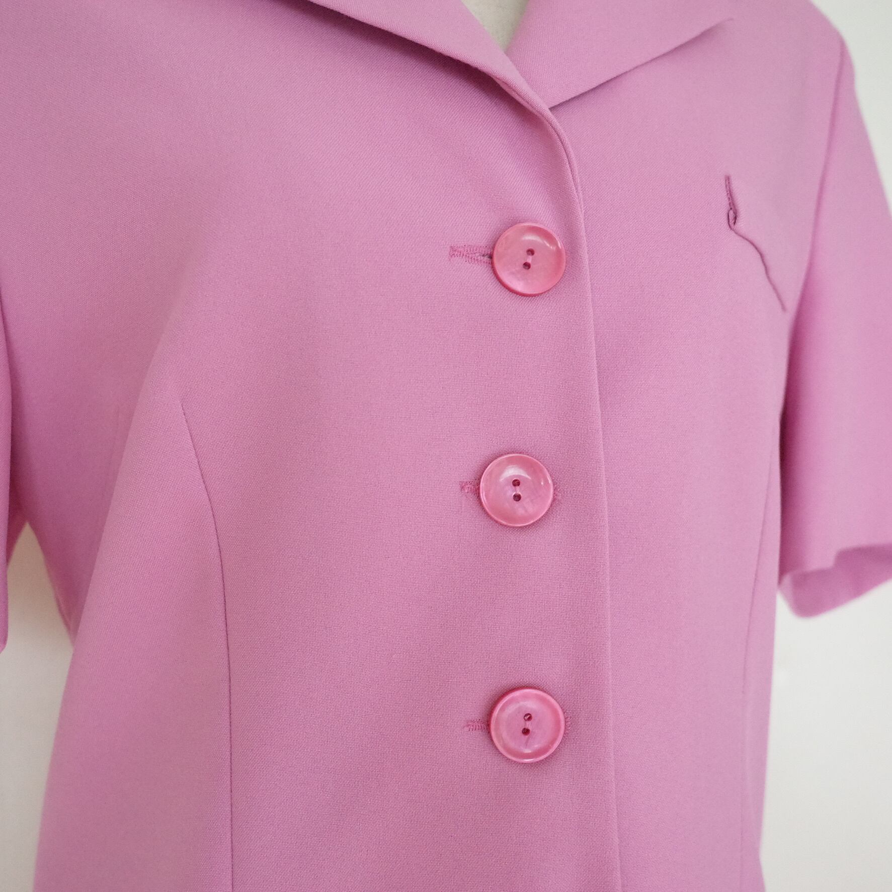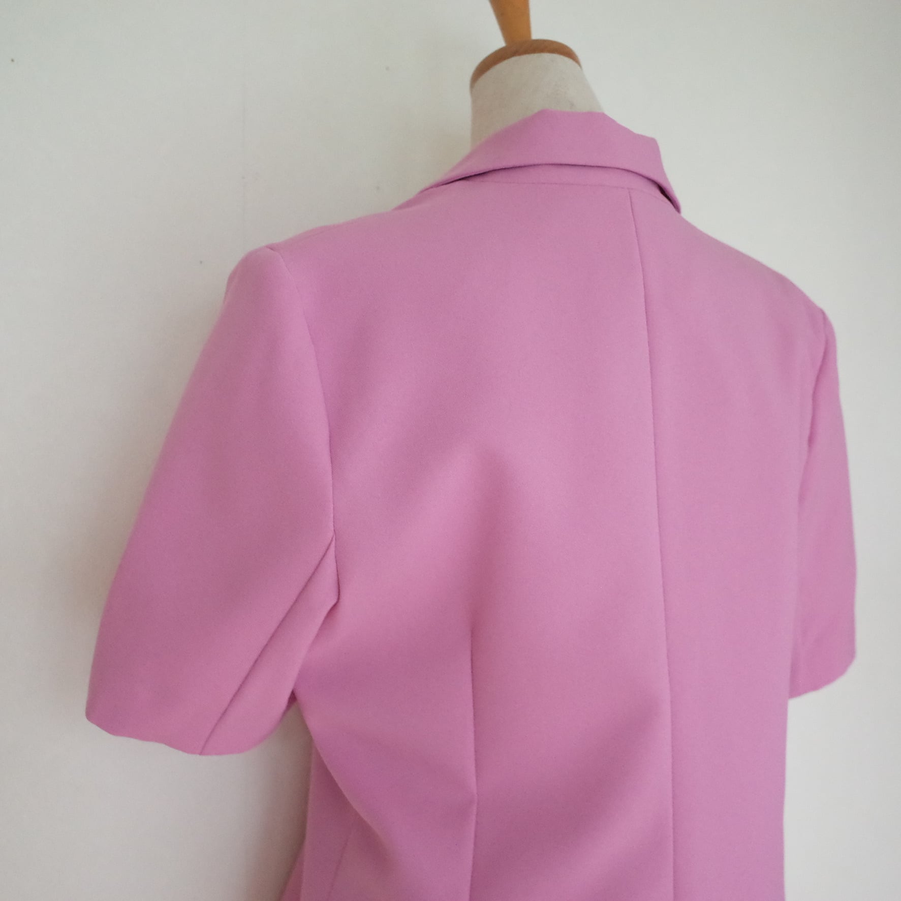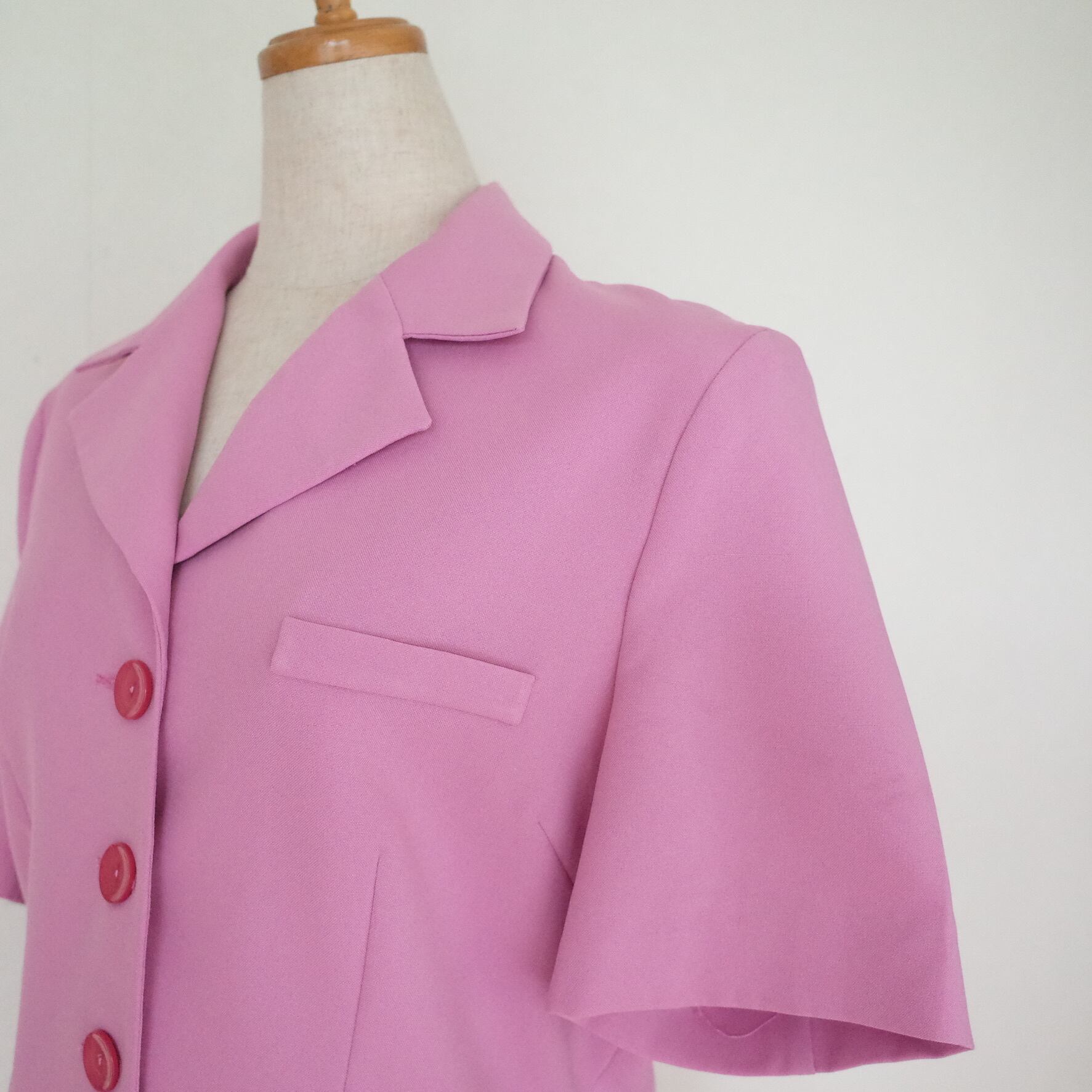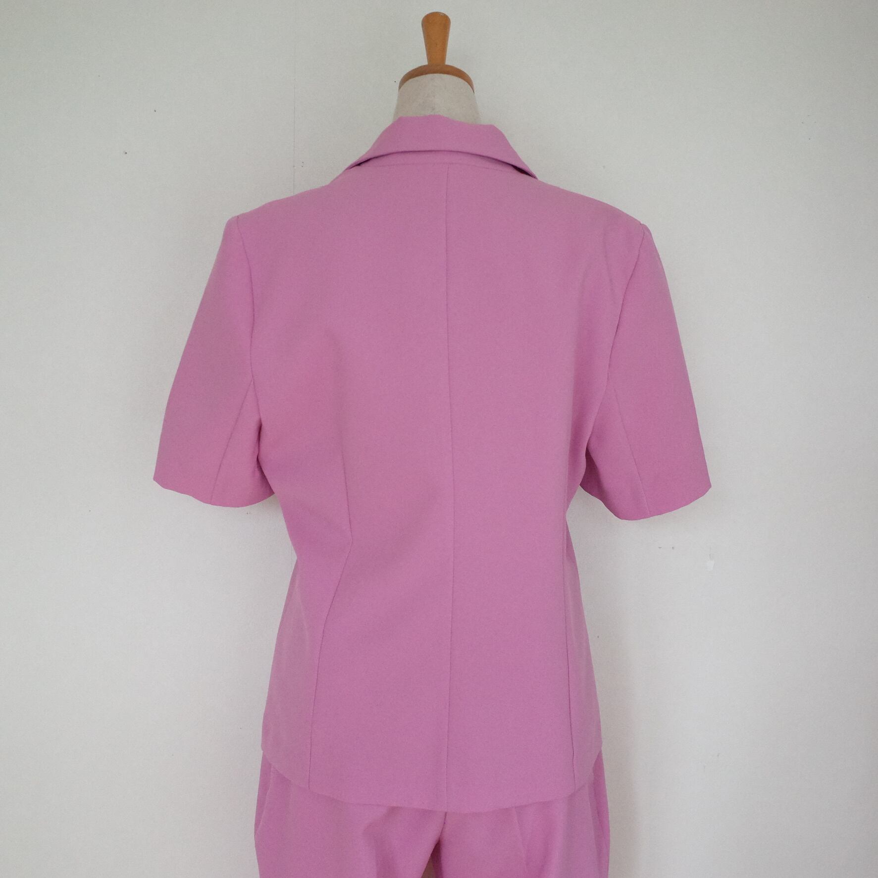 今っぽいピンクカラーが魅力的なショートスリーブのジャケット&パンツのセットアップ。シワになりにくいポリエステル素材で、ご自宅で簡単にお手入れが可能です◎上下バラバラにスタイリングしてもいいので、ワードローブにぜひ加えておきたいアイテムです。