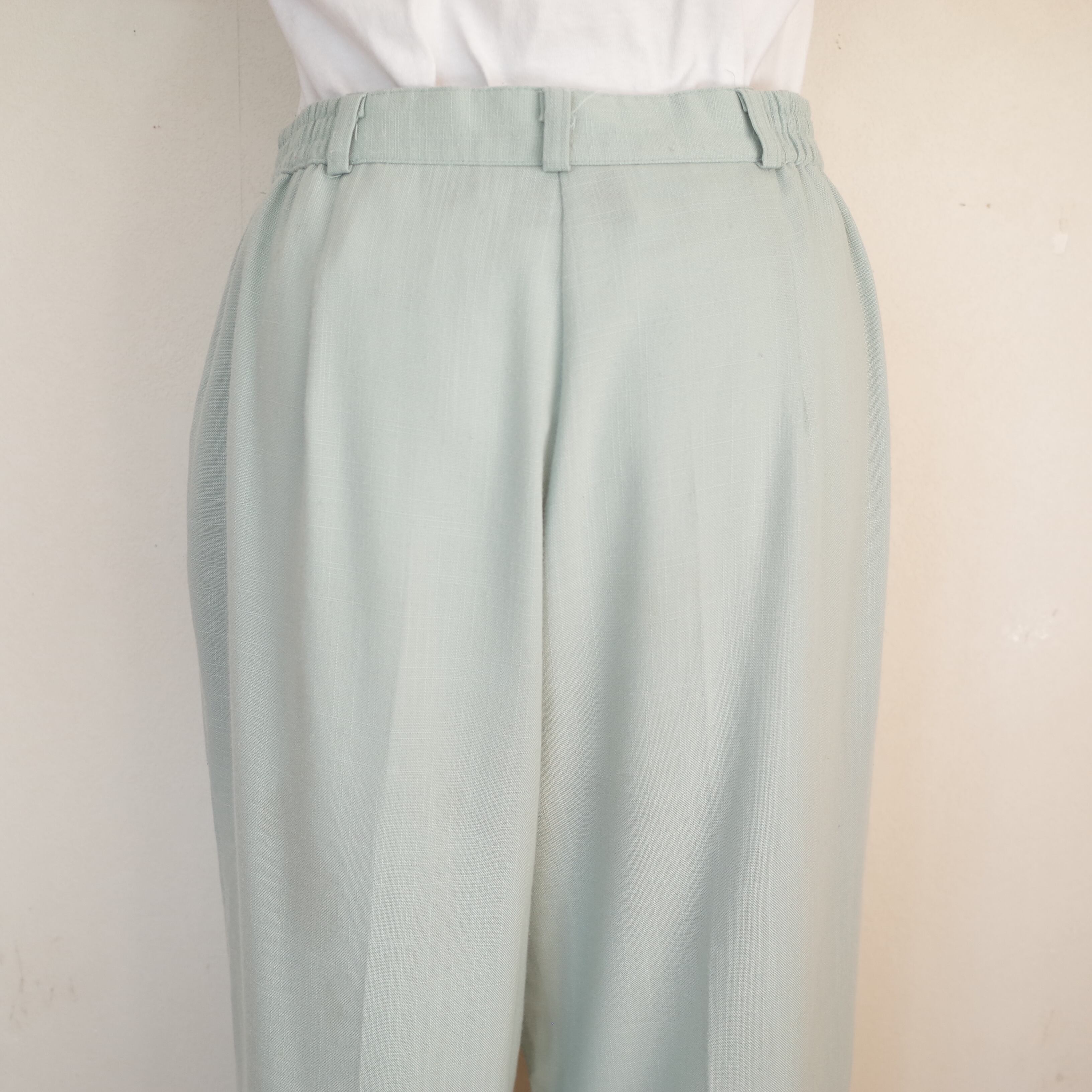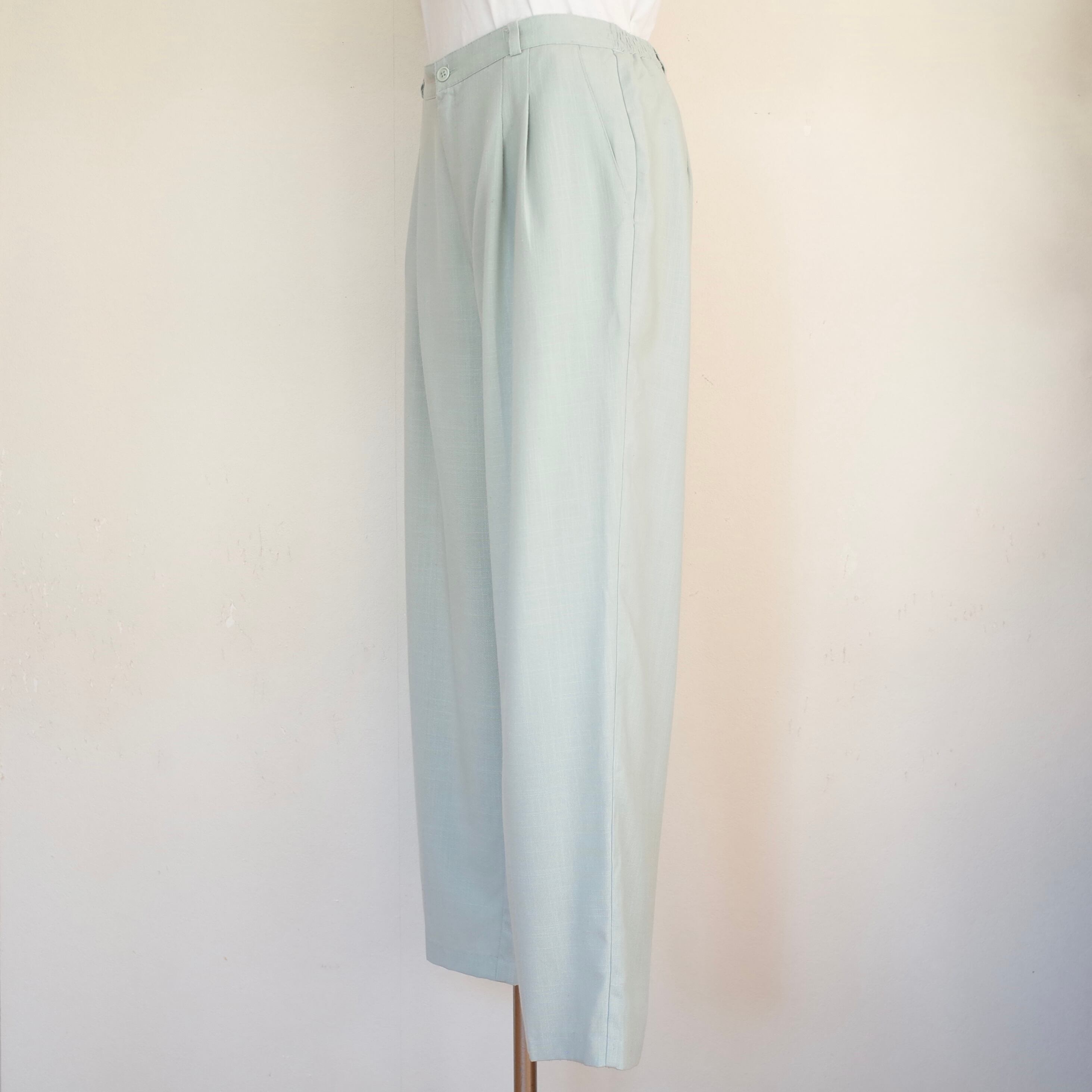 アメリカ製BRIGGSのタックの入ったスラックスパンツ。ウエストにはゴムも使われているので楽ちんですが、ちゃんとして見えるシルエットのキレイなパンツです。カジュアルから綺麗目まで、幅広いスタイリングに取り入れて頂けます。アイスブルーのカラーも可愛い一枚です。