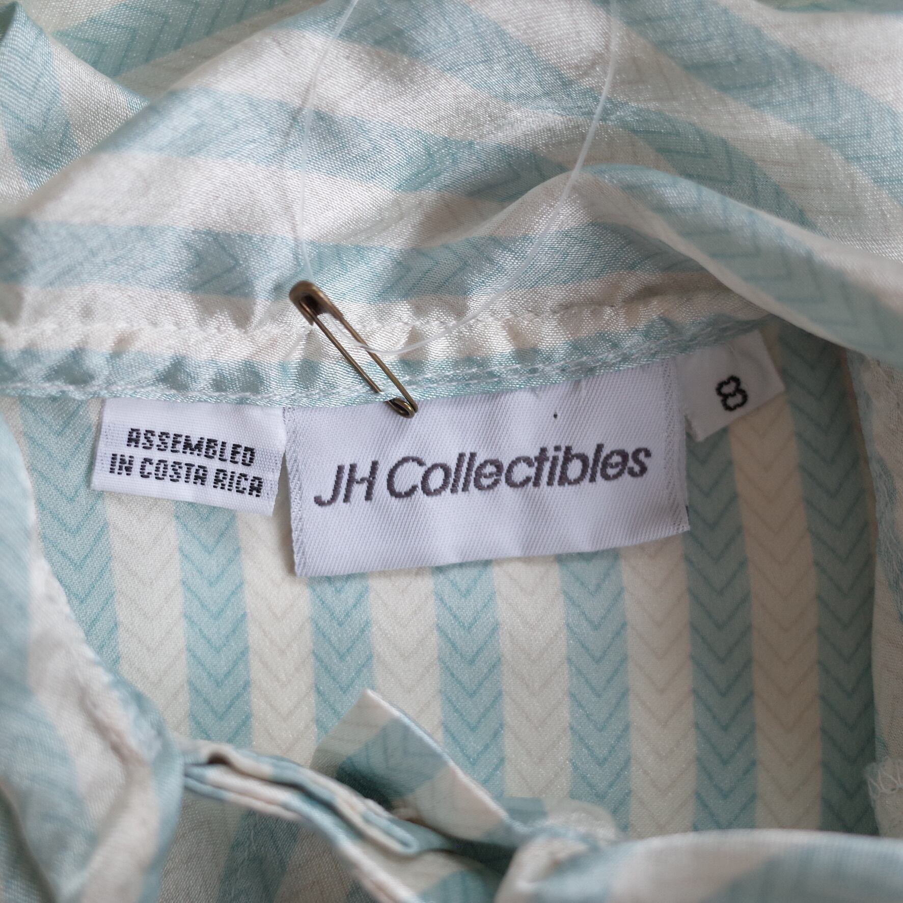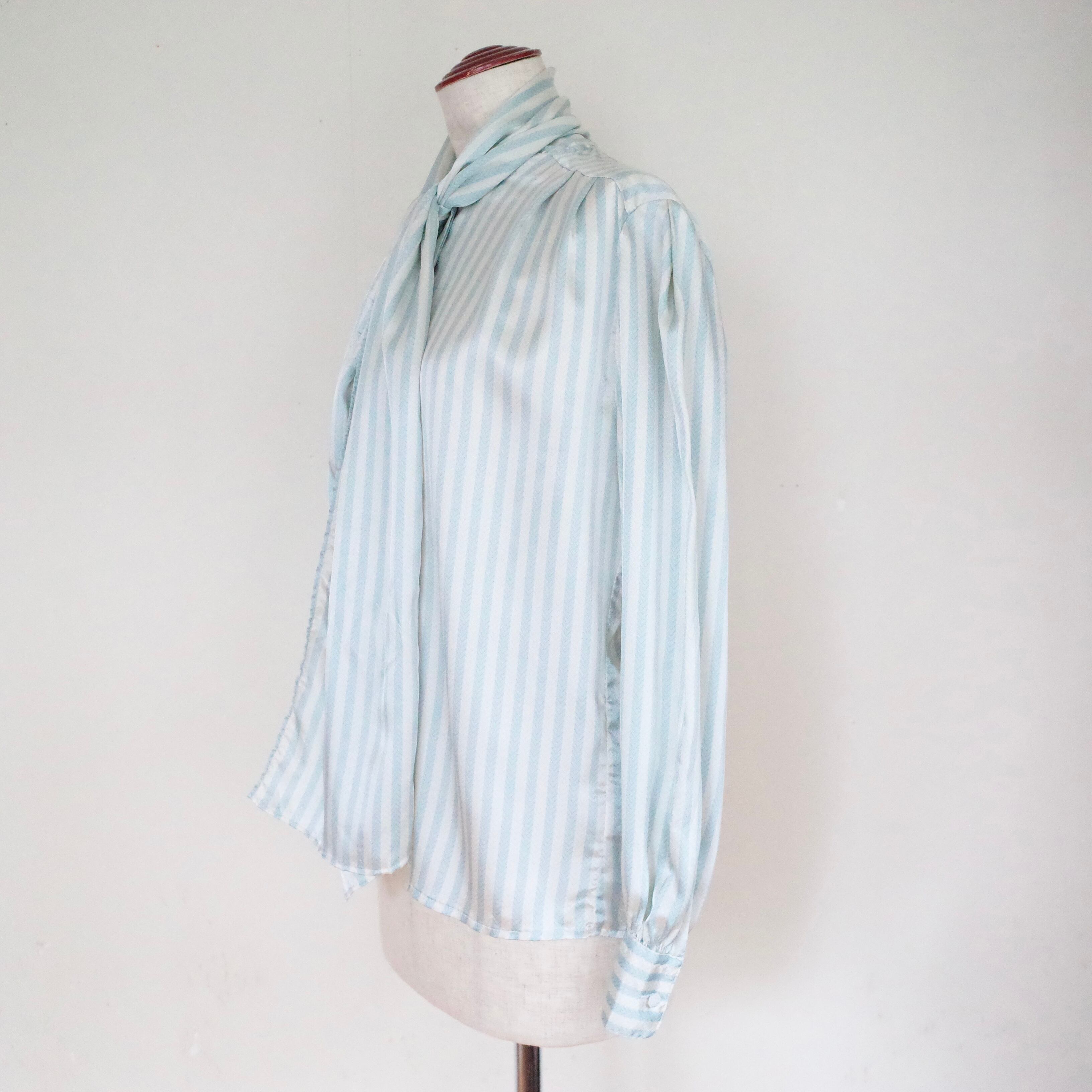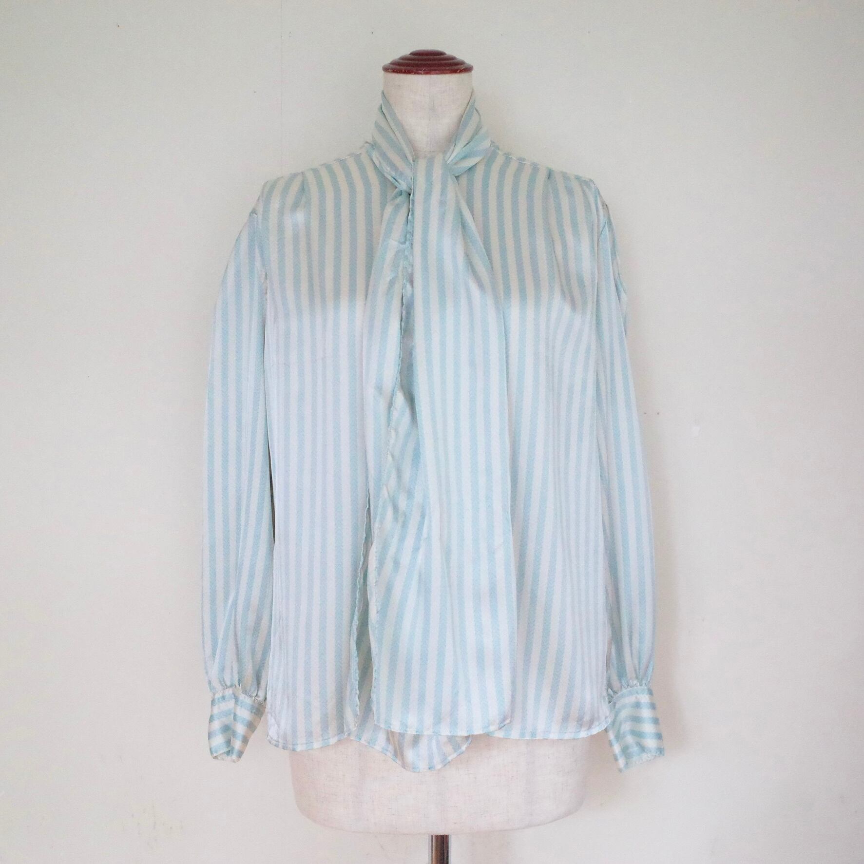 JH collectiblesのボウタイブラウス。光沢のある生地感に爽やかな配色のストライプが可愛い一枚です。ボウタイの結び方でガラッと印象の変わるブラウス。寒くなったらニットやカーディガンとレイヤーしたスタイリングもおすすめです。