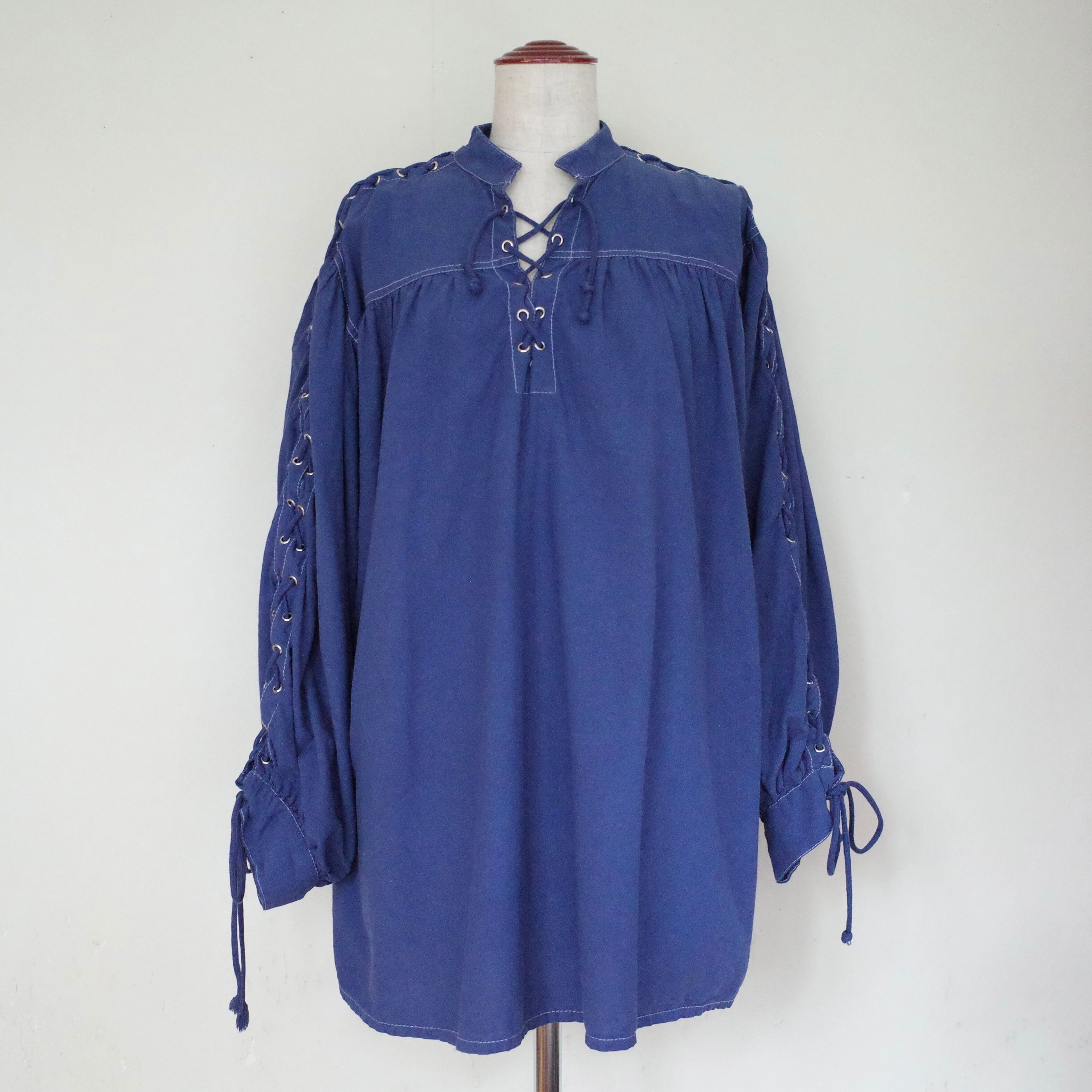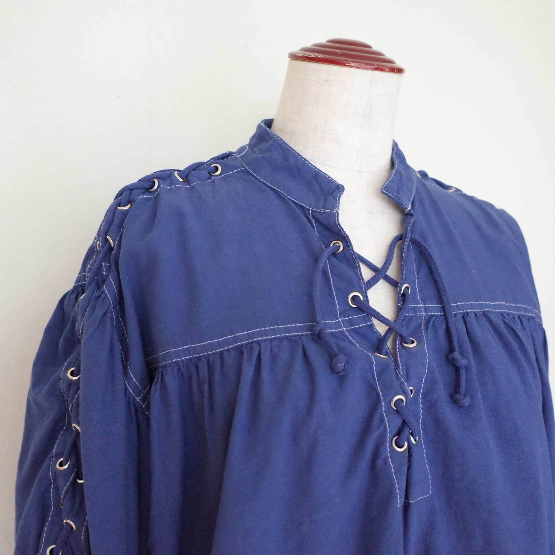 レースアップのスモック。後染めの雰囲気の良いネイビーカラーで、胸元と袖のレースアップのディテールがかわいい一枚です。オーバーオールと合わせても◎