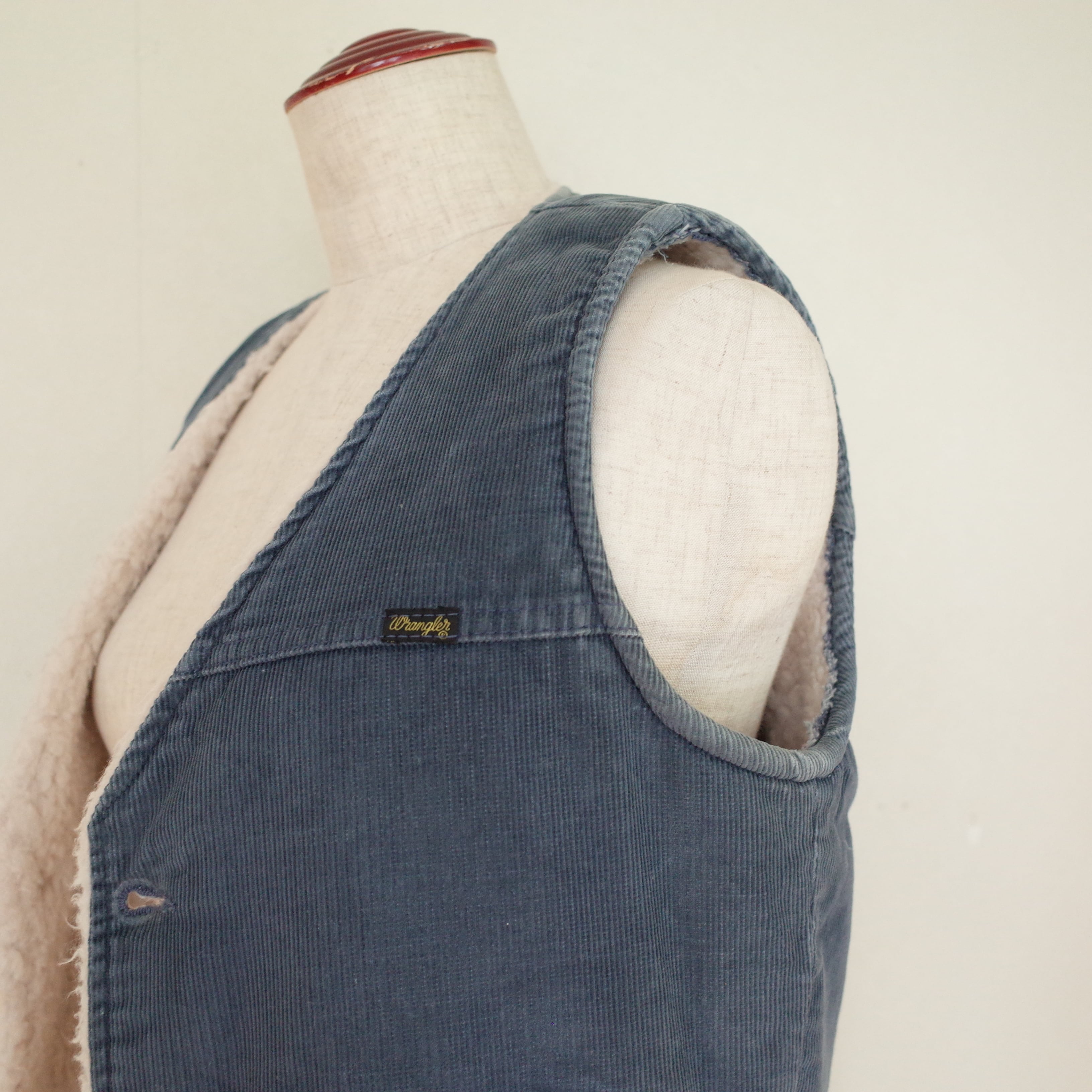 70年代製Wranglerのコーデュロイボアベスト。薄手のニットやスウェットと合わせたり、アウターやジャケットの下に忍ばせてもかわいい一枚。プラスするだけで雰囲気あるスタイリングに◎