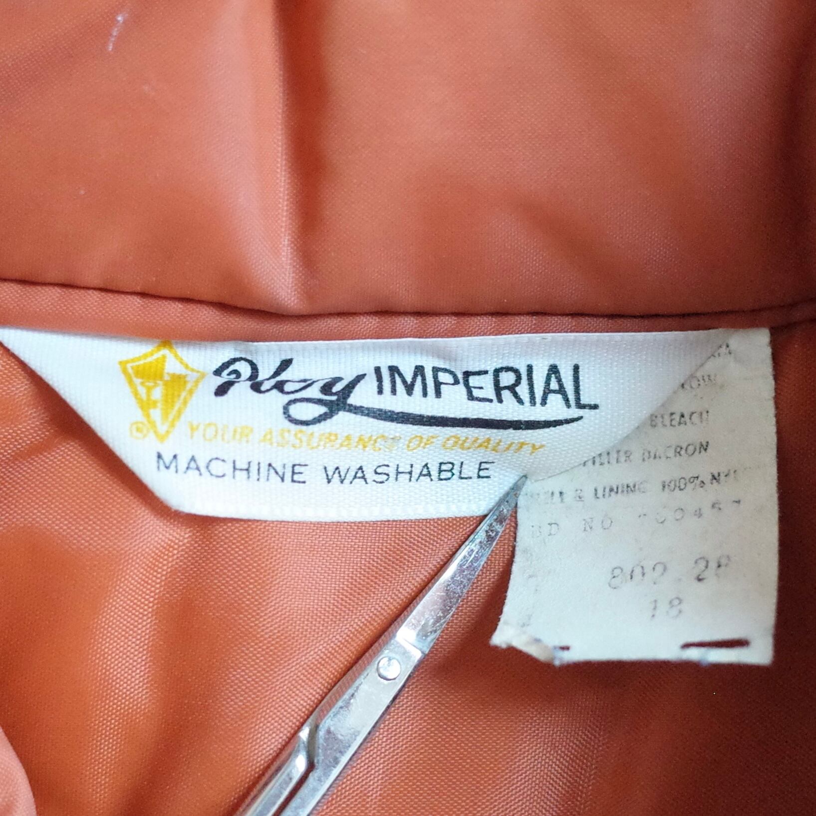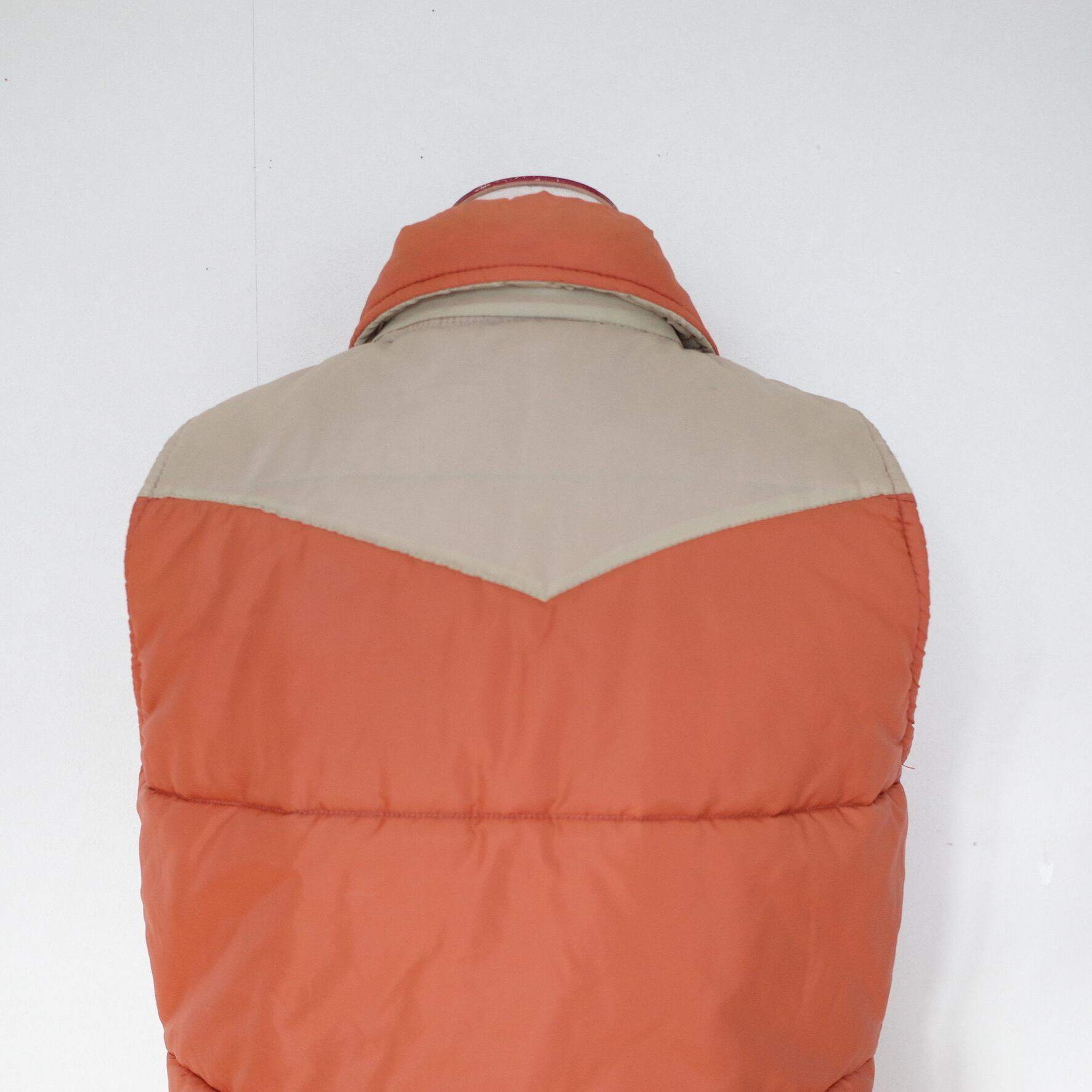 ベージュ×オレンジのダウンベスト。ニットやデニムジャケットの上に羽織ったり、コートの下にライナーのようにも着用出来るボリューム感。ヴィンテージの雰囲気あるダウンベストです。