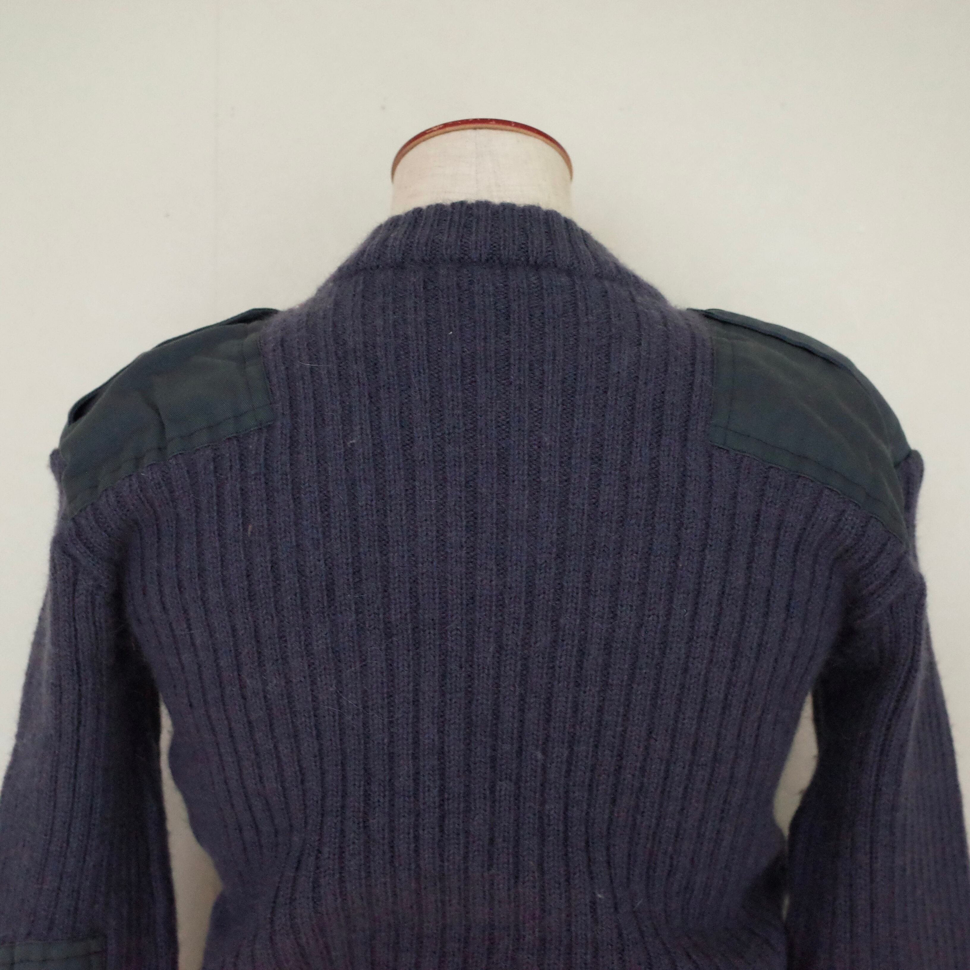 ミリタリーのコマンドセーターです。体にフィットするような太めのリブ。肘には補強のためのエルボーパッチが付いています。Vネックで、小さめサイズ。丈も長すぎず、バランスのいい一枚。機能性を重視した軍物ですが、ロングスカートやワイドパンツと合わせたコーディネートで可愛らしさをプラスしても◎