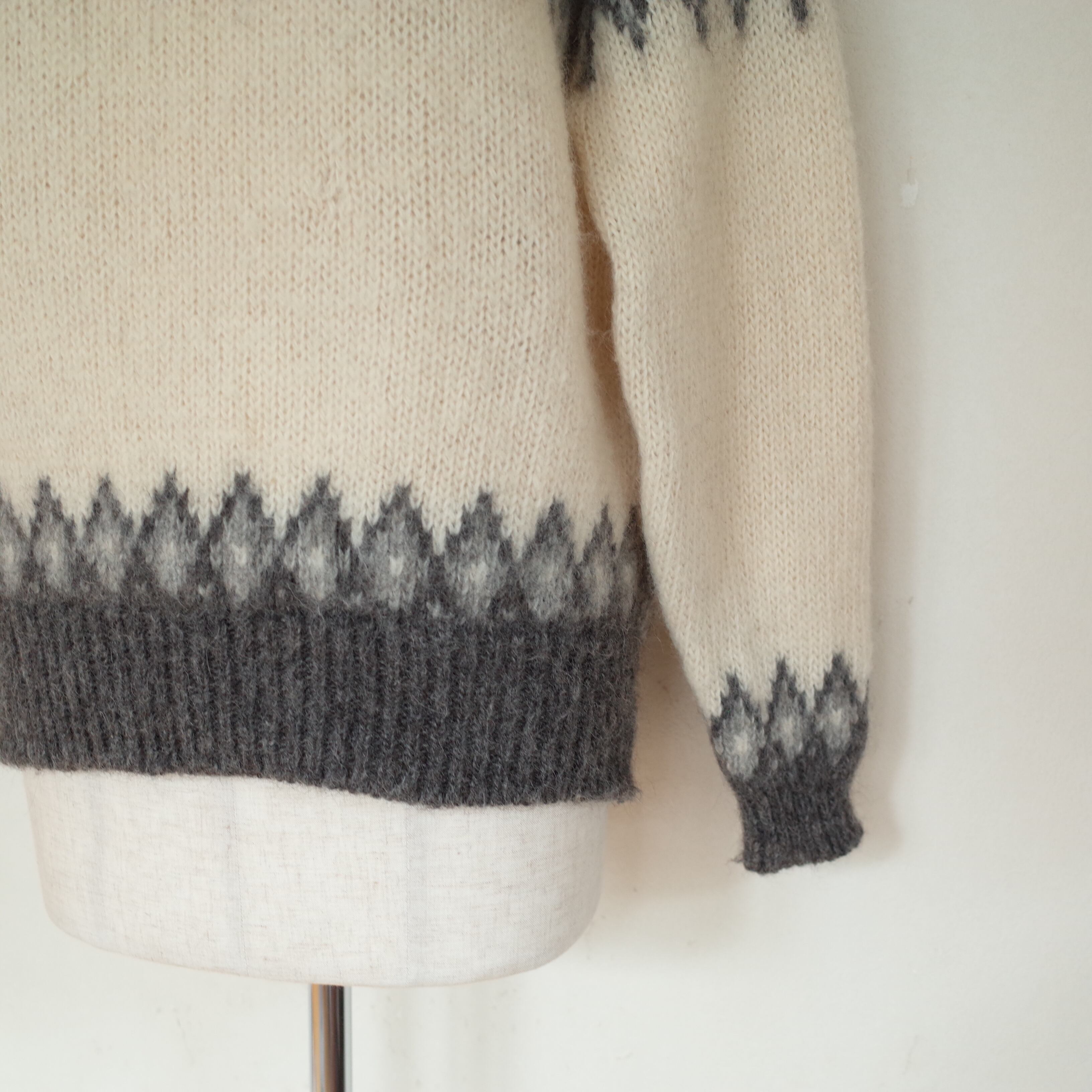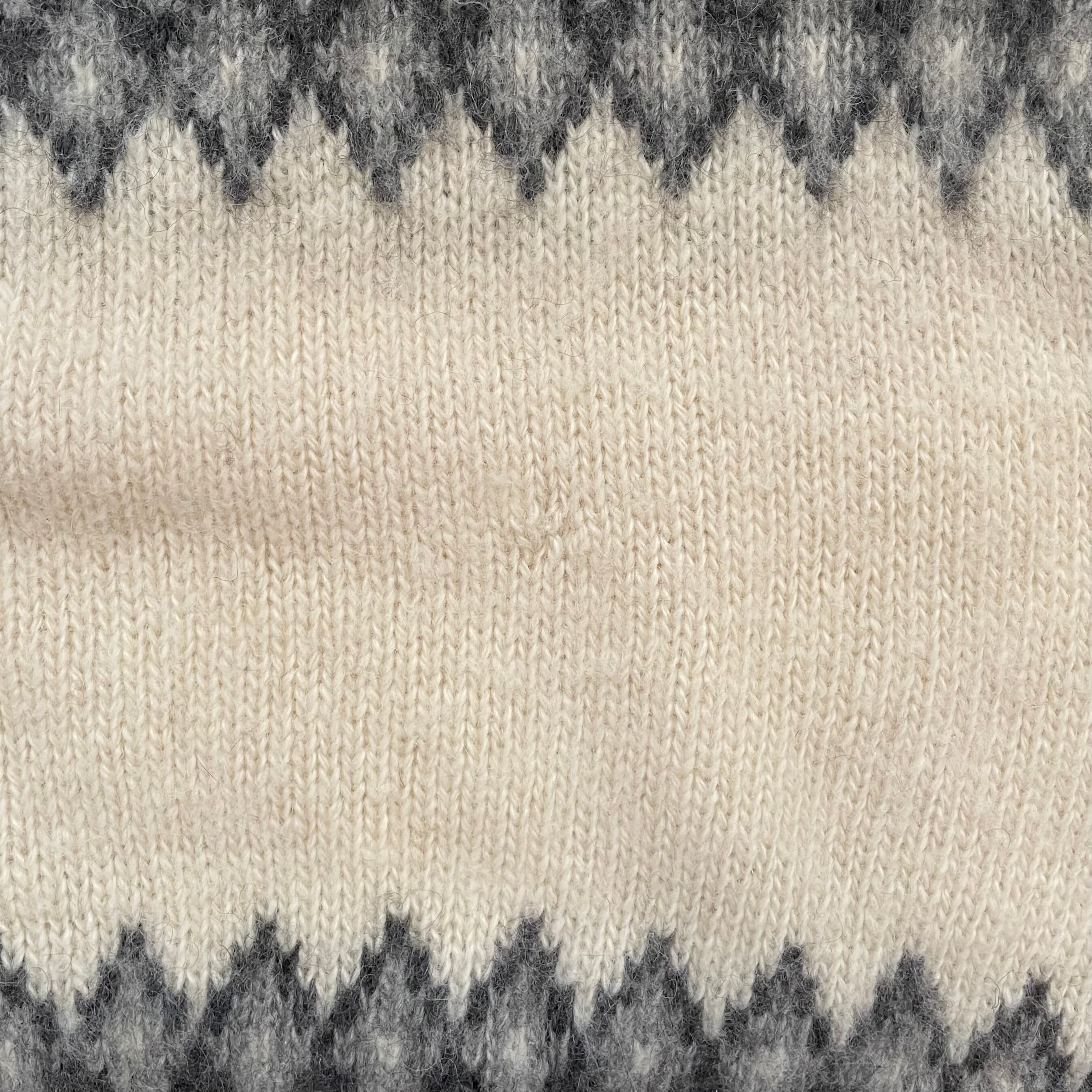 スコットランド製フェアアイル柄のセーター。ホワイトベースにグレーのシックな配色。数々のブランドからも出されている伝統的な柄ですが、スコットランド北東にあるシェットランド諸島のフェア島が発祥です。ゆったりとしたサイズ感なので、ユニセックスで着用可能です。