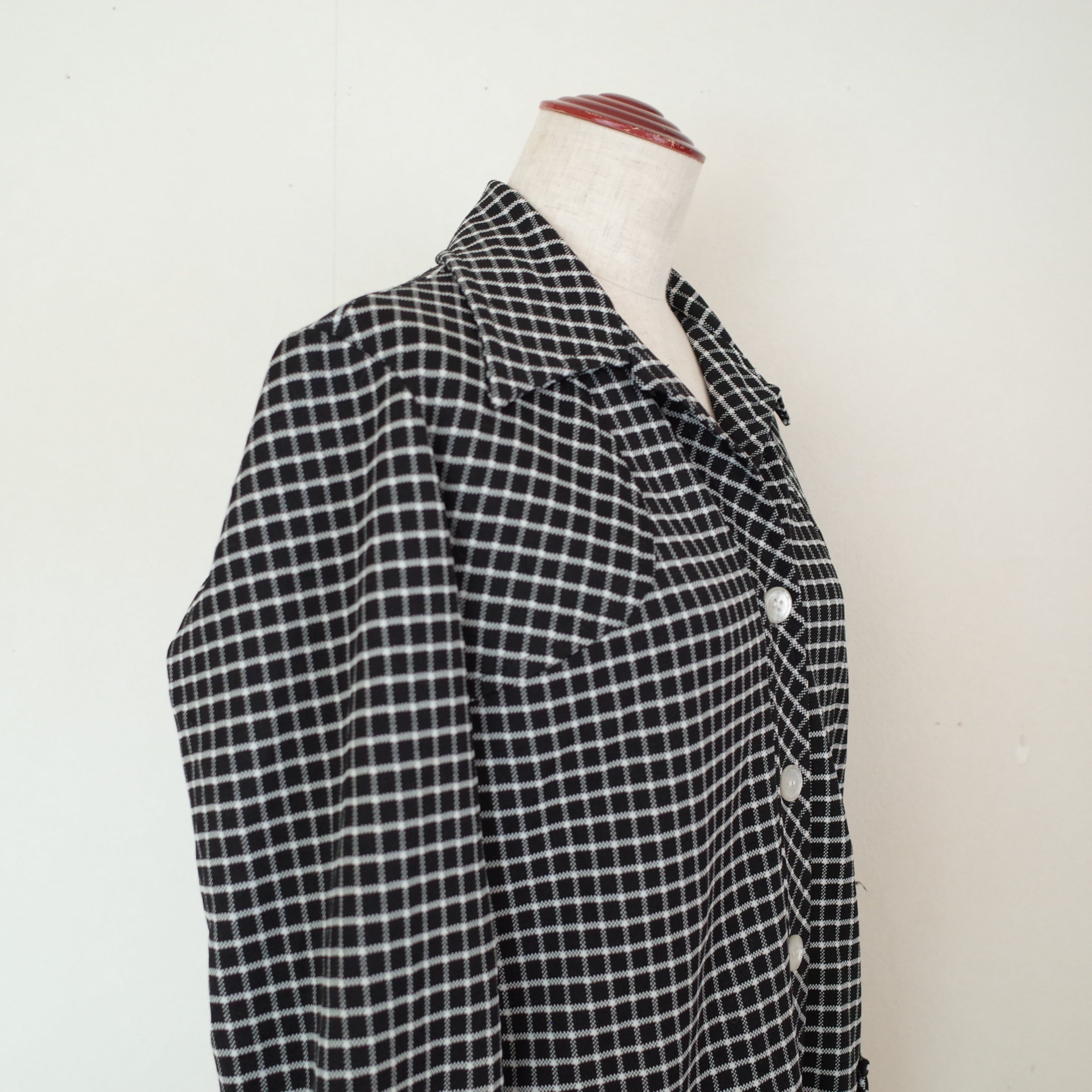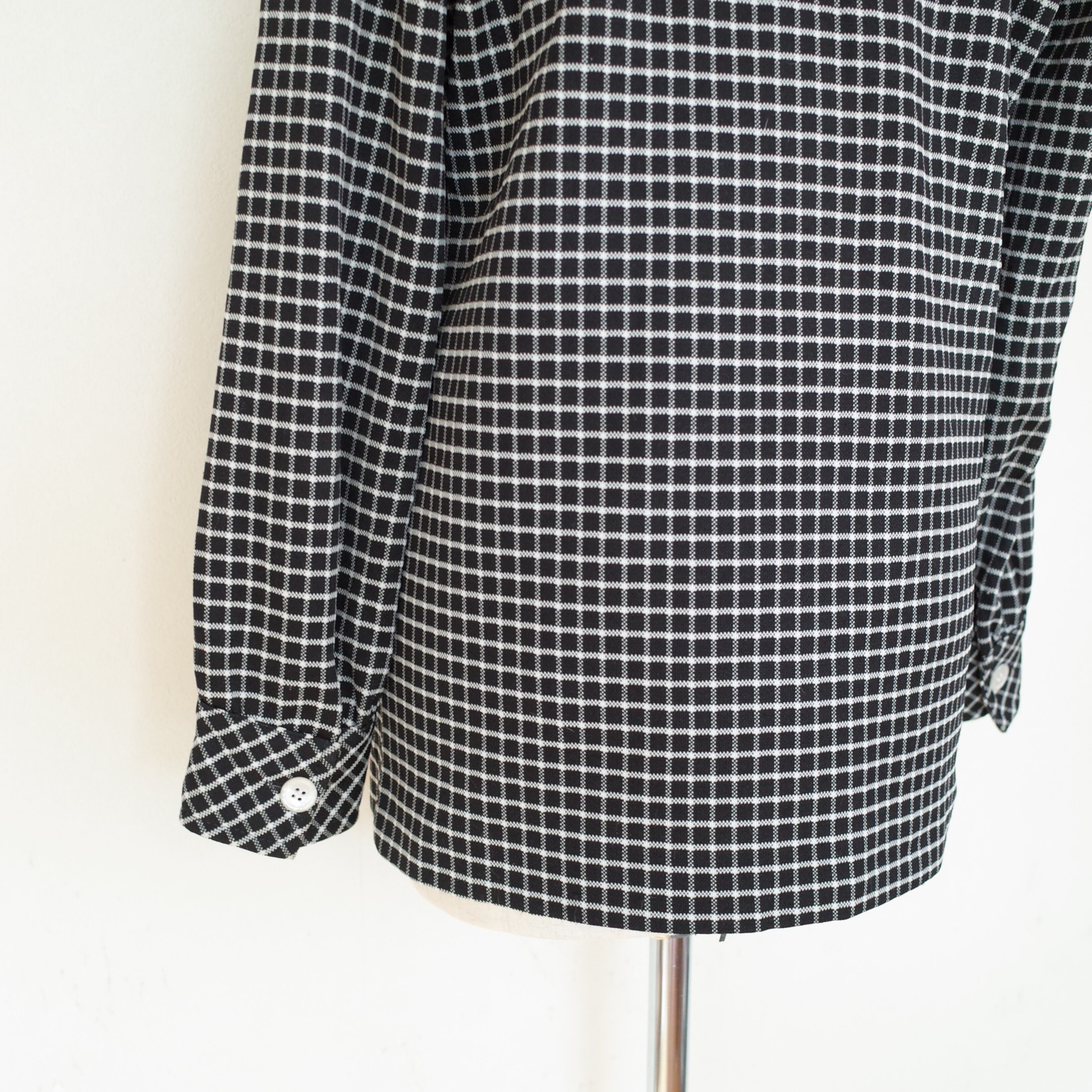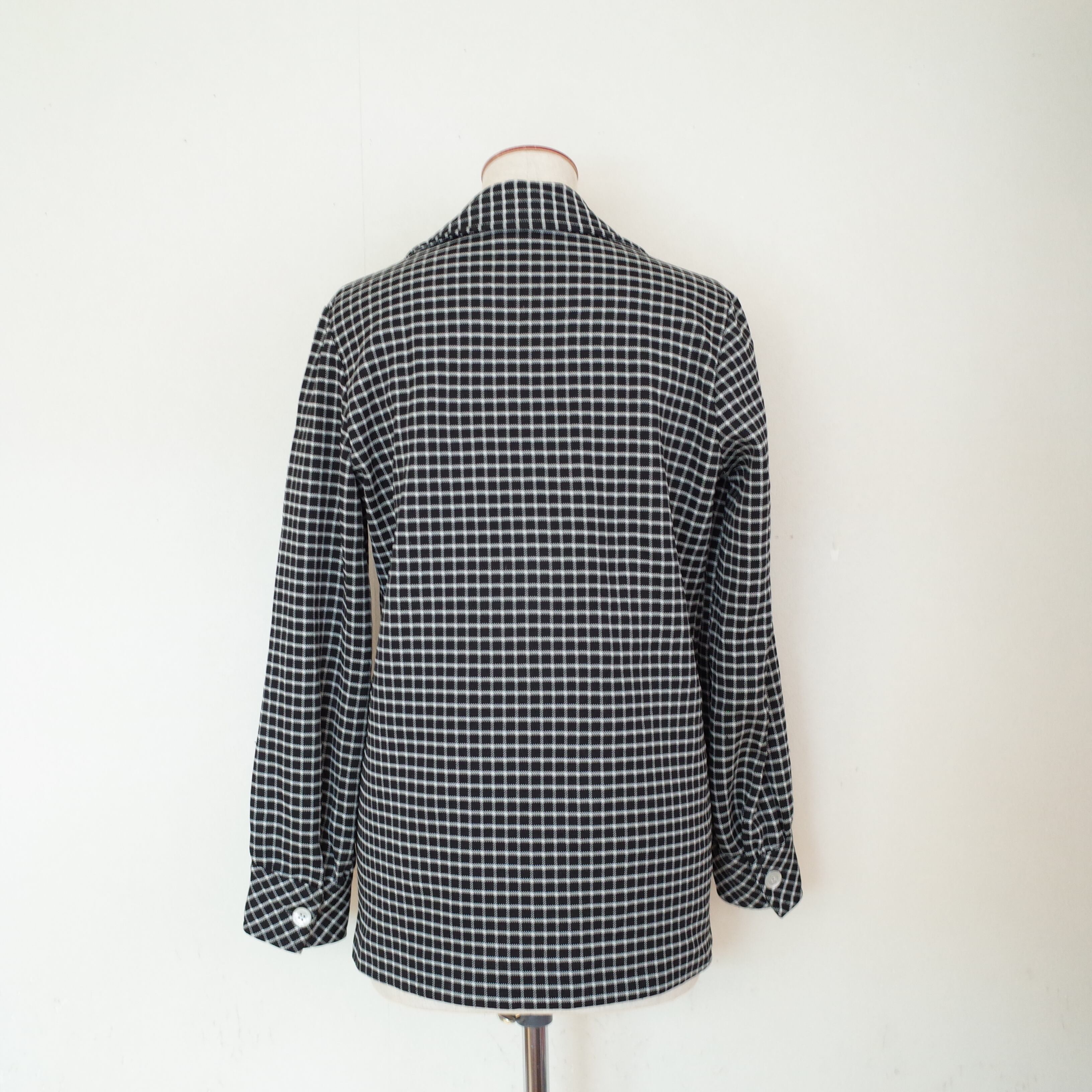 ポリエステル素材のシャツジャケット。素材やディテールはヴィンテージならではの雰囲気ですが、チェックのパターンは今っぽさも兼ね備えています。デニムはもちろん、スラックスで綺麗目にも。スタイルをあまり選ばずに、マルチにご活用頂ける一枚です。