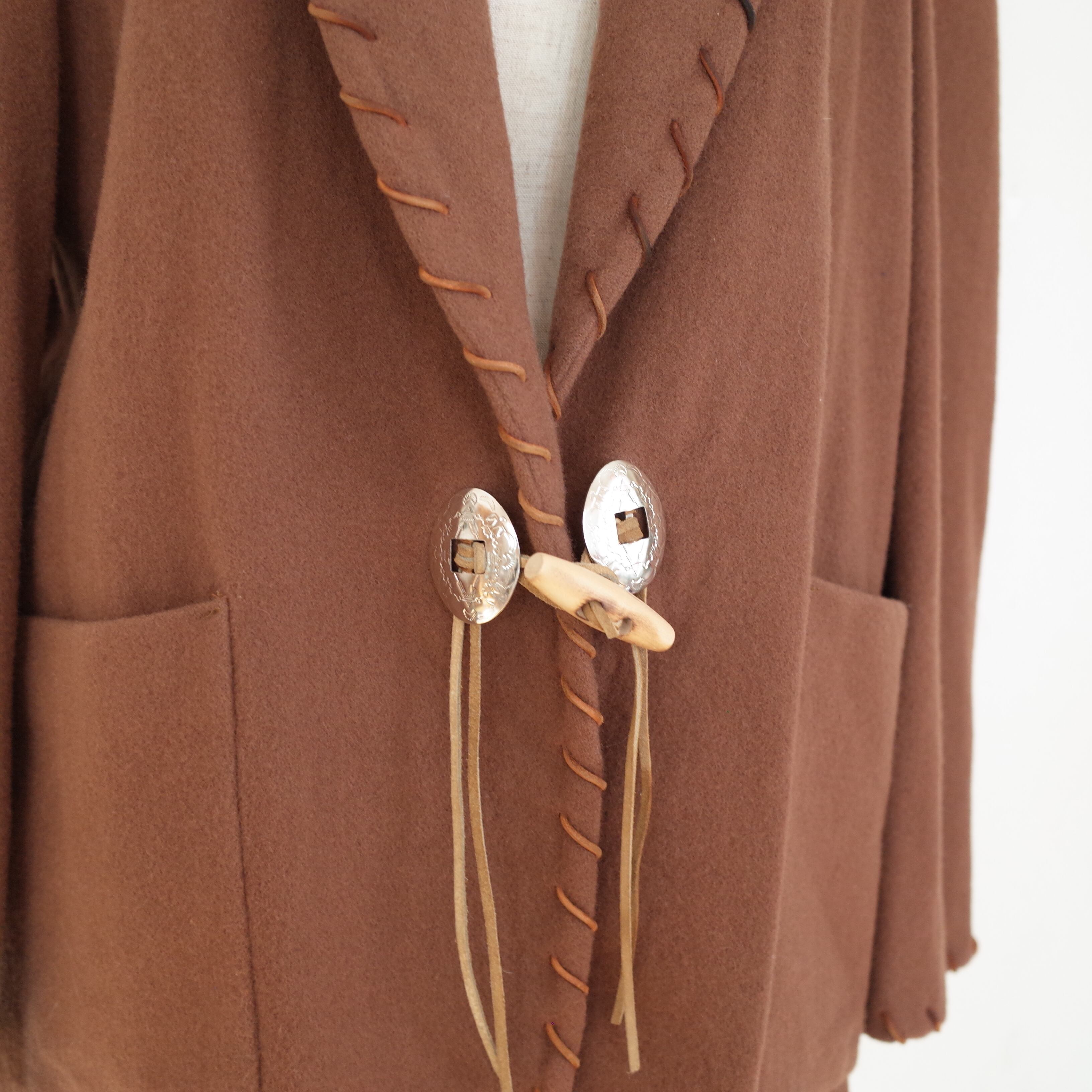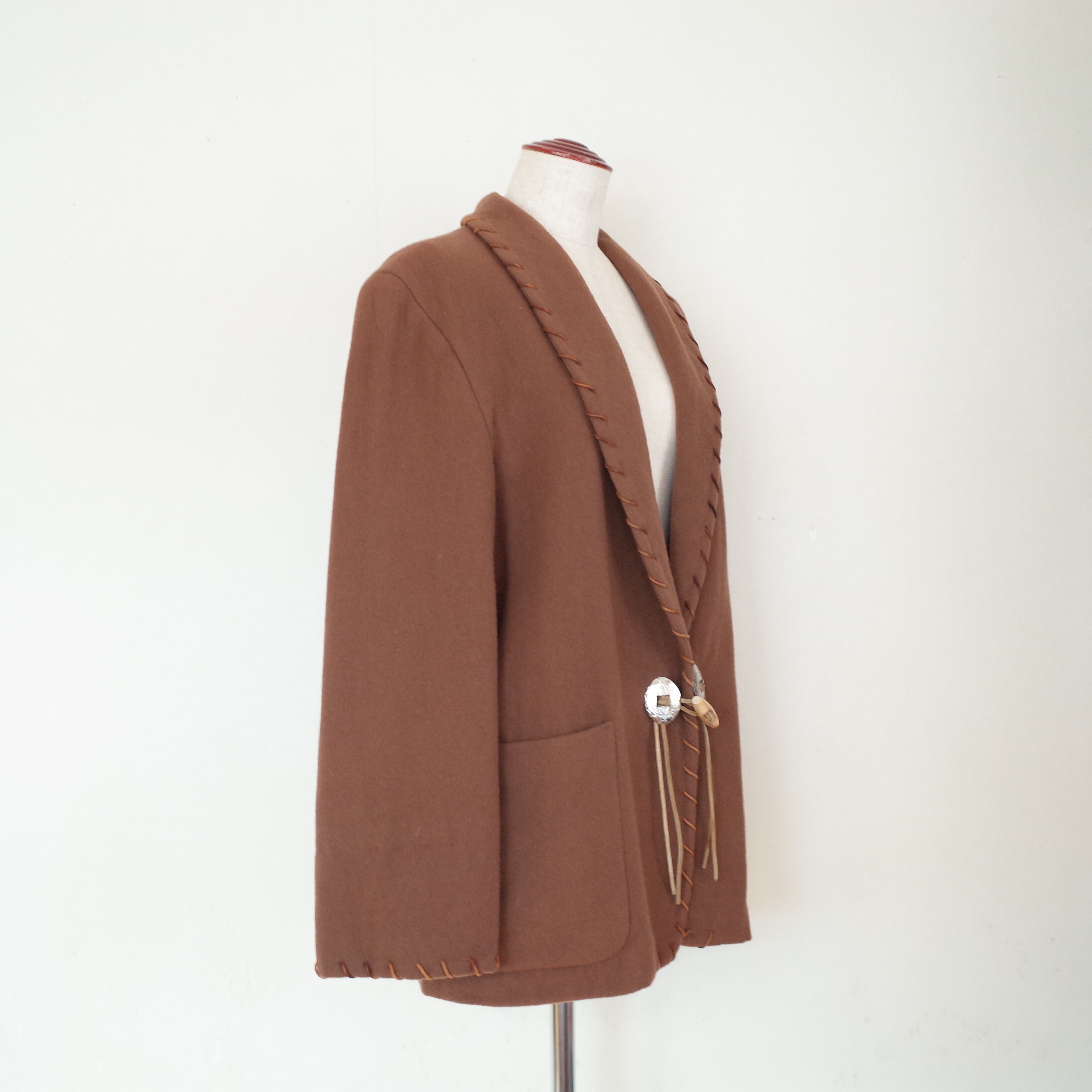 ショールカラーのウールコート。トリムされたレザーのステッチのデザインとコンチョボタンがネイティブな雰囲気の一枚です。肩パッドは外してあります。