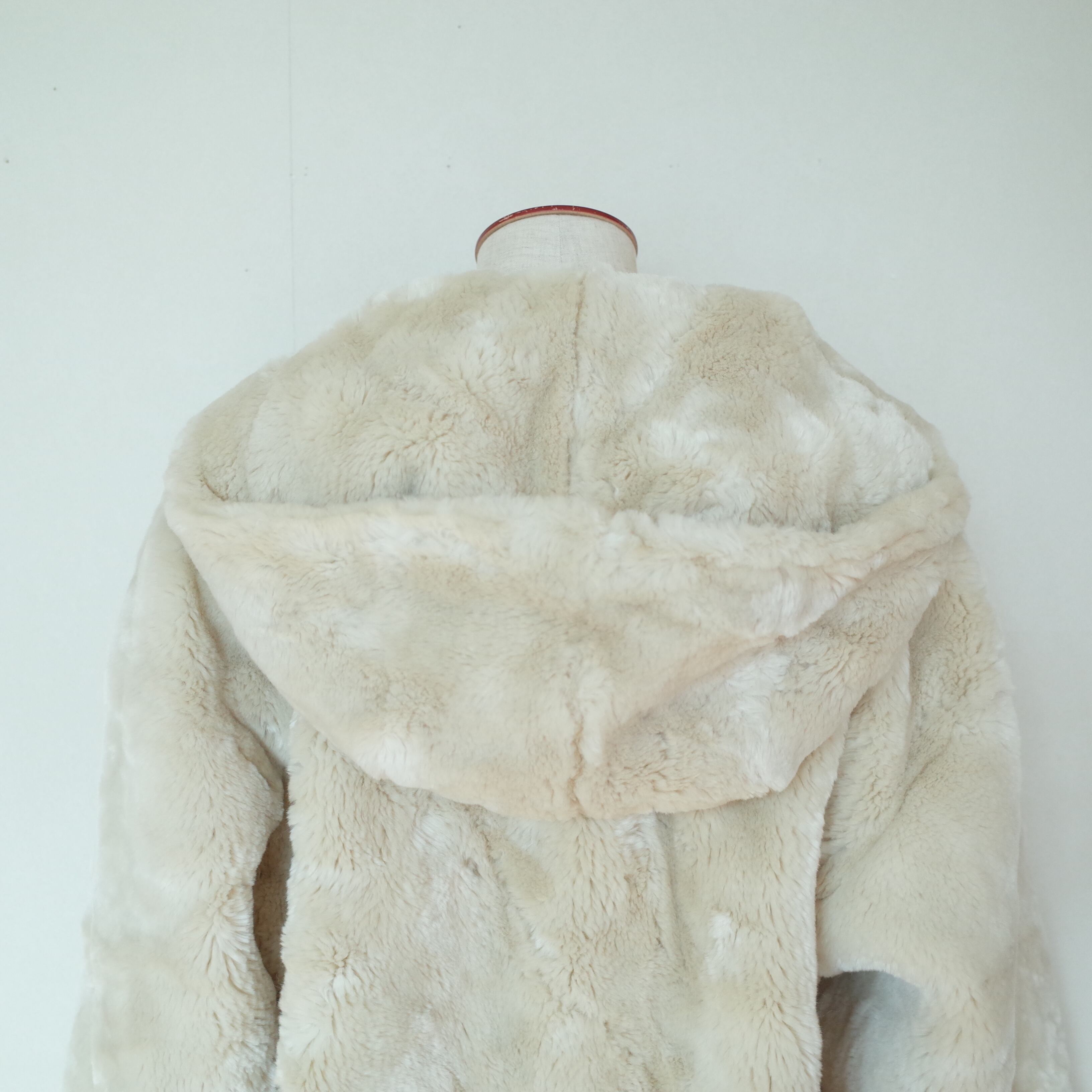 アメリカ製エコファーのフード付きジャケット。フェイクファーは暖かく、気兼ねなく羽織れるので冬におすすめなアウター。程よくあるボリュームもかわいいです。デニムはもちろん、ロングスカートや綺麗目なパンツにもバランスよく合わせられる丈感で、スタイリングにも取り入れやすい一着です。