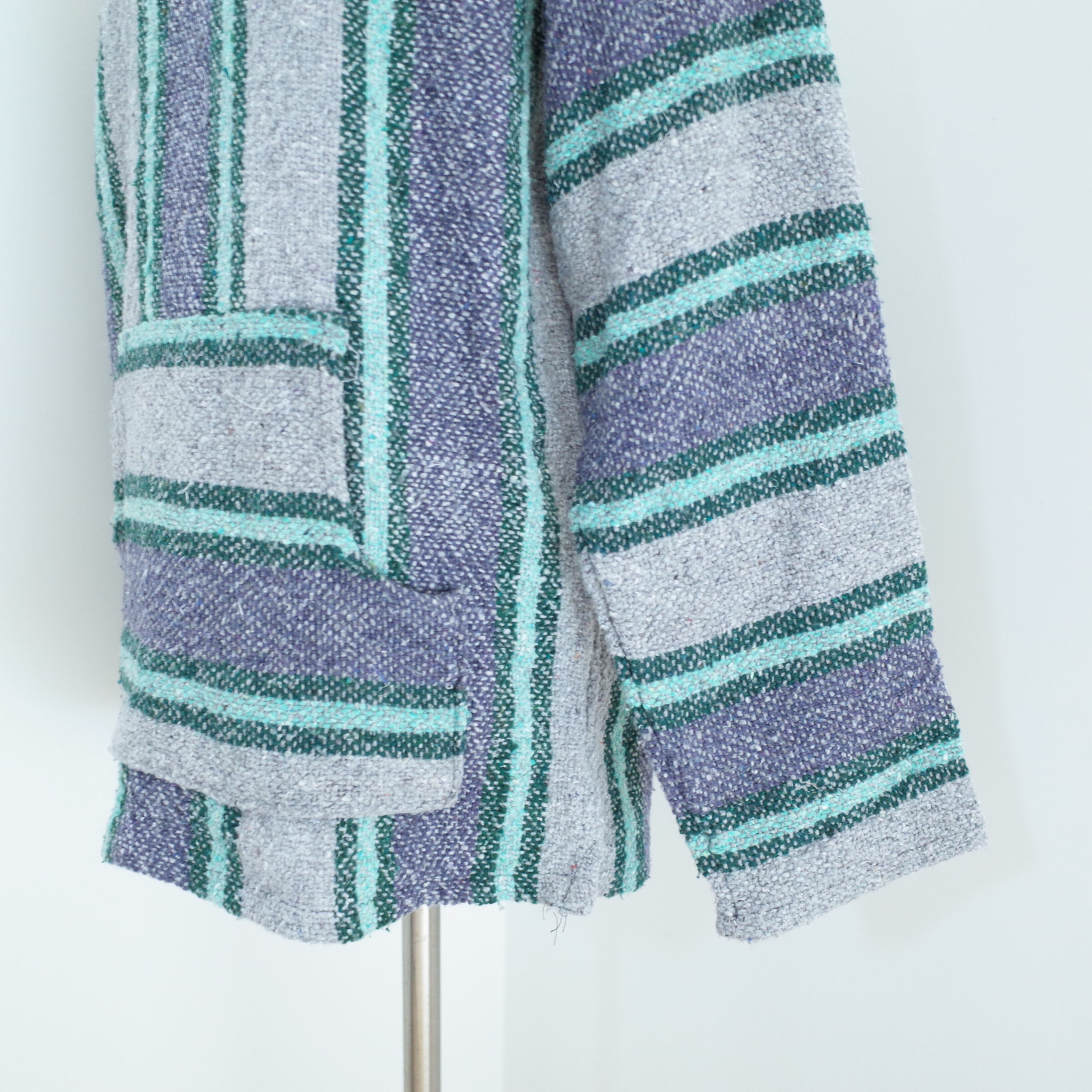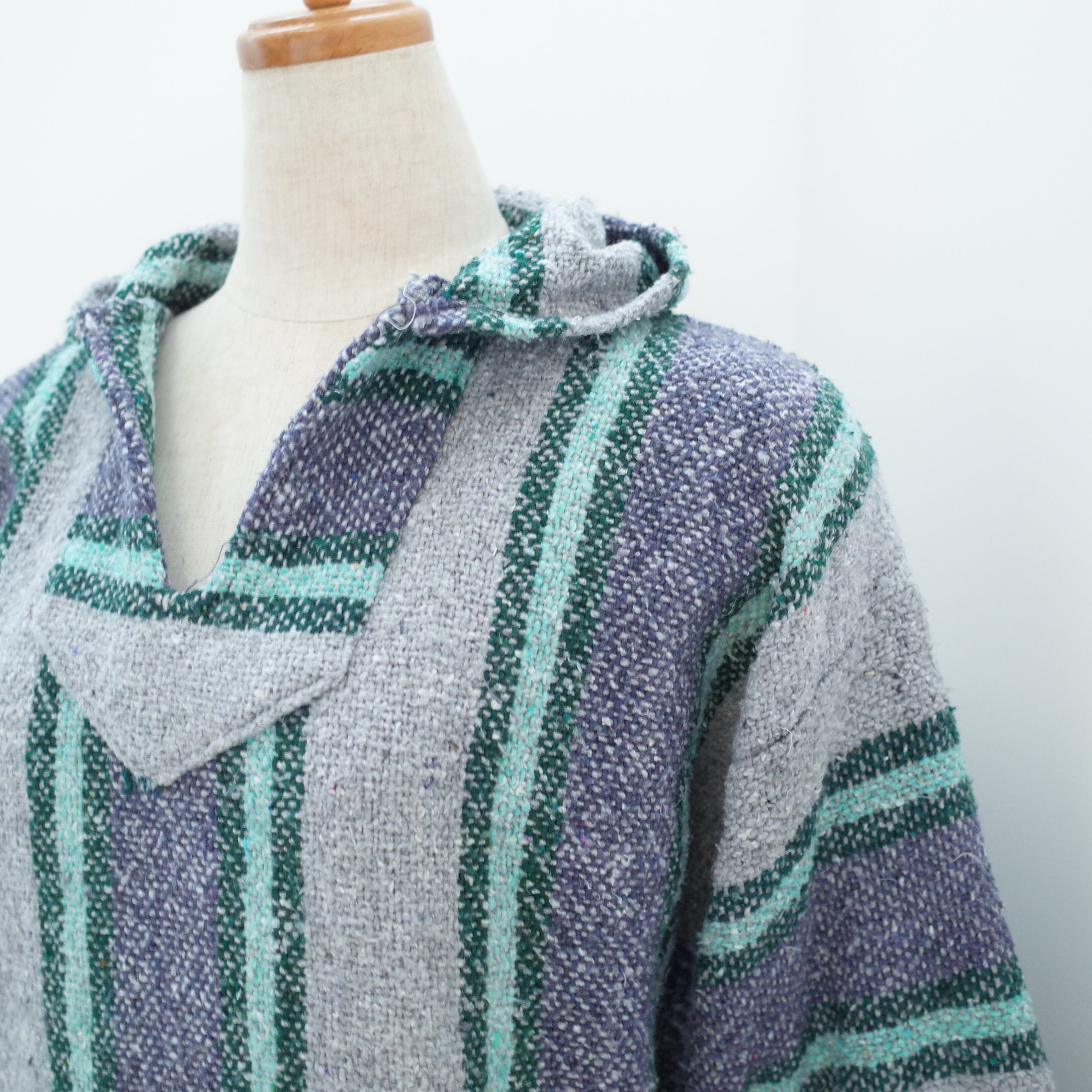ヒッピー&サーフのアイコン、メキシカンパーカー。最近ではストリートブランドやハイブランドからも出ています。タートルネックのカットソーやニットをインしたり、コートのインナーに仕込めば抜け感の演出も。起毛のないそんなに分厚くない生地感のタイプです。ゆったりとしたシルエットなので、長い袖を思いっ切りロールアップして。ユニセックスで着用可能です。