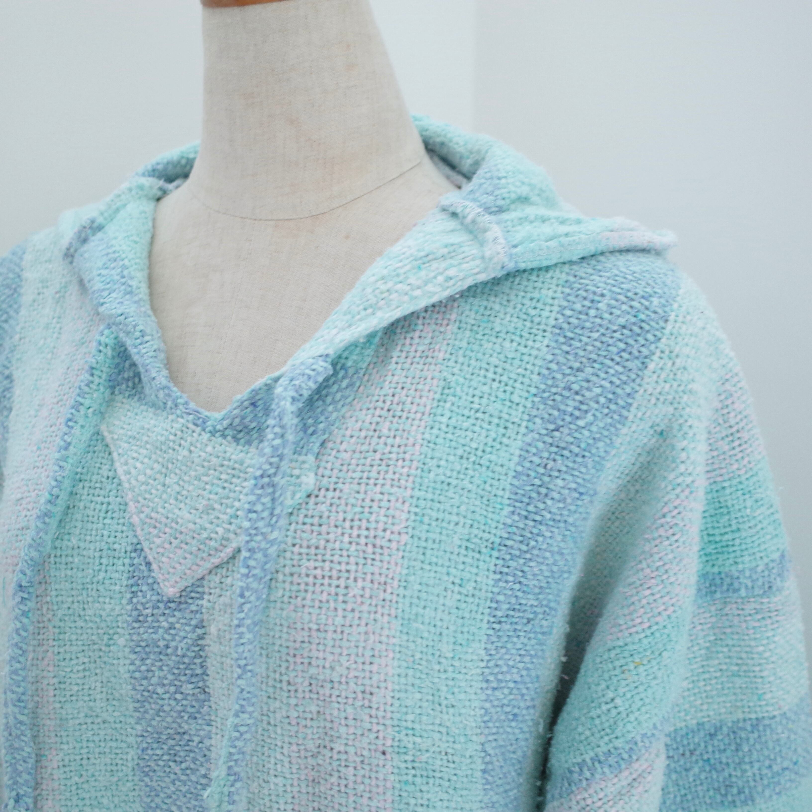 ヒッピー&サーフのアイコン、メキシカンパーカー。最近ではストリートブランドやハイブランドからも出ています。タートルネックのカットソーやニットをインしたり、コートのインナーに仕込めば抜け感の演出も。起毛のないそんなに分厚くない生地感のタイプです。ゆったりとしたシルエットなので、長い袖を思いっ切りロールアップして。ユニセックスで着用可能です。