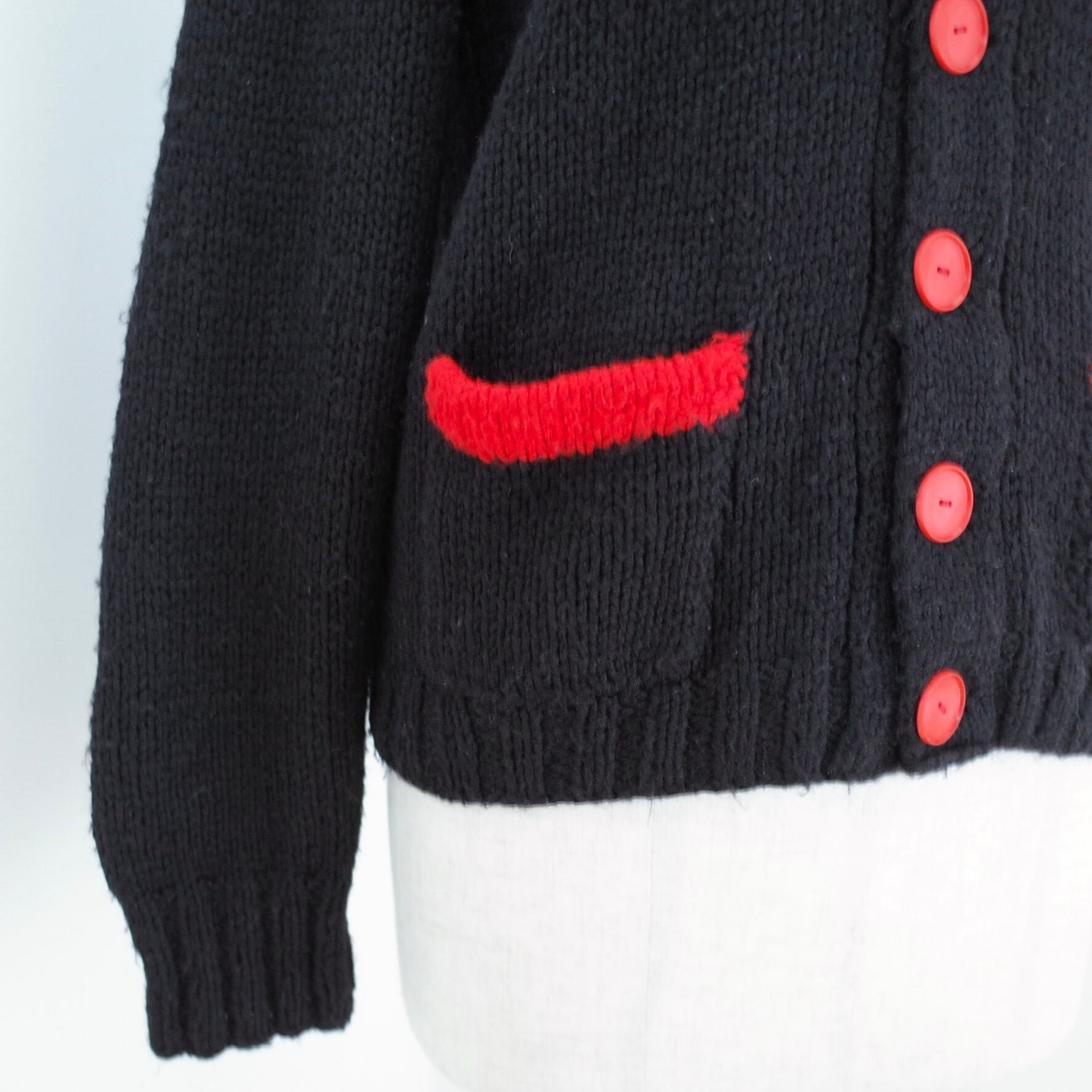 ブラック地にレッドのラインやボタンが魅力的なヴィンテージのレタードカーディガン。よくあるレタードカーディガンよりもざっくりと編まれて軽い一枚。ふわふわっとした、ウールの手触りです。