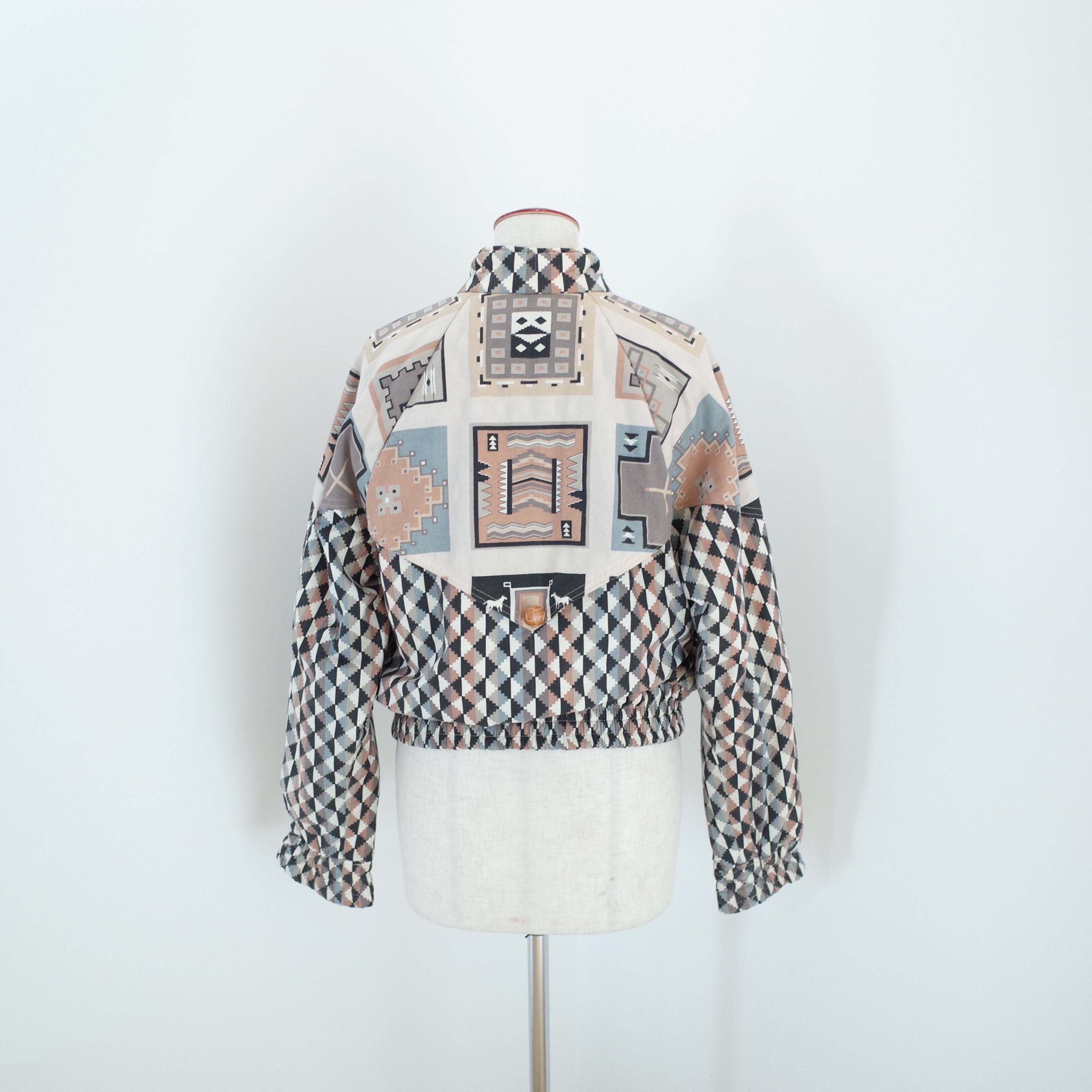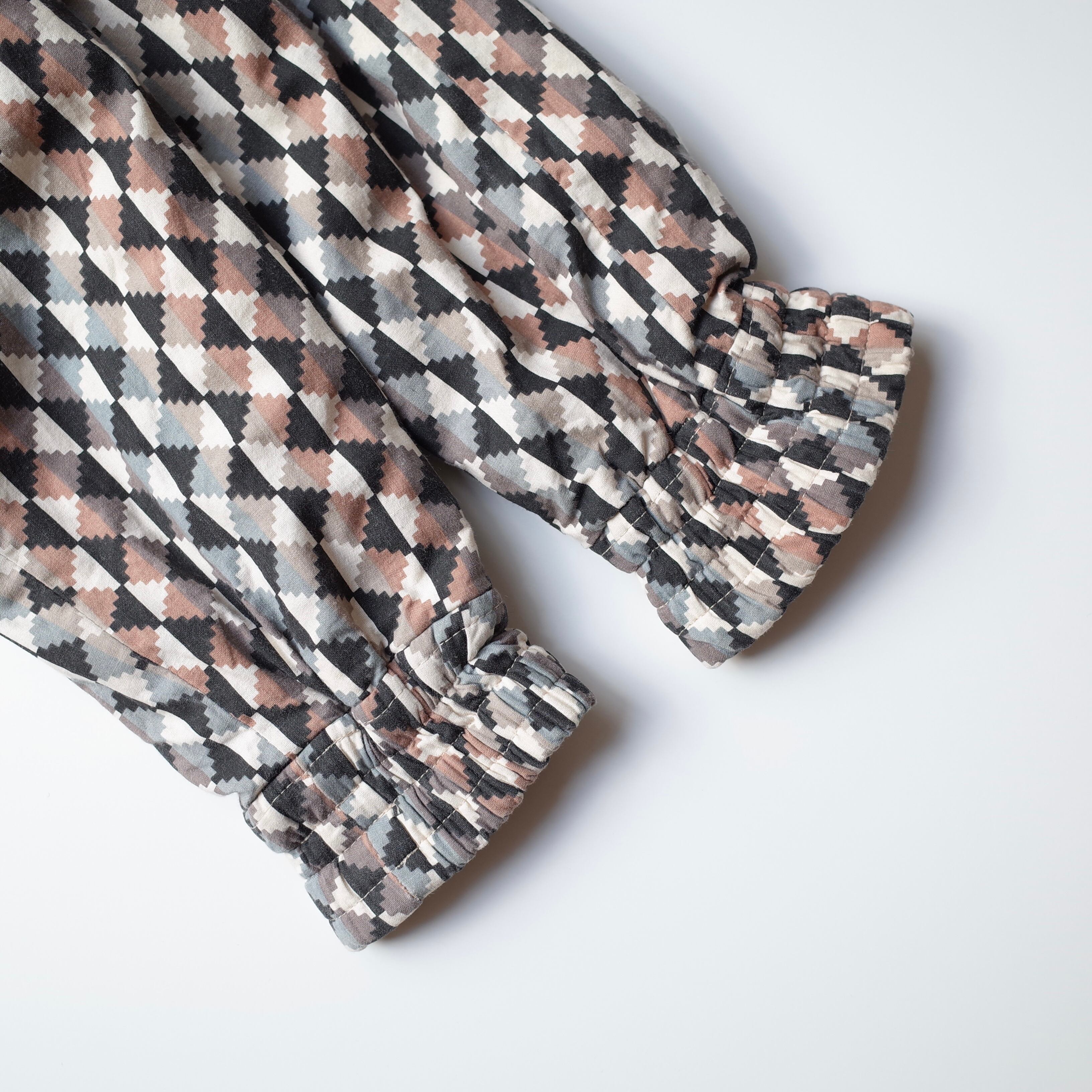 ネイティブ柄のブルゾン。柄と配色の可愛さが心をくすぐる一枚。ライナーは中綿の入ったキルティング仕様で、上からアウターも羽織れる生地感です。コットン素材でシーズンも長く活躍してくれます。