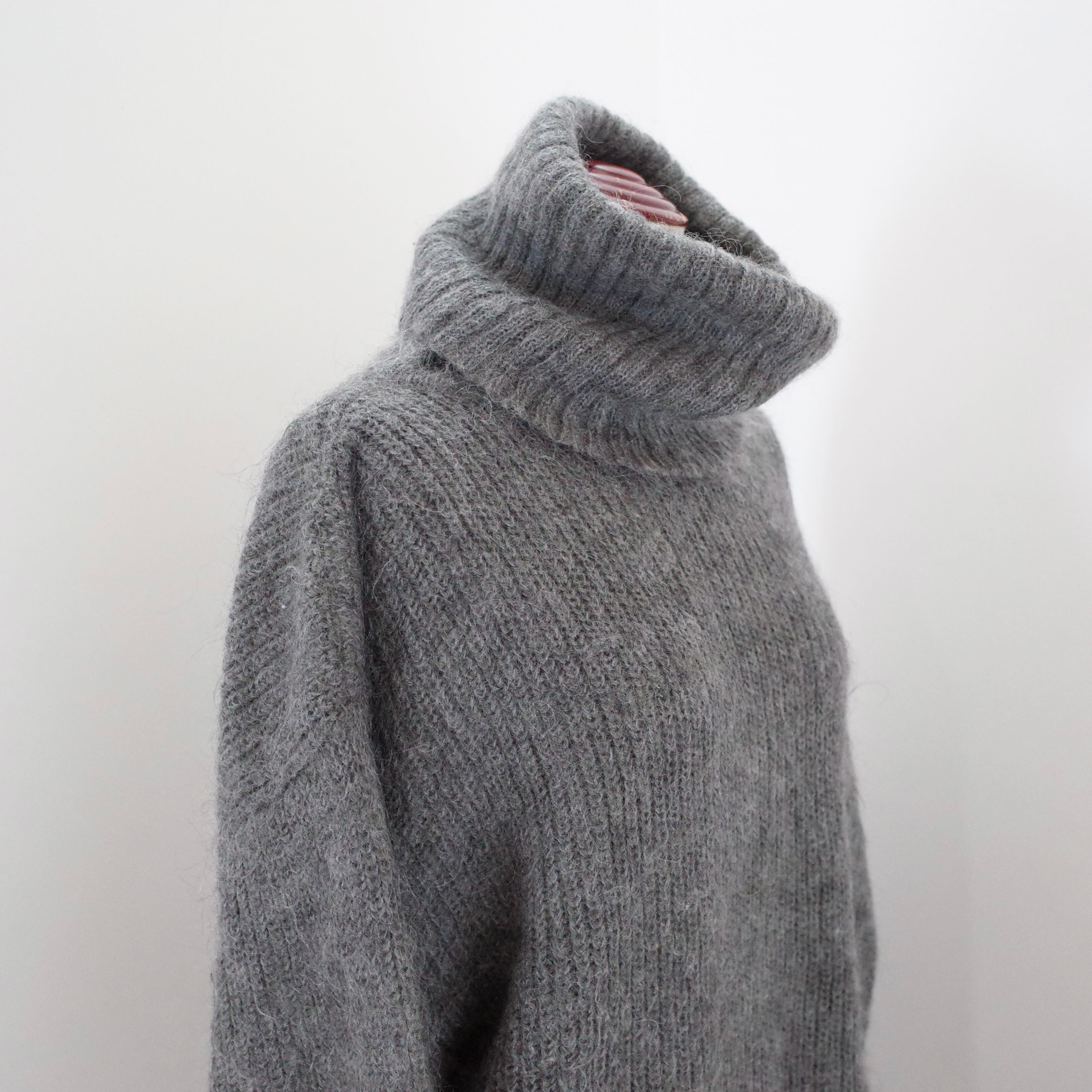 毛足の長いモヘアのセーター。お尻も隠れる長めの丈感です。滑らかで柔らかい手触りの糸で編まれており、タートルネックのボリュームもあって暖かい一枚。マフラーいらずです。パンツやロングスカートとの合わせもgood。
