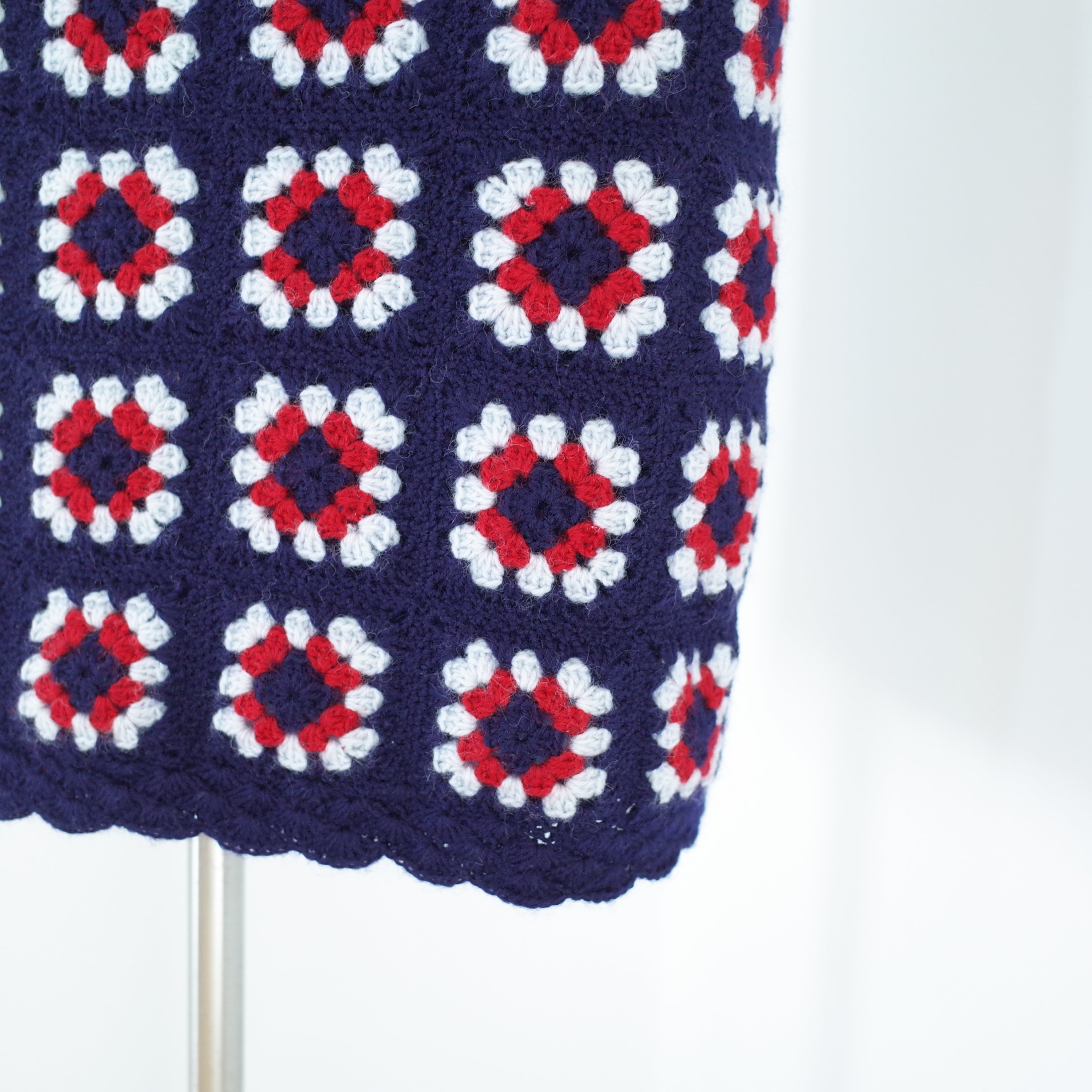グラニースクエアのニットスカート。フレアデニムなどパンツとレイヤードしたり、スタイリングにちょっとプラスするだけでグッと雰囲気を引き出せます。裏地は付いていないので、一枚で履く場合はペチコートを下に履いて下さい。