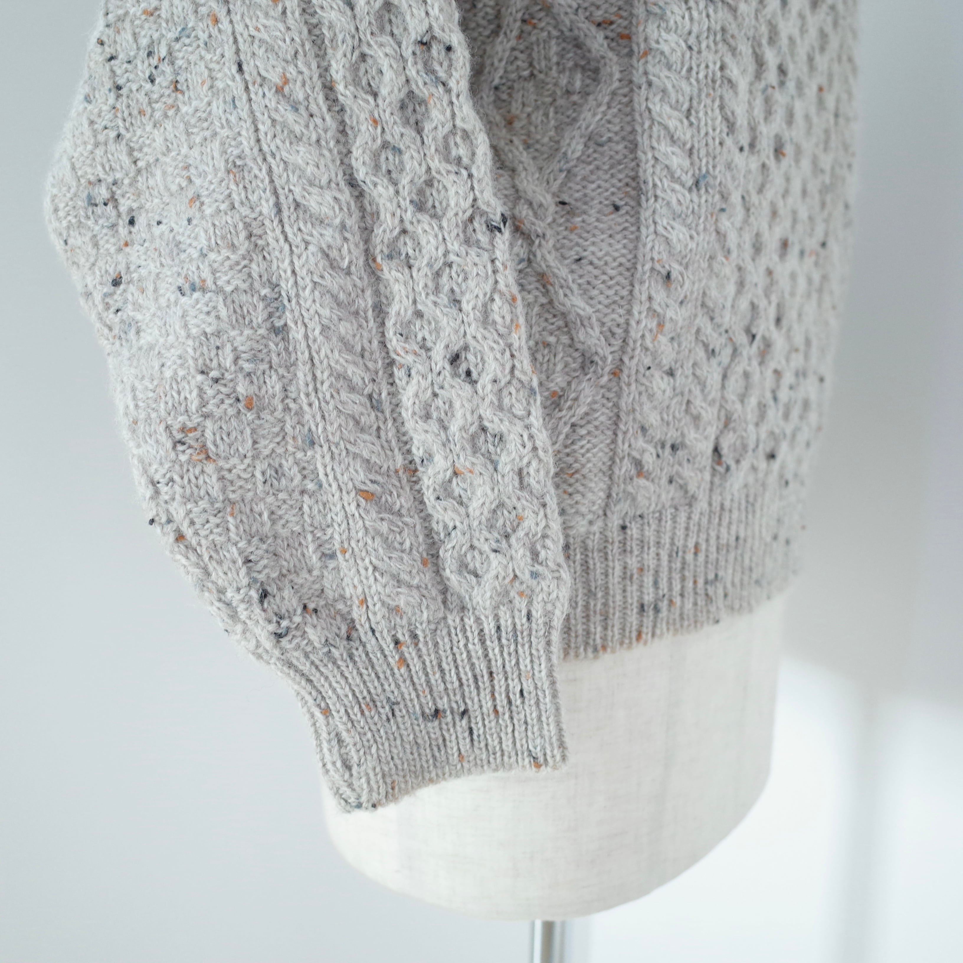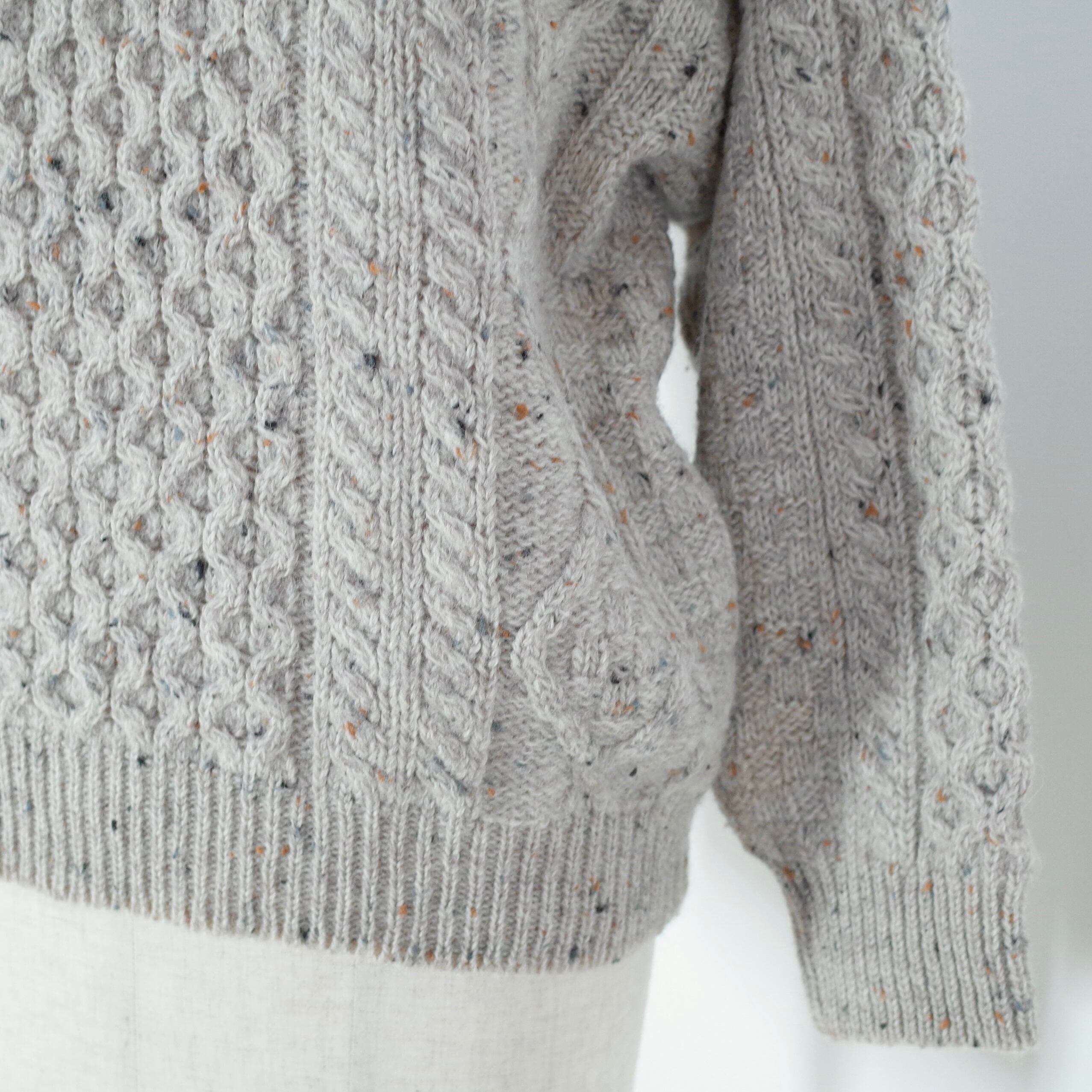 Aran Craftsはアイルランドの伝統的なニットメーカーです。品質の良さと、高いコストパフォーマンスから大手メーカーのファクトリーとしても稼動しています。アランセーターのお手本のようなセーターは、アイルランドで生産され、素材はニューウール。100%羊毛から作られているので温かく、本来のウールらしい程よくゴワゴワした風合いの塩梅もいい一枚。色々な色のネップが入っているオートミールカラー。ざっくりと着るのにおすすめなセーターです。