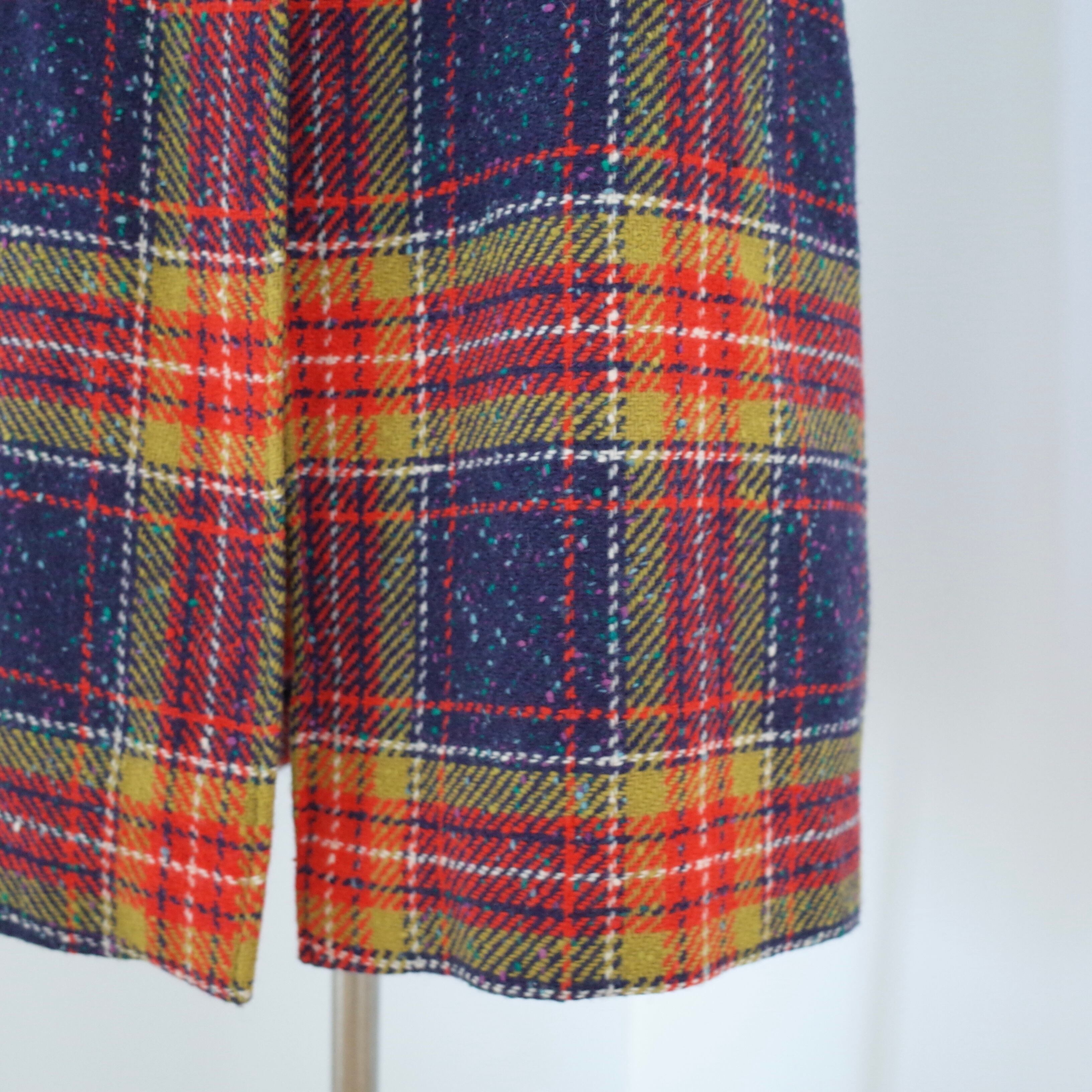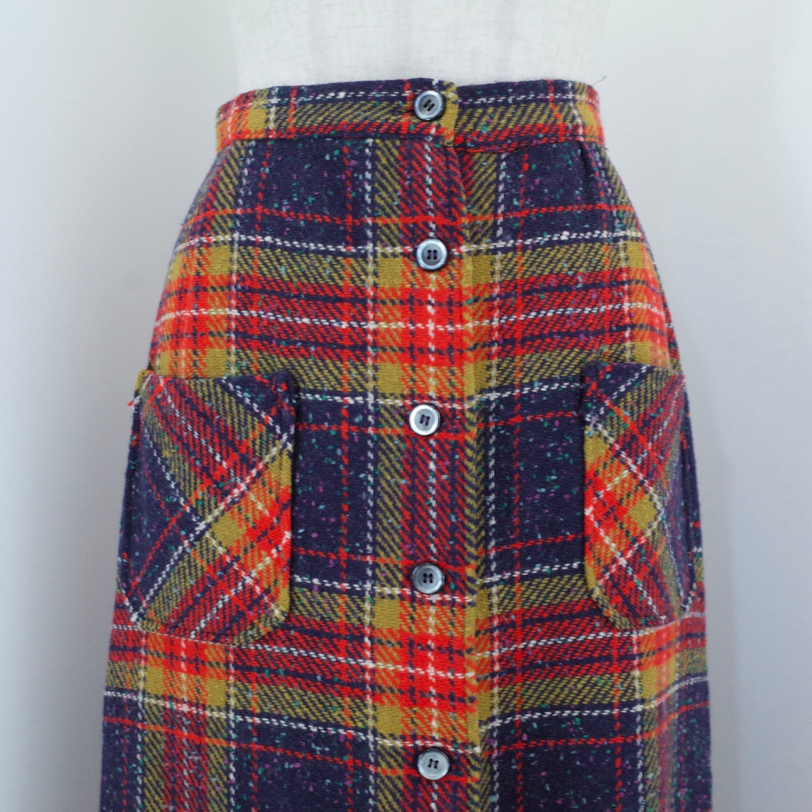 アメリカ製ウール素材のロングスカート。パープルやグリーンのネップが入ったチェック柄。前開きのボタンタイプで、スリットが深めに入っているのでフレアデニムなどとレイヤードしても◎ニットと合わせたスタイリングで季節感を楽しめるスカートです。