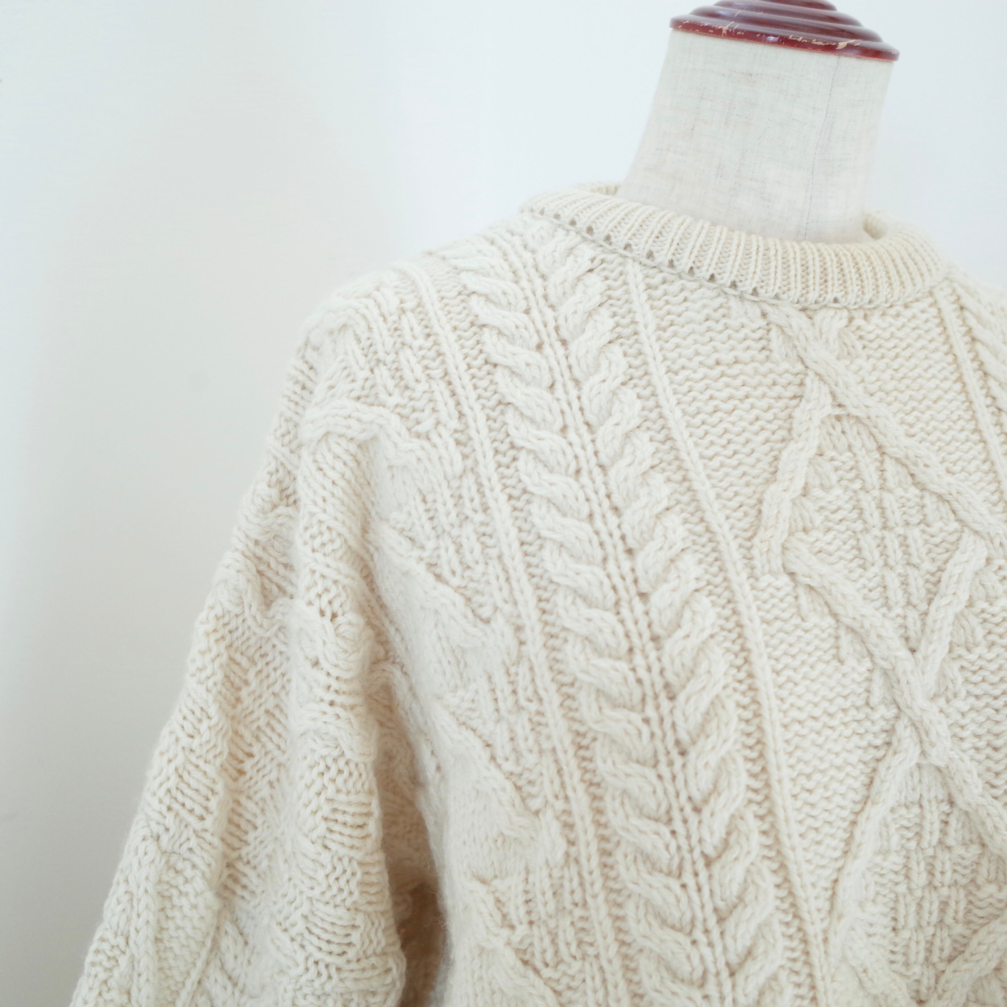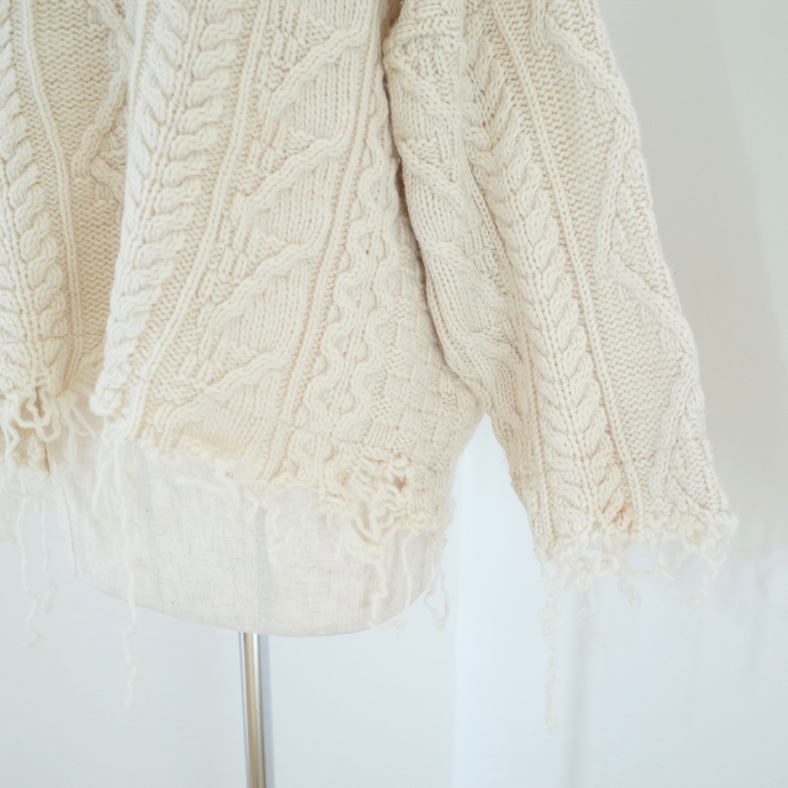 アイルランド製Aran Craftsのフィッシャーマンセーターをリメイクした一枚。XXLの大きいサイズの袖と着丈を大胆に解いたリメイク品。解いた箇所はミシンで縫ってあるのでちゃんと解けなくなっています。リメイクしたことで、絶妙なシルエットと他にはないデザインとなっています。とても可愛いリメイクのセーターです。