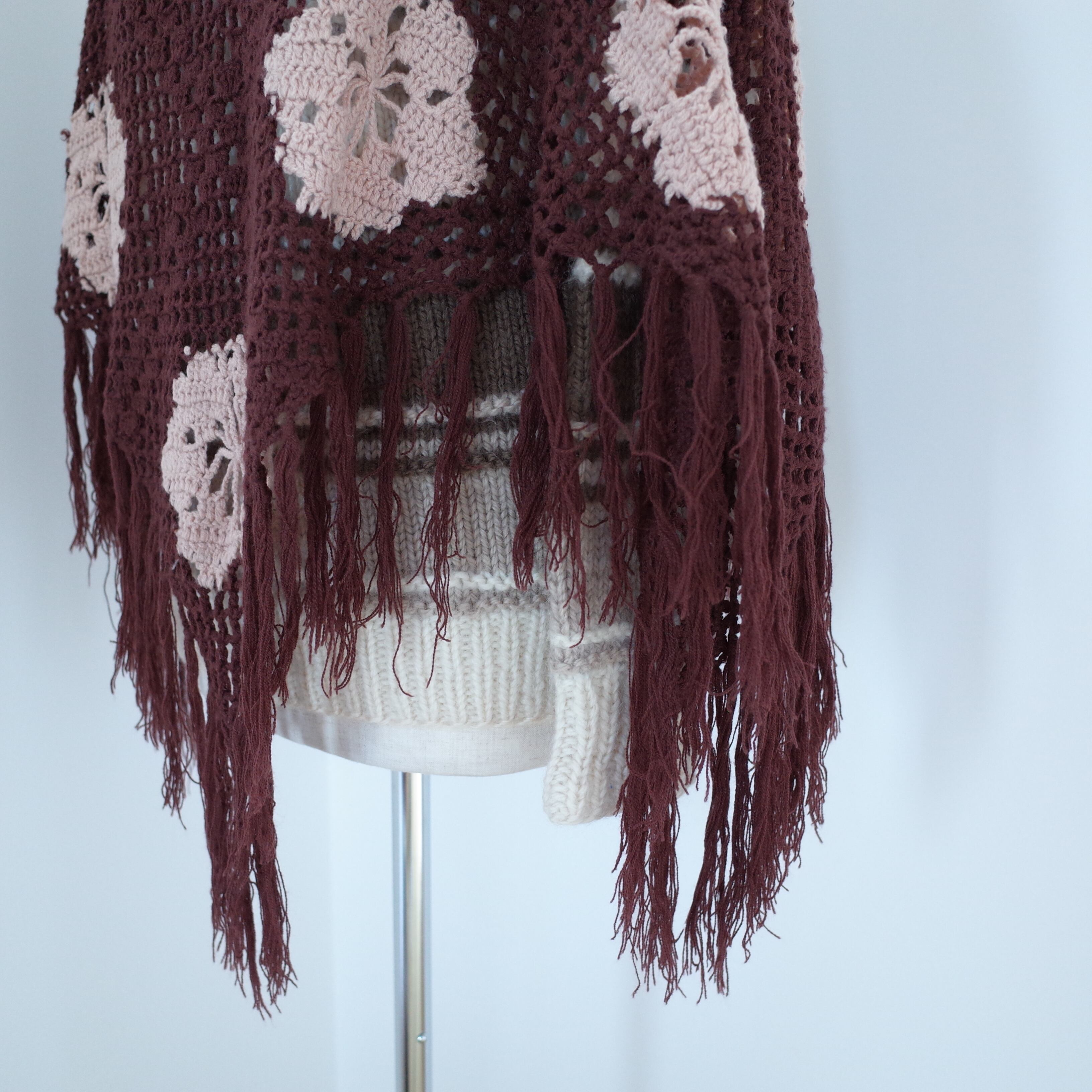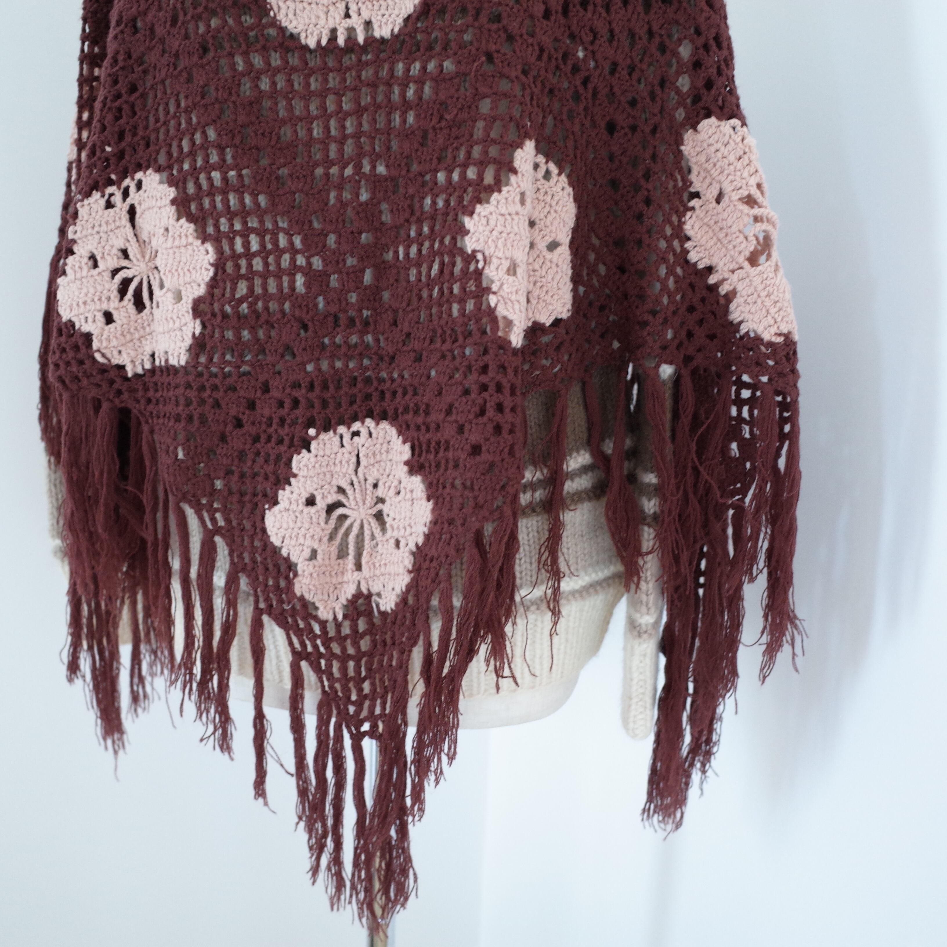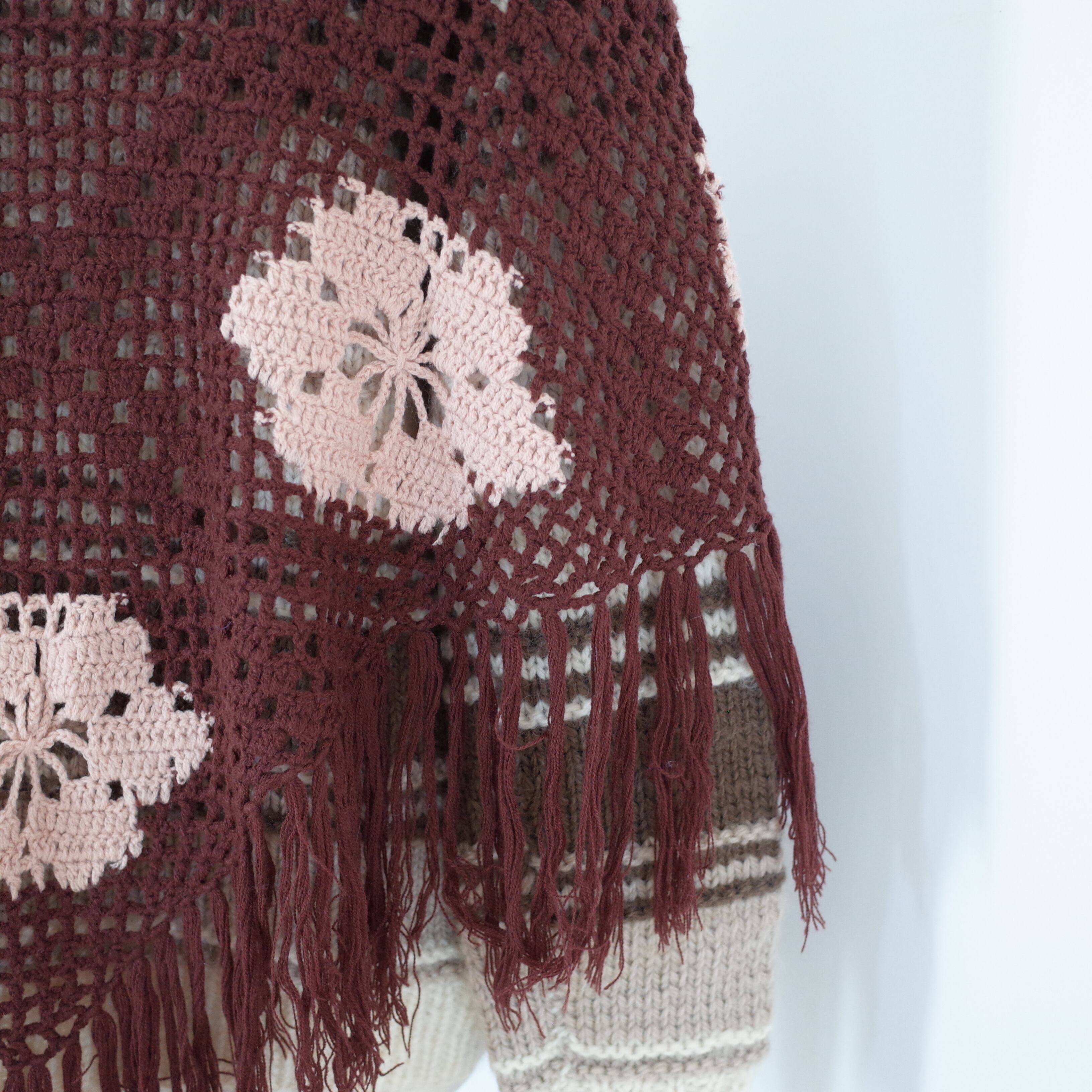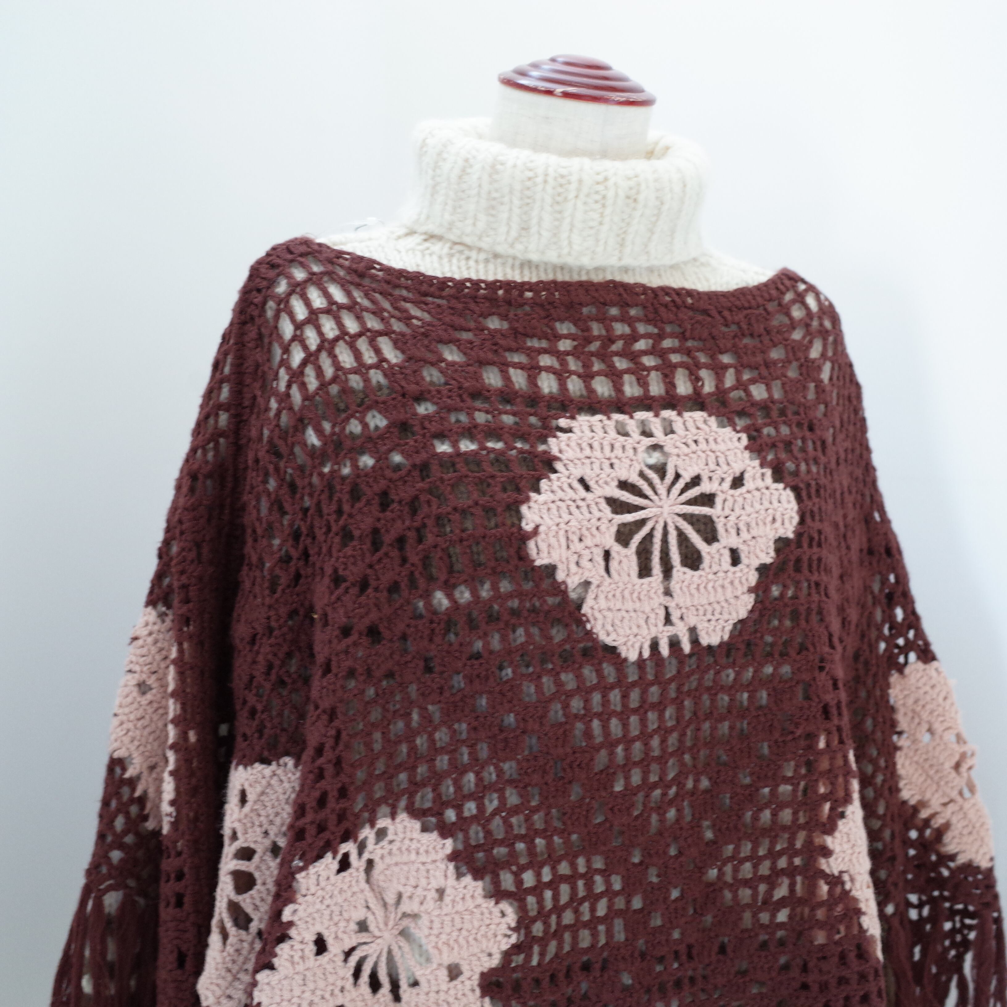 花柄のクロシェがかわいいニットポンチョ。ブラウン×ベージュのカラーリングもgoodです。ジャケットやコートの上、ニット×ニットのコーディネートも◎ちょっと肩からかけるだけでポイントに。温かくもなります。