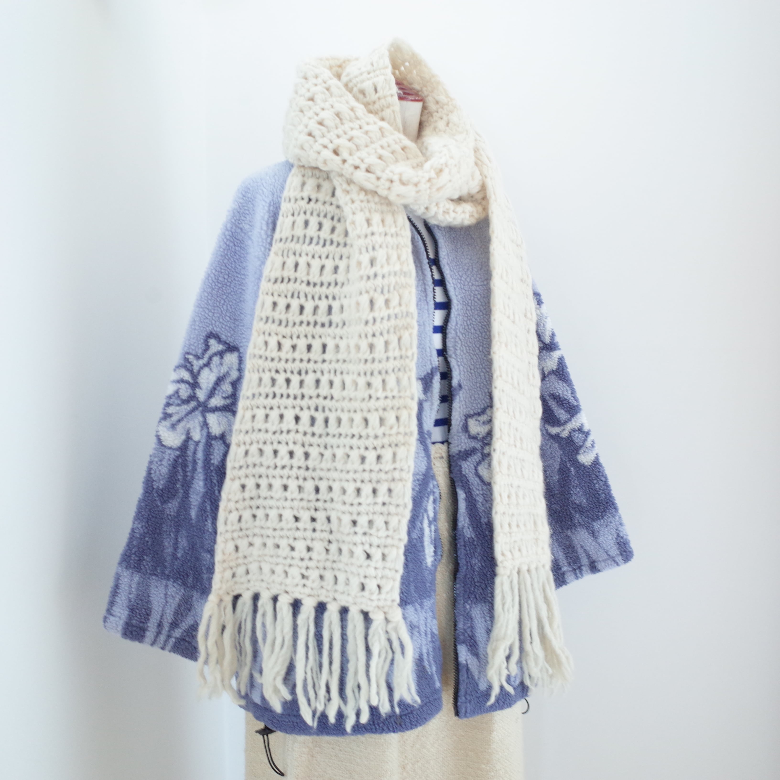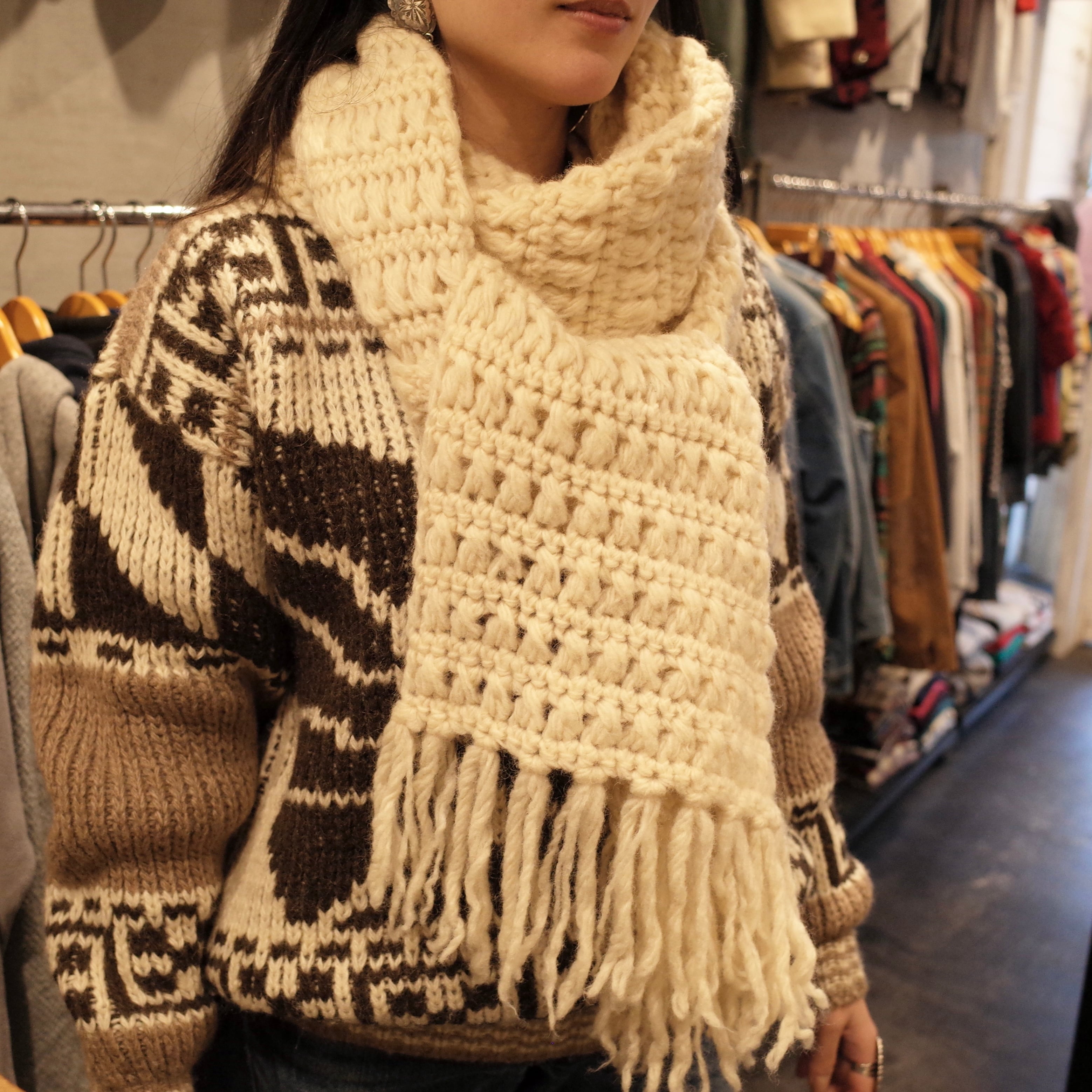ウールのニットマフラー。長めなので、寒い日にぐるぐる巻くのに活躍します。シーズンムードもぐっと高めてくれる、ニット小物です。