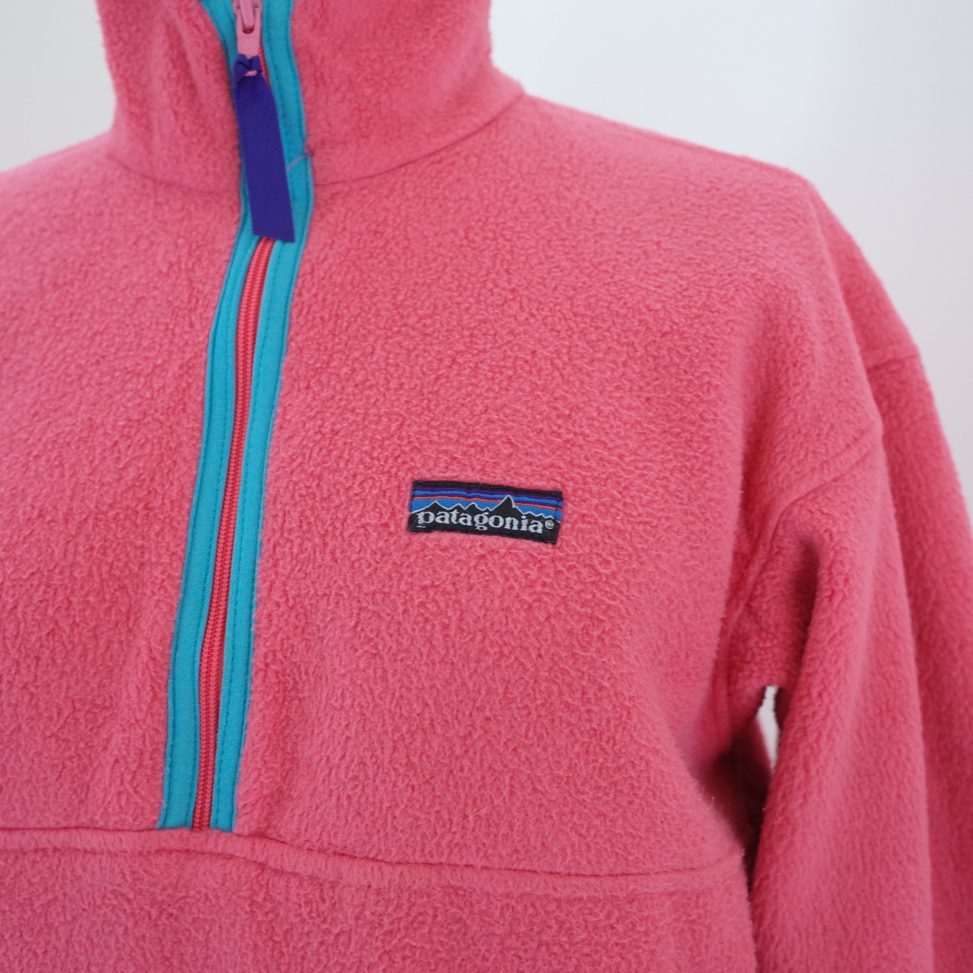 80〜90年代USA製patagoniaのフリース。スウェット感覚で着られる万能な一枚。鮮やかなピンクのボディにライトブルーのトリムがgoodなカラーリングです。ナイロンのライニング付きで風を通さない暖かい機能性とポップな配色で、アウトドアアイテムなのにスタイリッシュなルックスが魅力的なパタゴニア。デニムはもちろんですが、柄のロングスカートなどとの合わせも◎