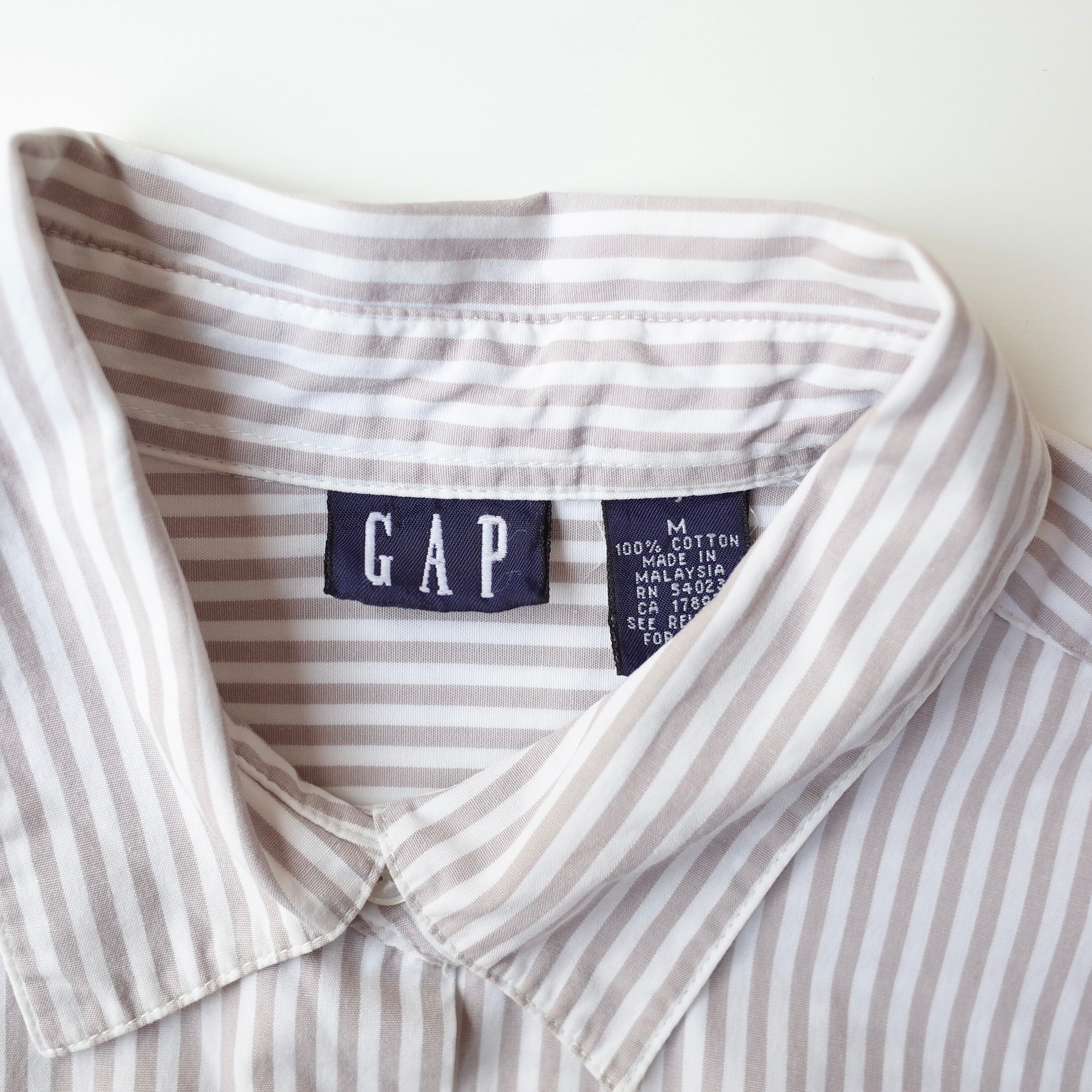 90年代製オールドGAPのストライプシャツ。ベージュ×ホワイトのグッドカラー。スウェットの下にレイヤーしたり、ざっくり羽織ってもかわいいゆったりとしたサイズ感です。