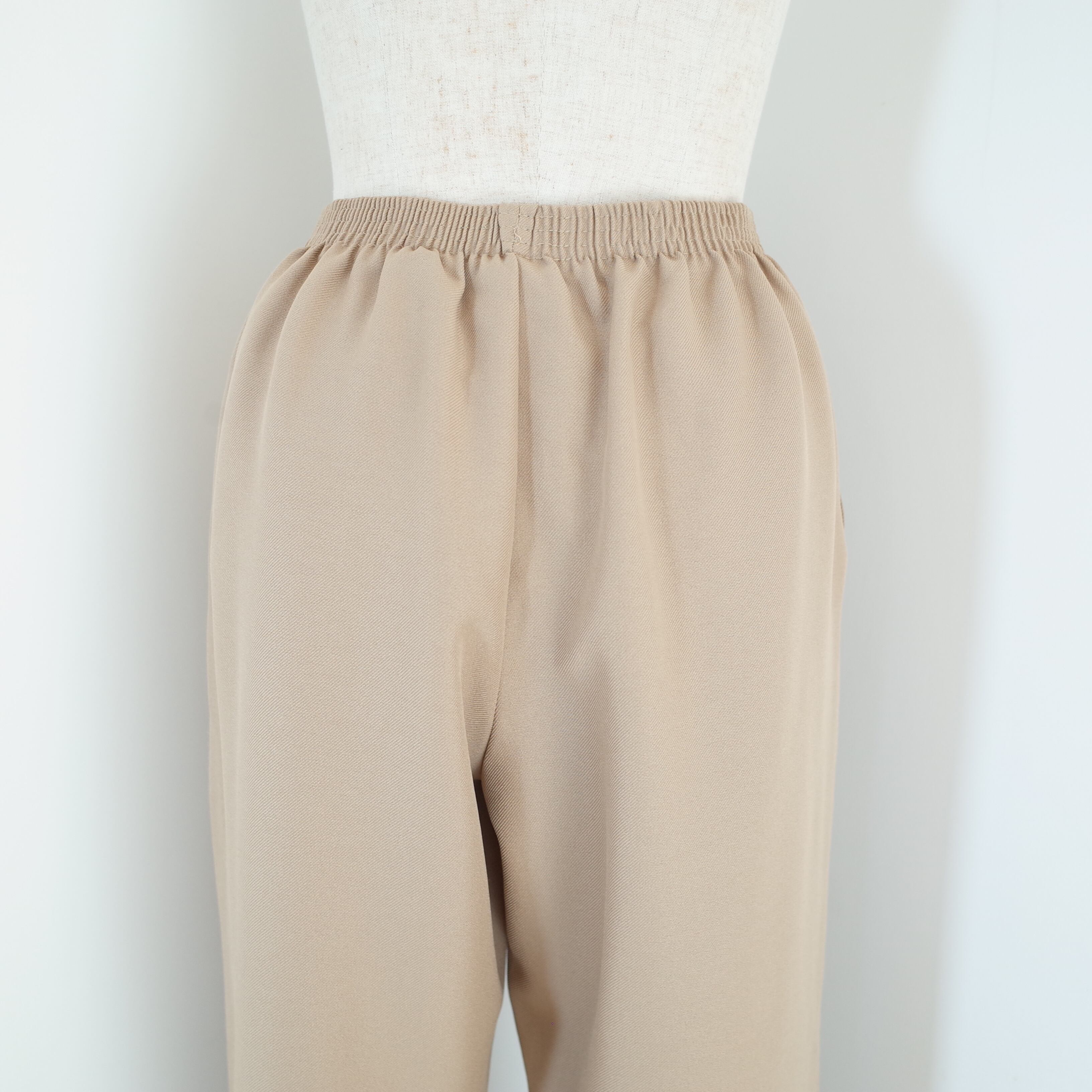 使い勝手の良いベージュカラーのイージーパンツ。シワのつきにくいポリエステル素材で、レングスは少しフレア気味のストレートシルエット。ウエストはゴムで楽ちんな履き心地の為、お家でのリラックスウェアとしても◎コーディネート次第では綺麗目にも着用頂ける万能なパンツです。
