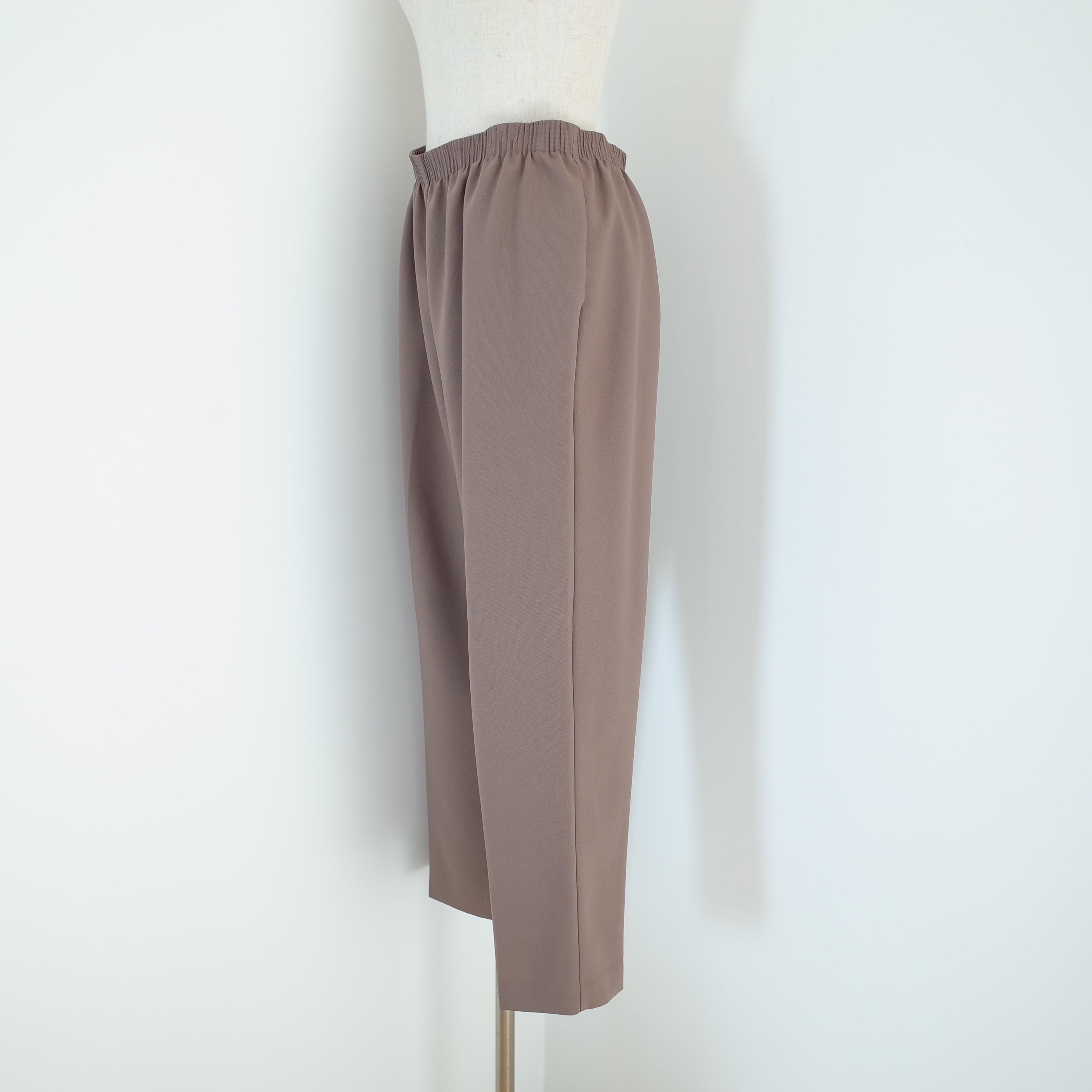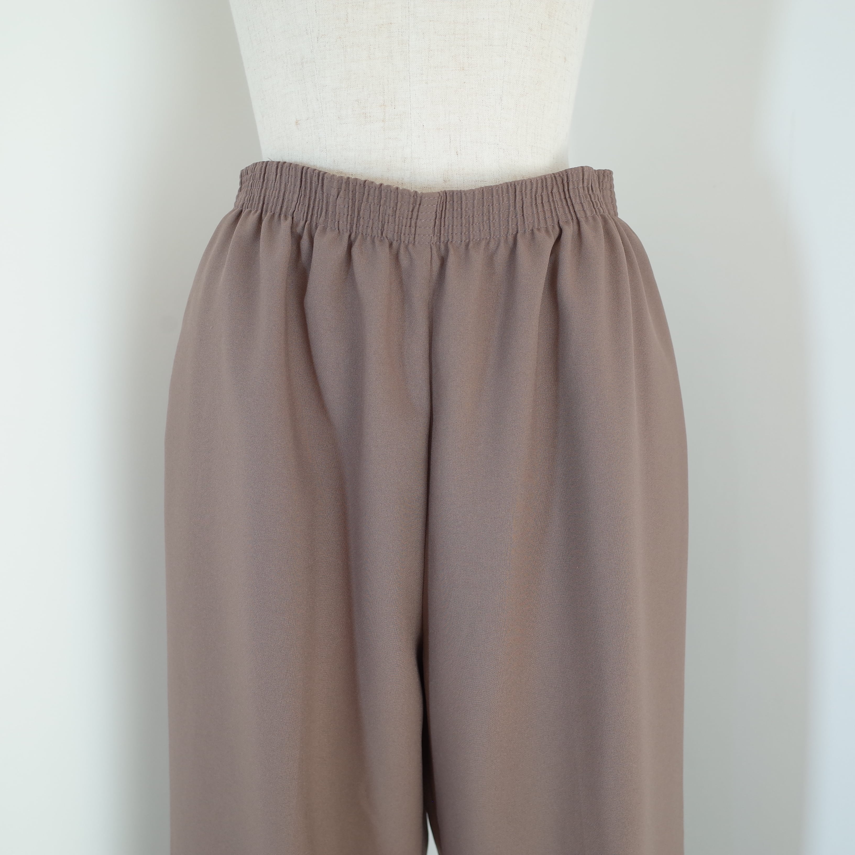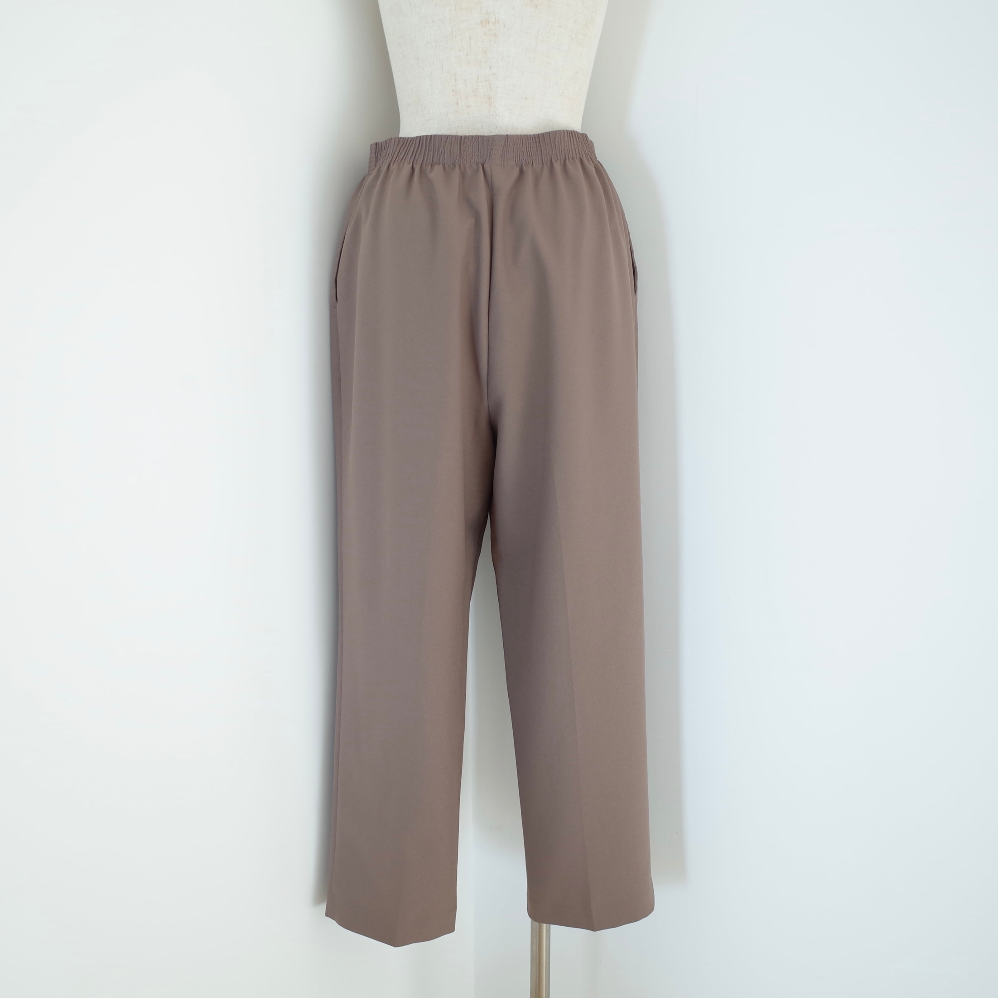 濃いめのグレージュカラーで使い勝手の良いイージーパンツ。シワのつきにくいポリエステル素材で、レングスは気持ちテーパードの効いたストレートシルエット。ウエストはゴムで楽ちんな履き心地の為、お家でのリラックスウェアとしても◎コーディネート次第では綺麗目にも着用頂ける万能なパンツです。