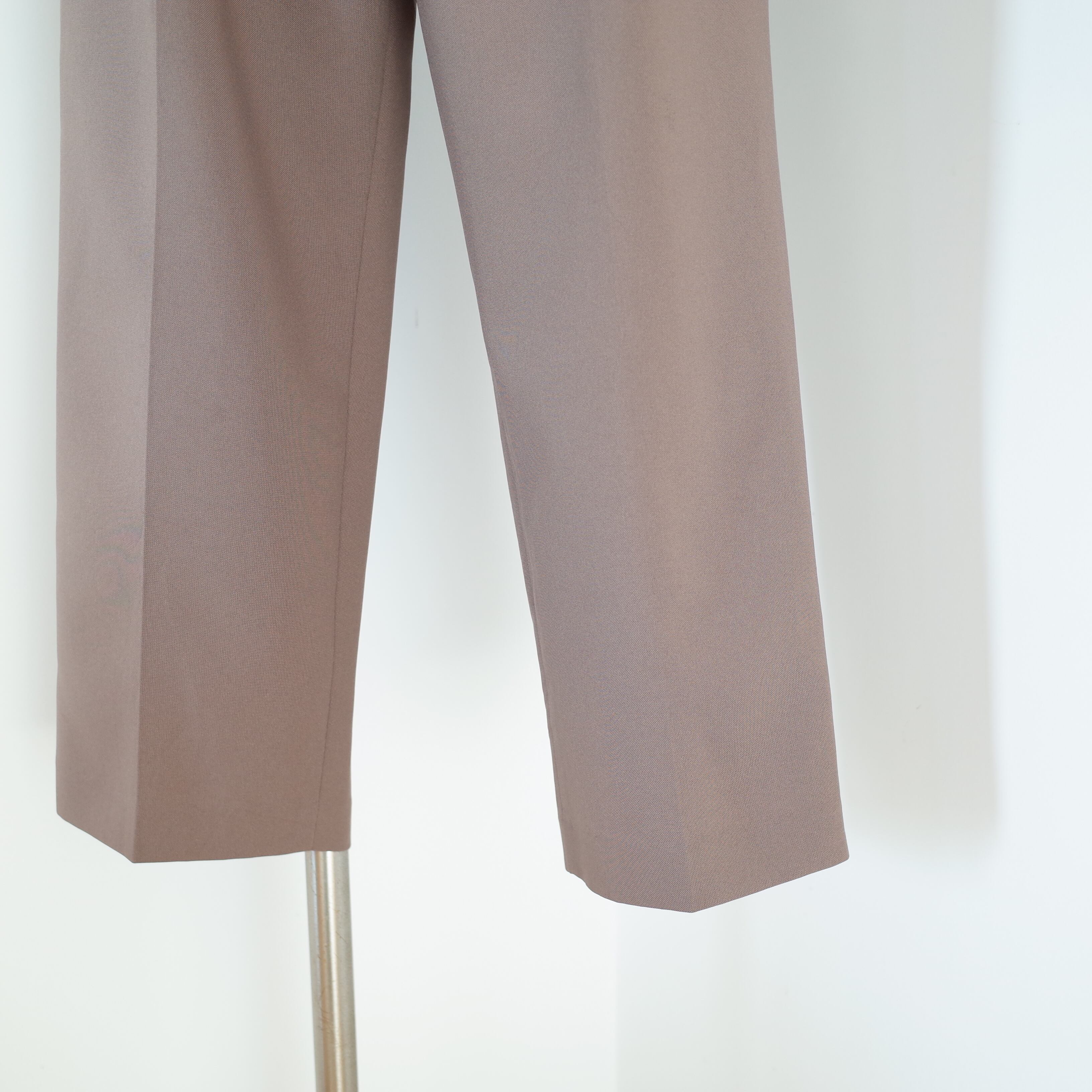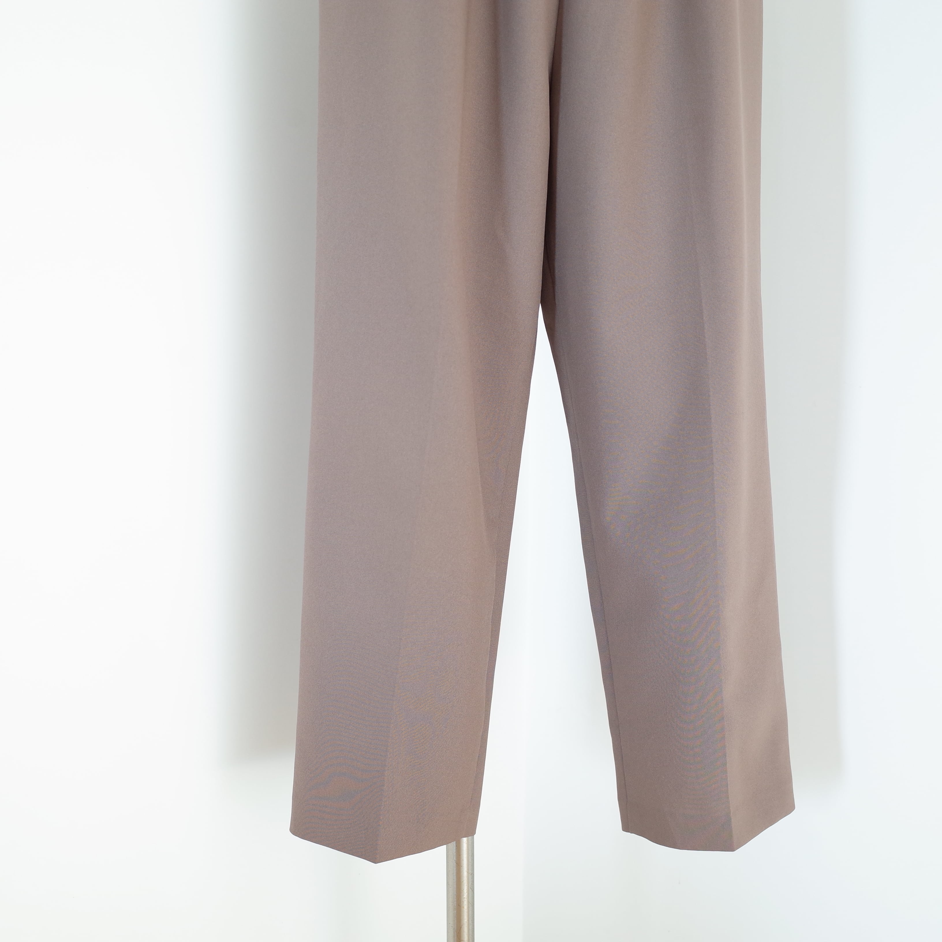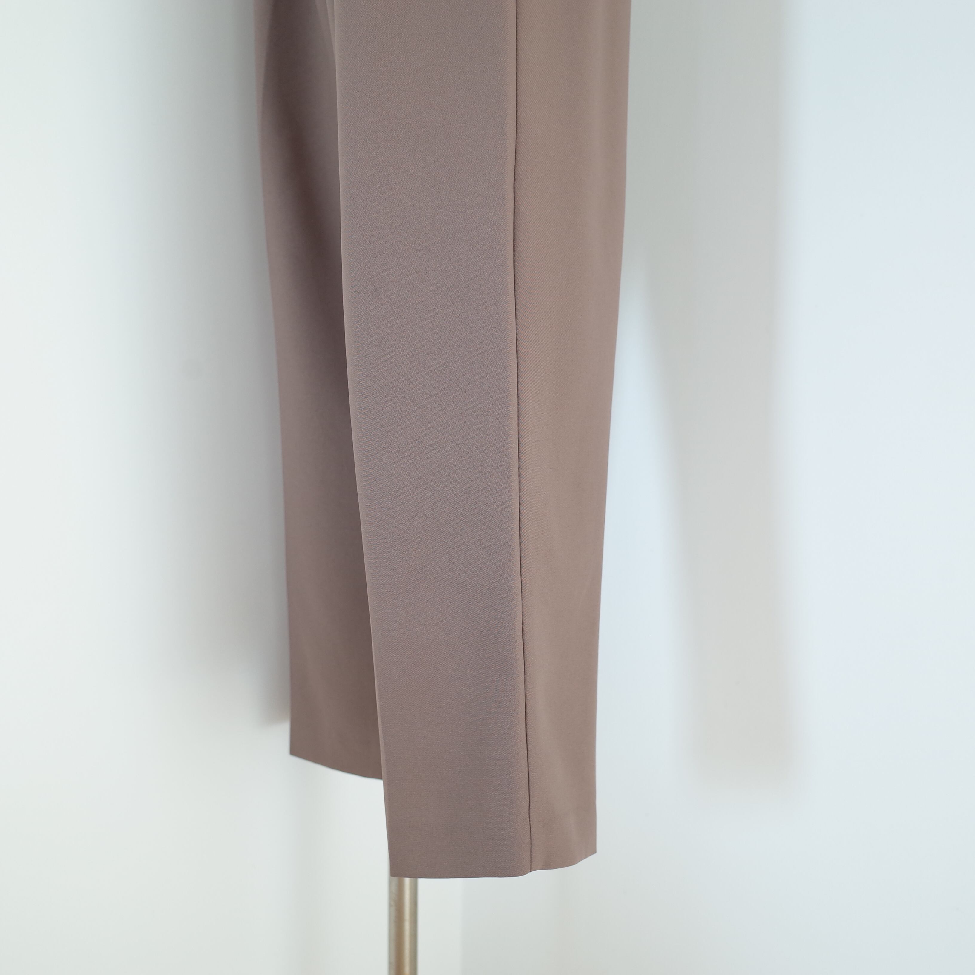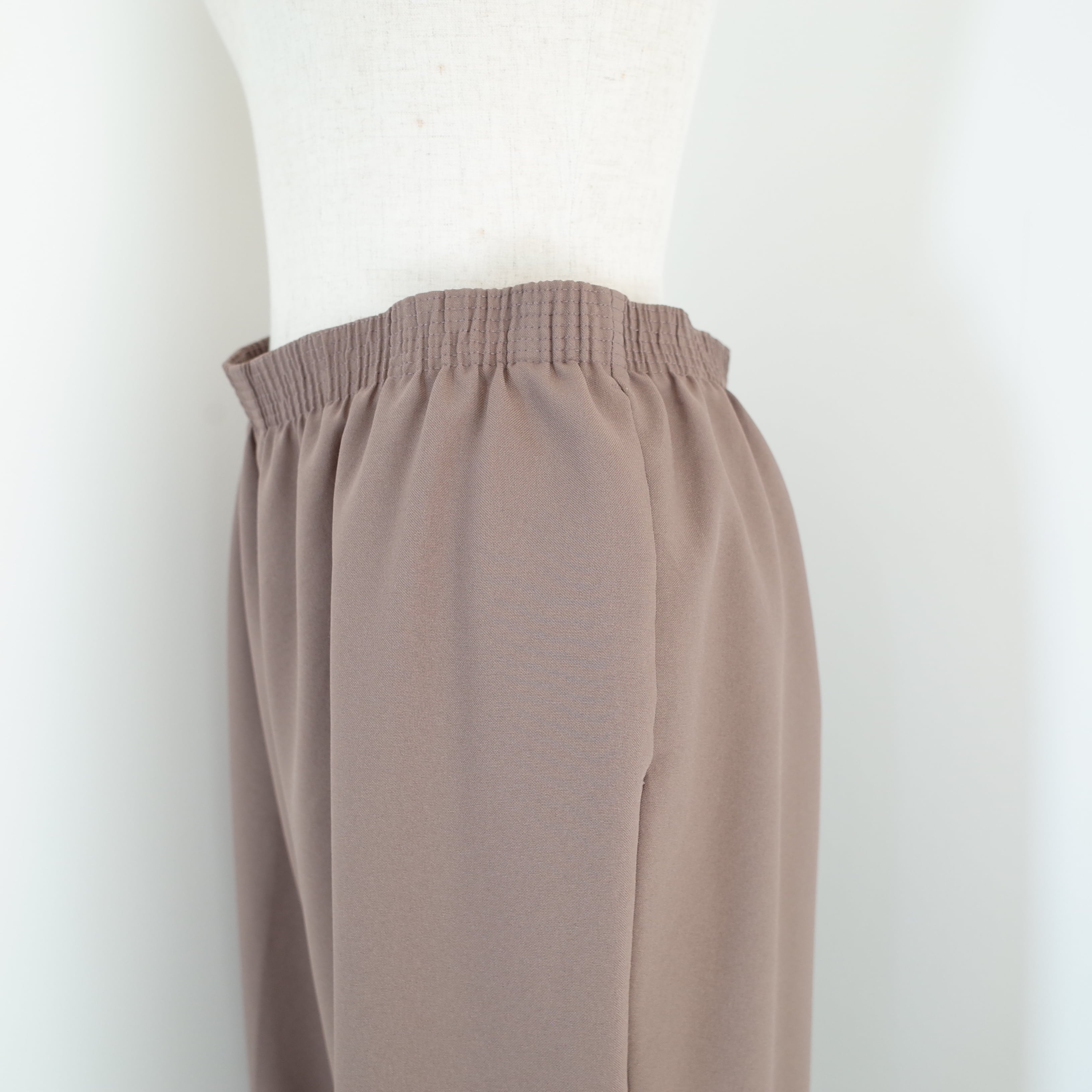 濃いめのグレージュカラーで使い勝手の良いイージーパンツ。シワのつきにくいポリエステル素材で、レングスは気持ちテーパードの効いたストレートシルエット。ウエストはゴムで楽ちんな履き心地の為、お家でのリラックスウェアとしても◎コーディネート次第では綺麗目にも着用頂ける万能なパンツです。