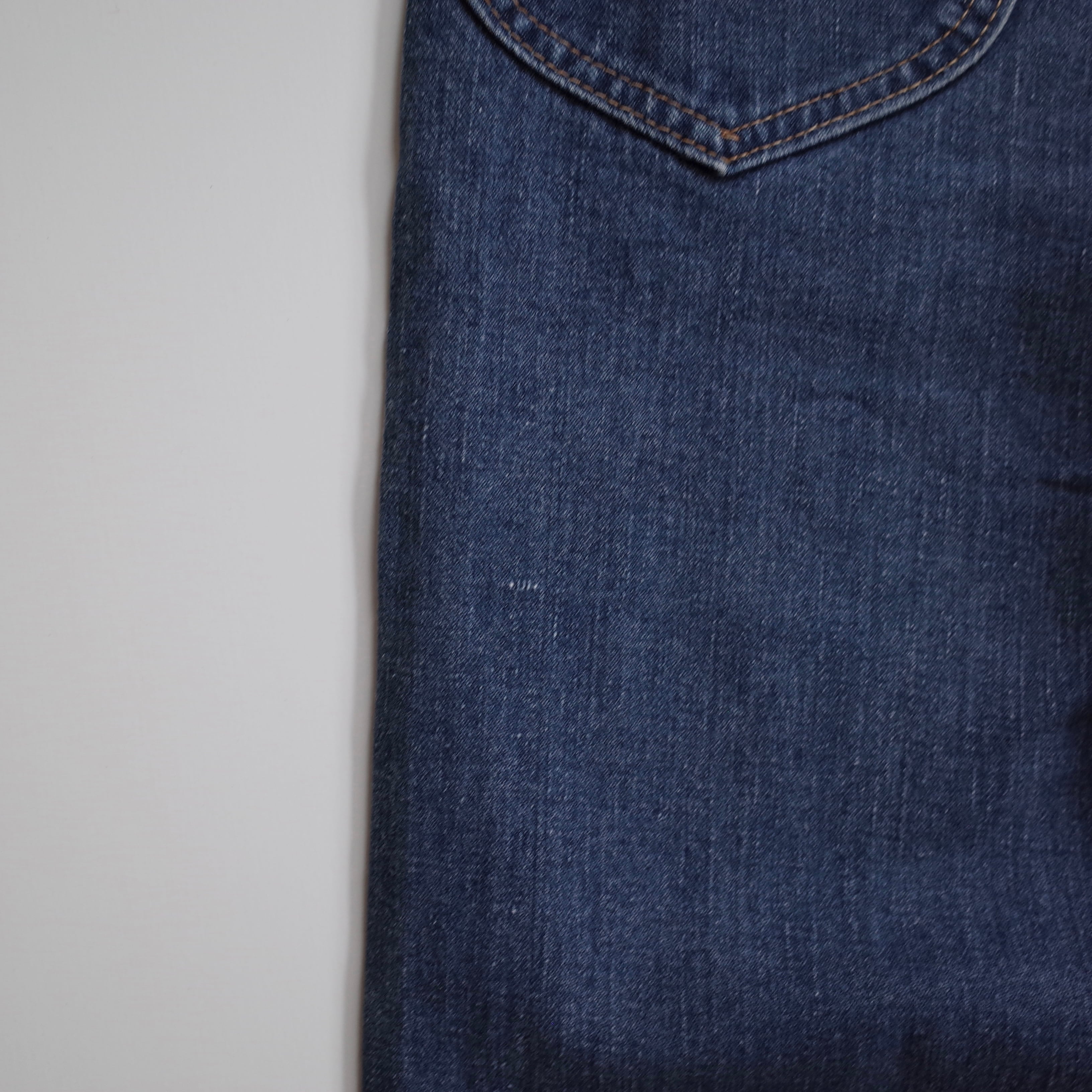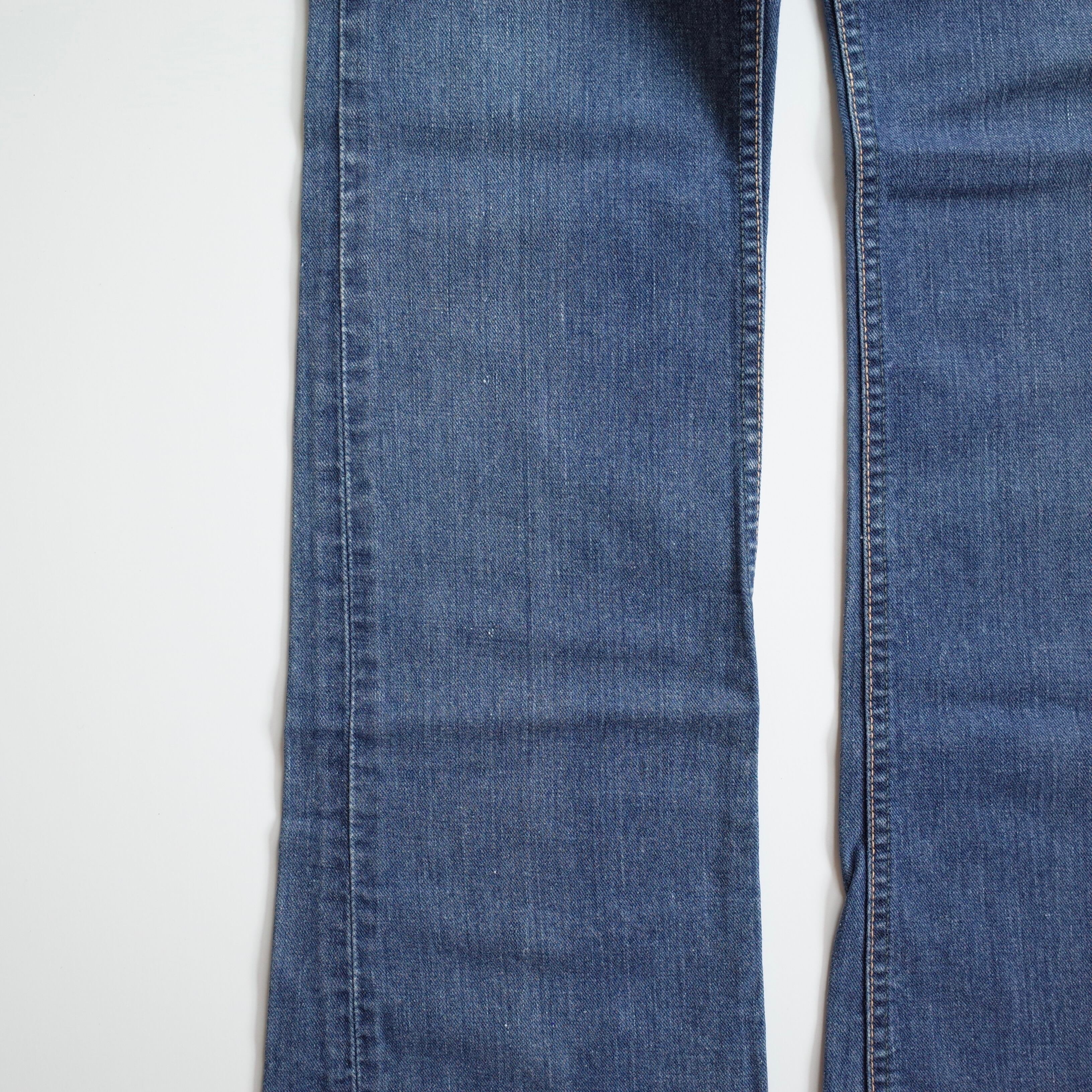 70年代アメリカ製Leeのブーツカットフレアデニムパンツ。ウエスト周り・ヒップから脚にかけてシルエットを綺麗に見せてくれる、ハイウエストで緩やかなフレア。Leeならではの縦落ちがヴィンテージデニムらしい表情で、雰囲気ある一本です。70sのカジュアルスタイルから、現代的なモダンスタイルまで、幅広いスタイリングを楽しめる旬なフレアパンツです。