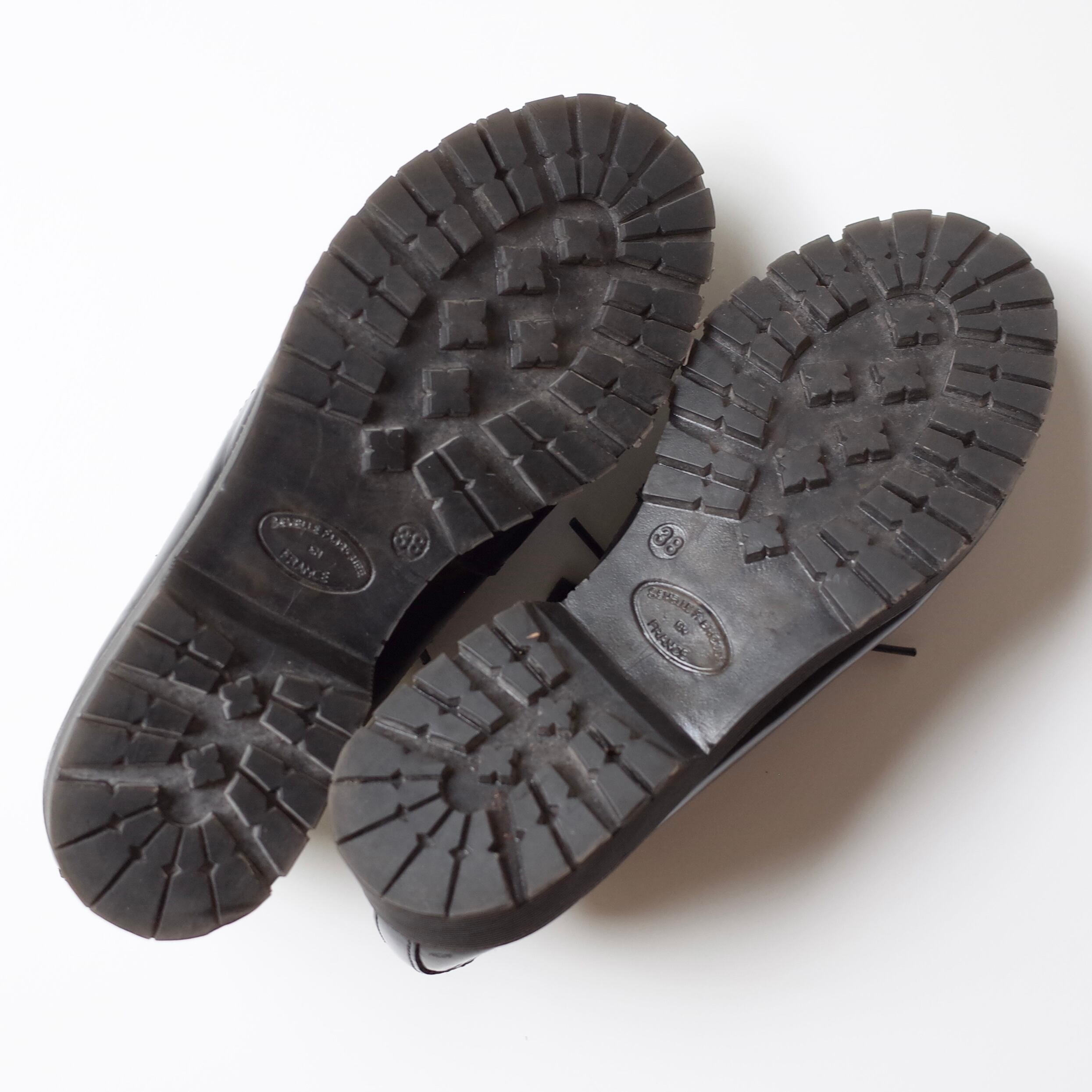 フランス製シンプルで使いやすいデザインのレザーシューズ。ウィングチップのデザインがマスキュリンな一足。どんなスタイルにも合わせやすく、オンオフ問わず活躍するアイテムです。よく見ると、ネイビーカラーのシューズを上からブラックで塗った様な塗りあとがあります。グリップ力のあるソールも魅力的です。
