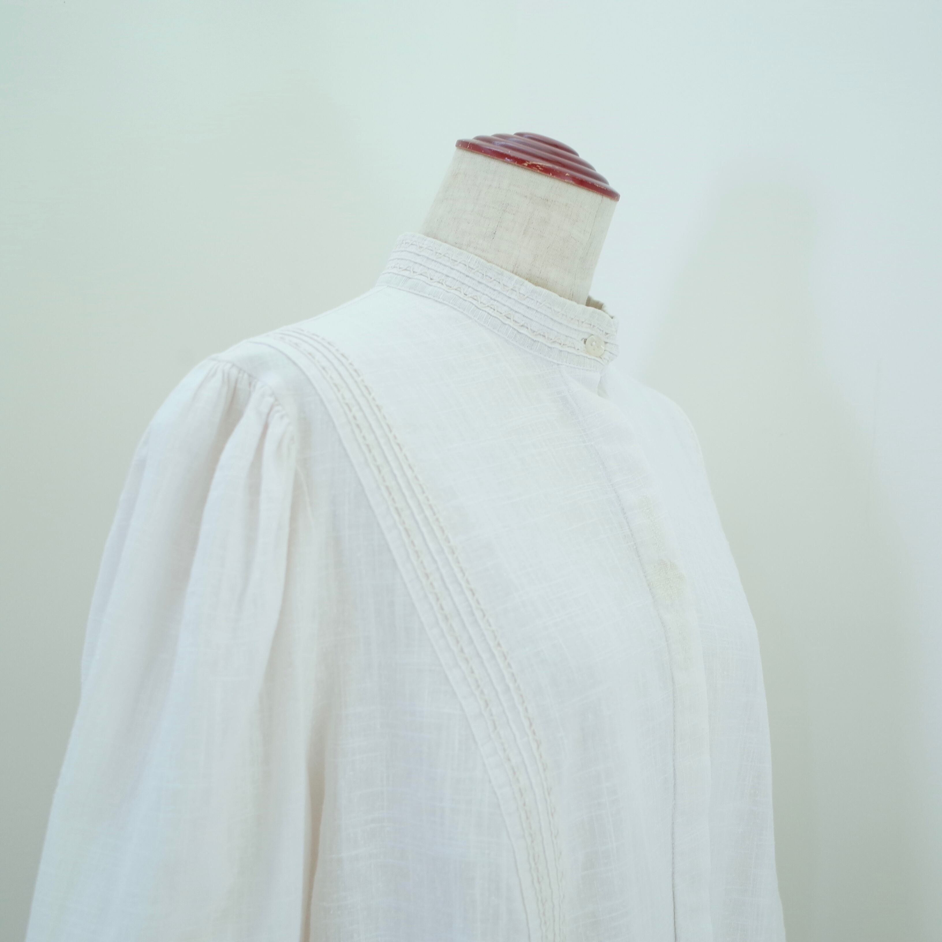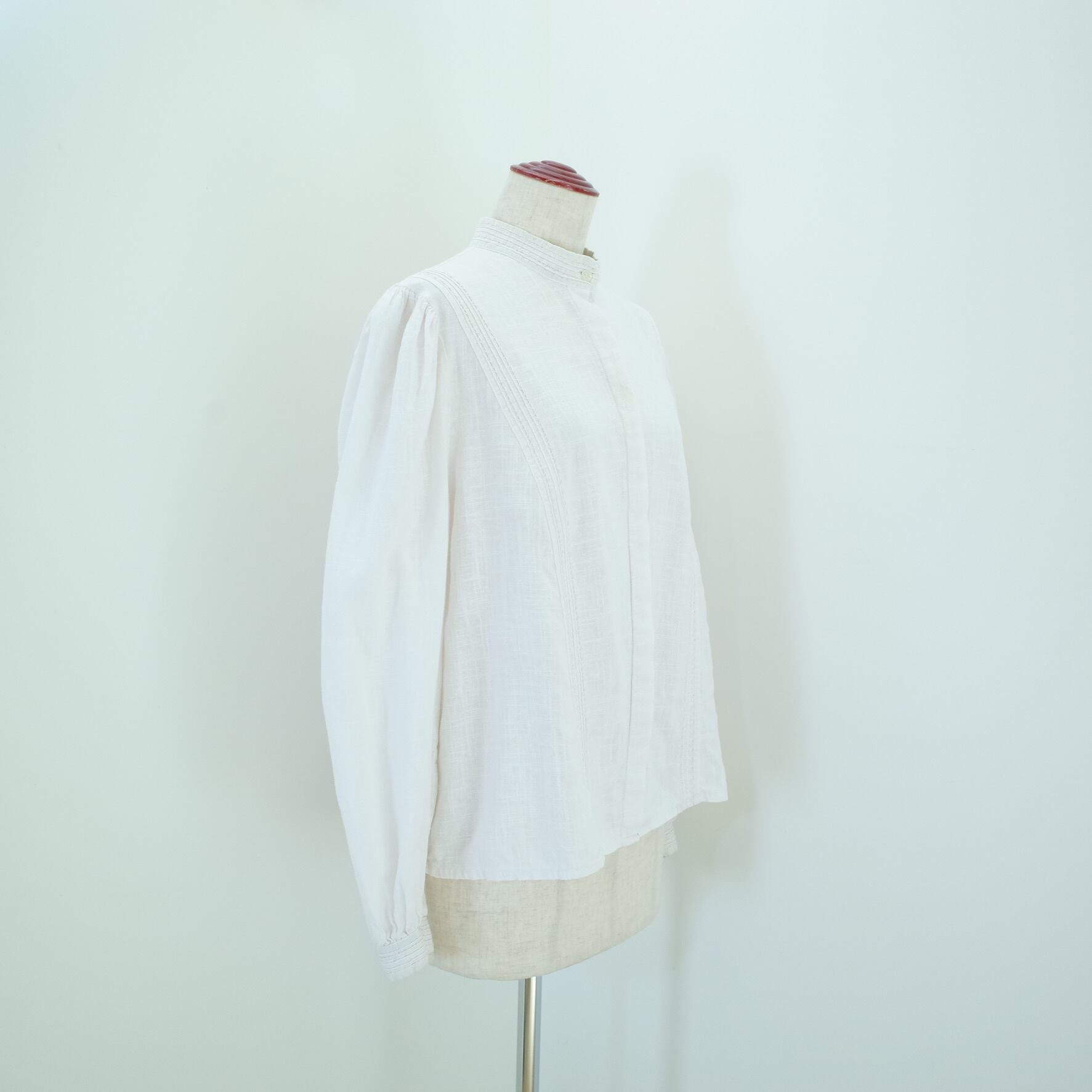 オーストリアのgedeのチロルブラウス。肩の無数のタックや刺繍が美しい一枚。スタンドカラーで襟元もすっきりとしています。薄らとシアー感のあるコットンリネンの涼しげな素材もgoodなブラウスです。