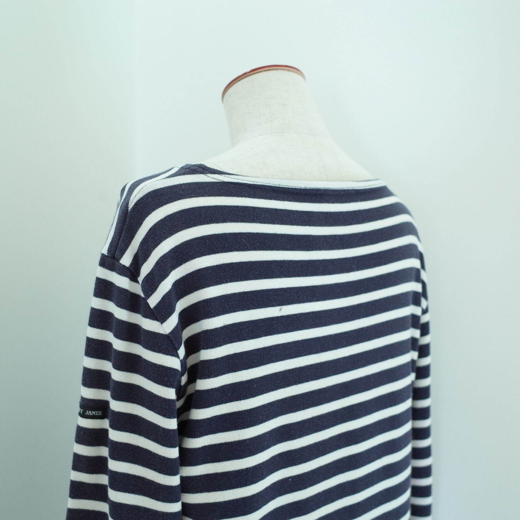フランス製Saint Jamesのバスクシャツ。ネイビーとホワイトのボーダーが、フランスのエスプリを感じさせます。海の暮らしから生まれた実用的なデザインとコットン100%の素材は大変丈夫で、着込んで洗濯を繰り返していくうちに、だんだんと風合いが出て、ニュアンスを保ちながら長く愛用することができます。