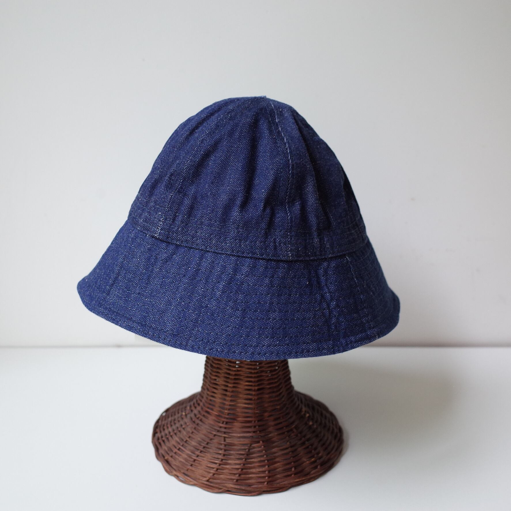 ステンシルがポイントのデニム素材のバケットハットです。しっかりと深く被れるので、これからの季節日焼け対策にも。畳んで小さくなるので持ち運びにも便利です。