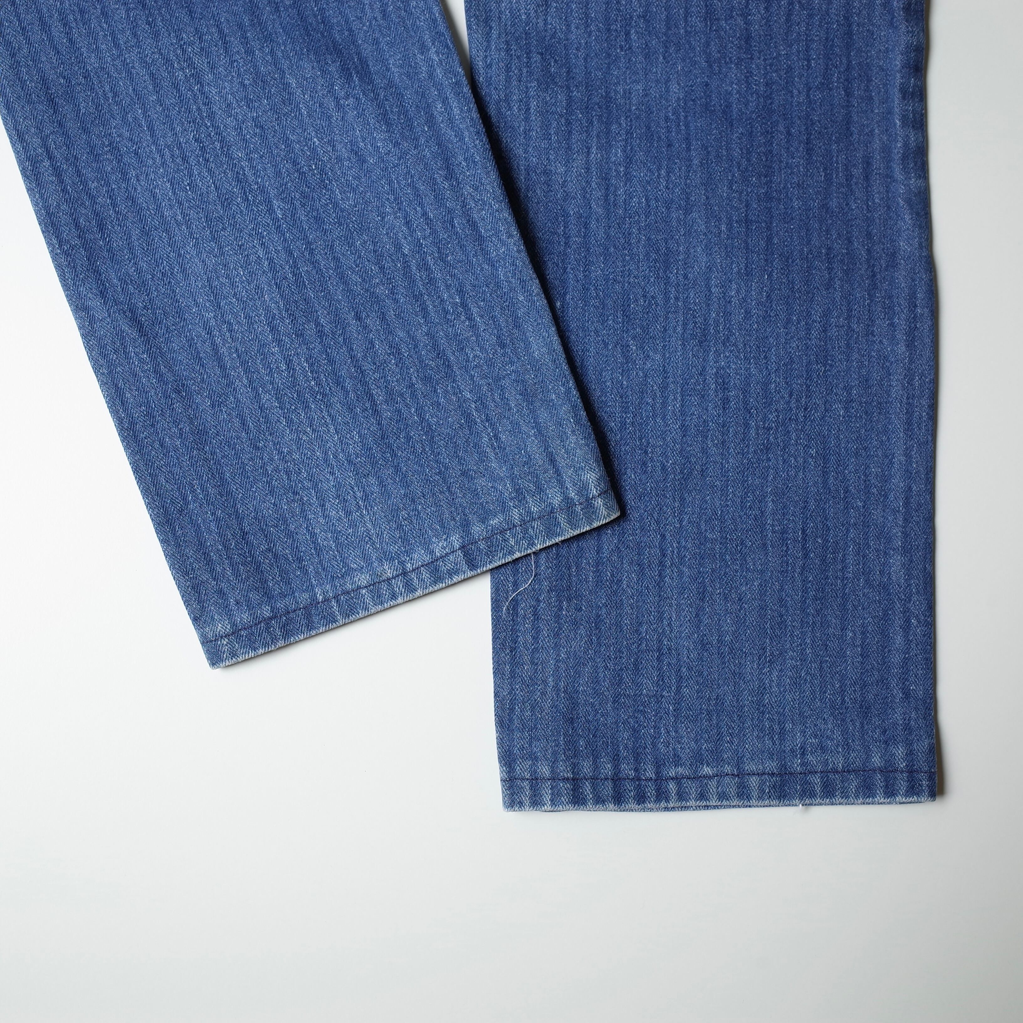 80年代アメリカ製Leeのデニムパンツです。レングスはストレートで、珍しいストライプ柄。ブルーの落ち方も味のある一本。 Leeならではの穏やかな曲線を描いたバックポケットがシルエットの綺麗さをより際立たせてくれます。Levi'sとはまたひと味違ったLeeのデニムもワードローブのバリエーションに取り入れたい一着です。
