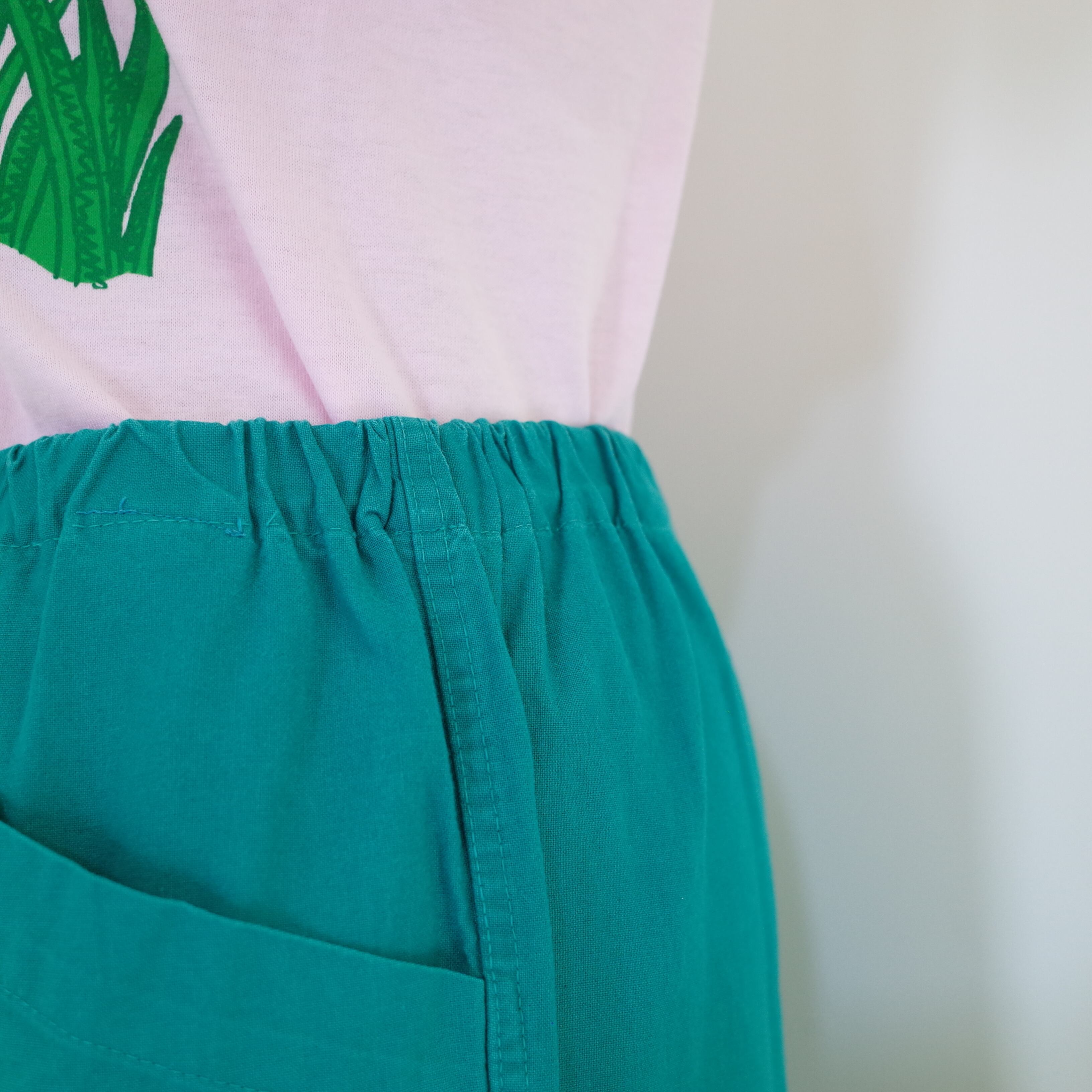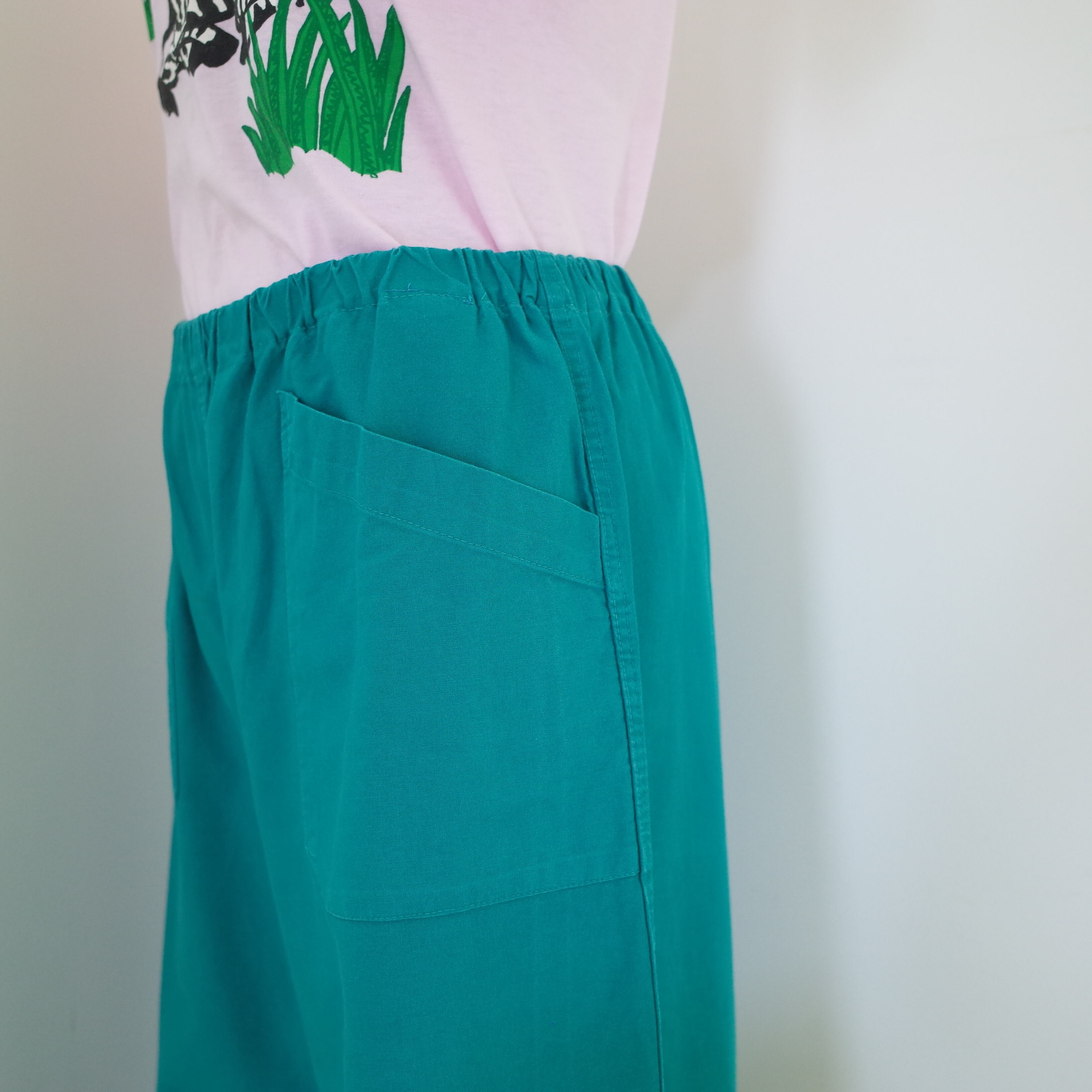 コットンのイージーパンツ。ワイドレングスにウエストはゴム。夏に向けて涼しく履けるボトムです。ポケットのデザインが使いやすくて可愛いパンツ。お家でのリラックスウェアとしても◎