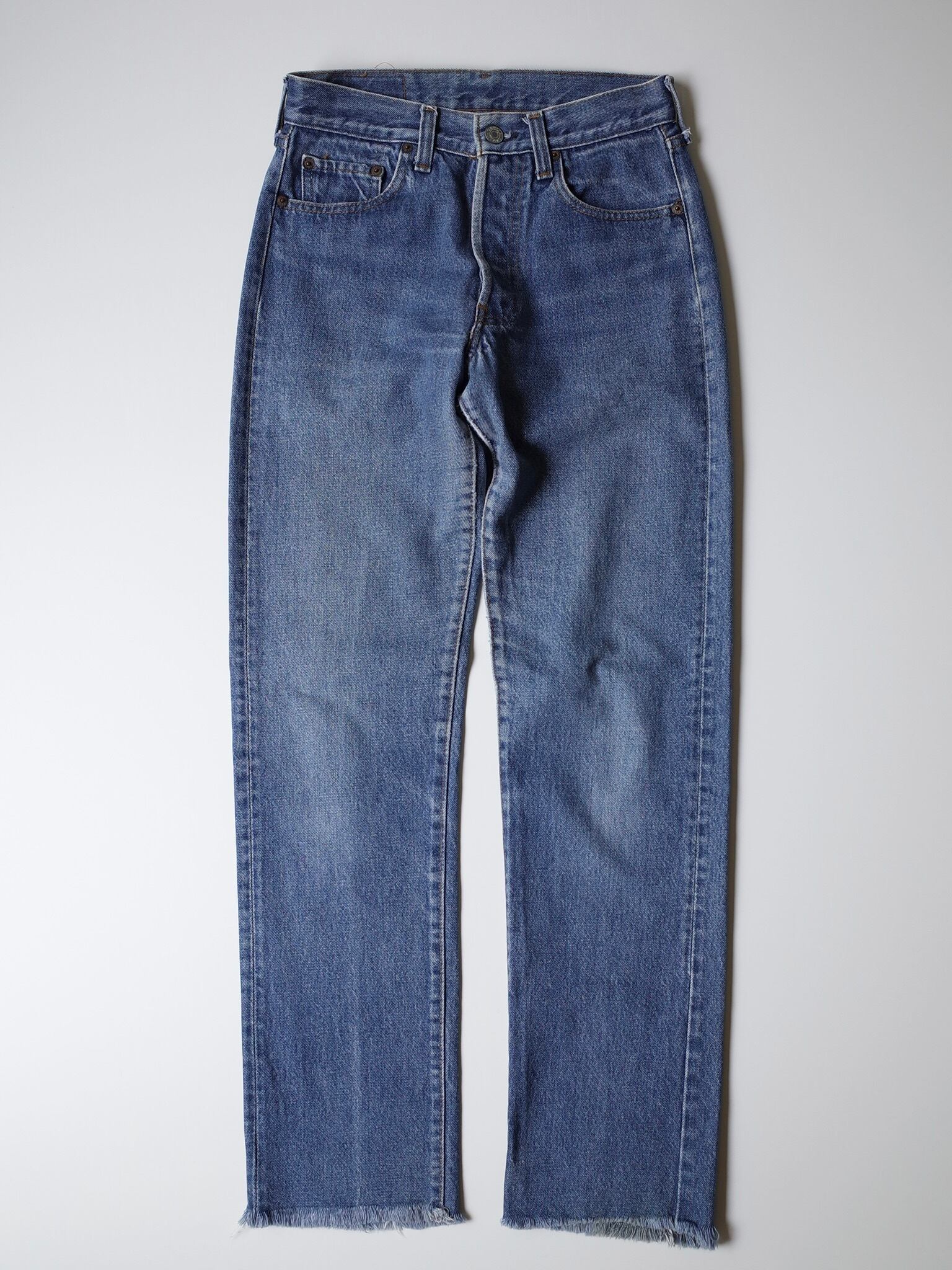 80年代USA製Levi's501のヴィンテージデニムパンツです。バックポケット部の取り付け強化のバータック(カンヌキ)が黒色のため、通称黒カンとも呼ばれています。裾はカットオフになっていますが、ヴィンテージデニムならではの良い生地感でブルーの落ち方の雰囲気も抜群な一本です。