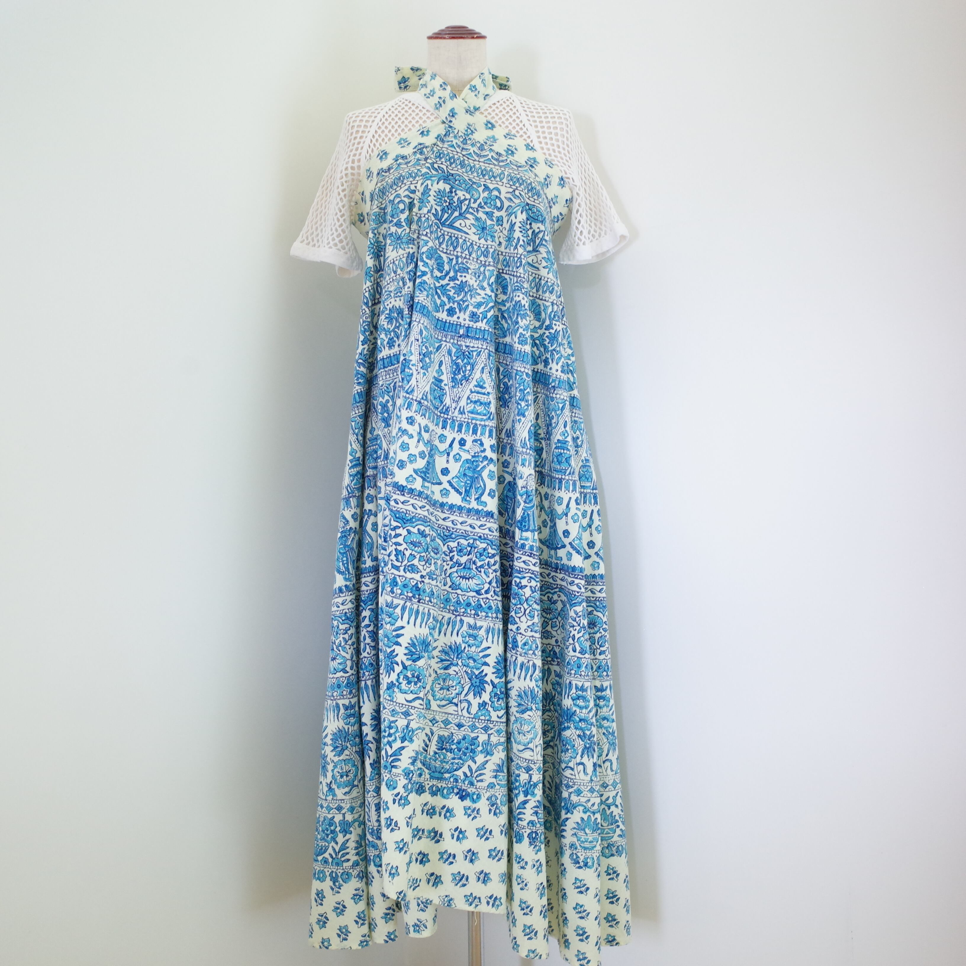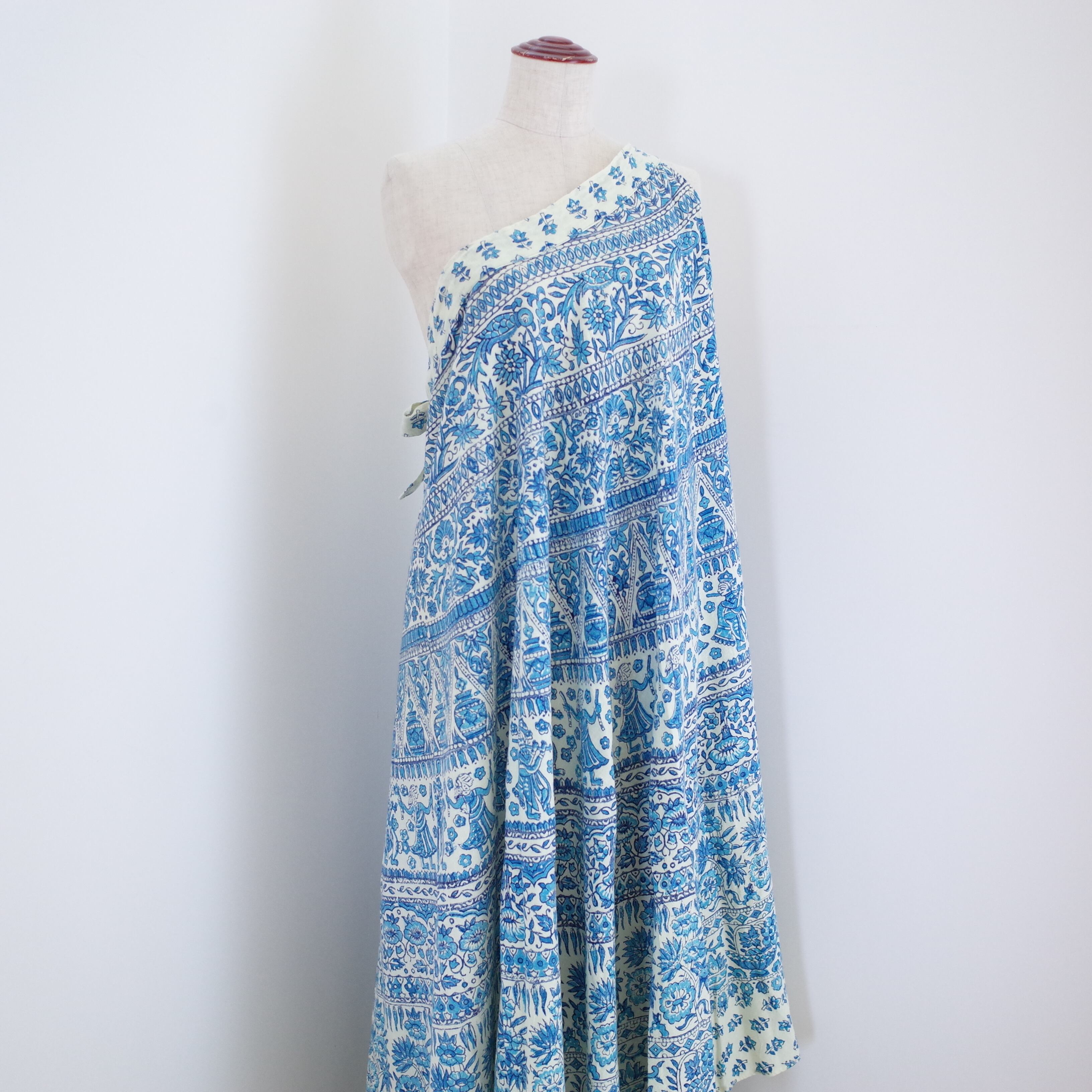 インドコットンのラップスカート。ホワイト地にブルーの配色が爽やかな一枚。着丈が長いので、パレオのように巻いてワンピースにして着用するのもおすすめです。画像のようにワンショルダーにしても◎水着の上やTシャツの上から巻けるので、これからの季節ビーチやリゾートのお供に最適です。