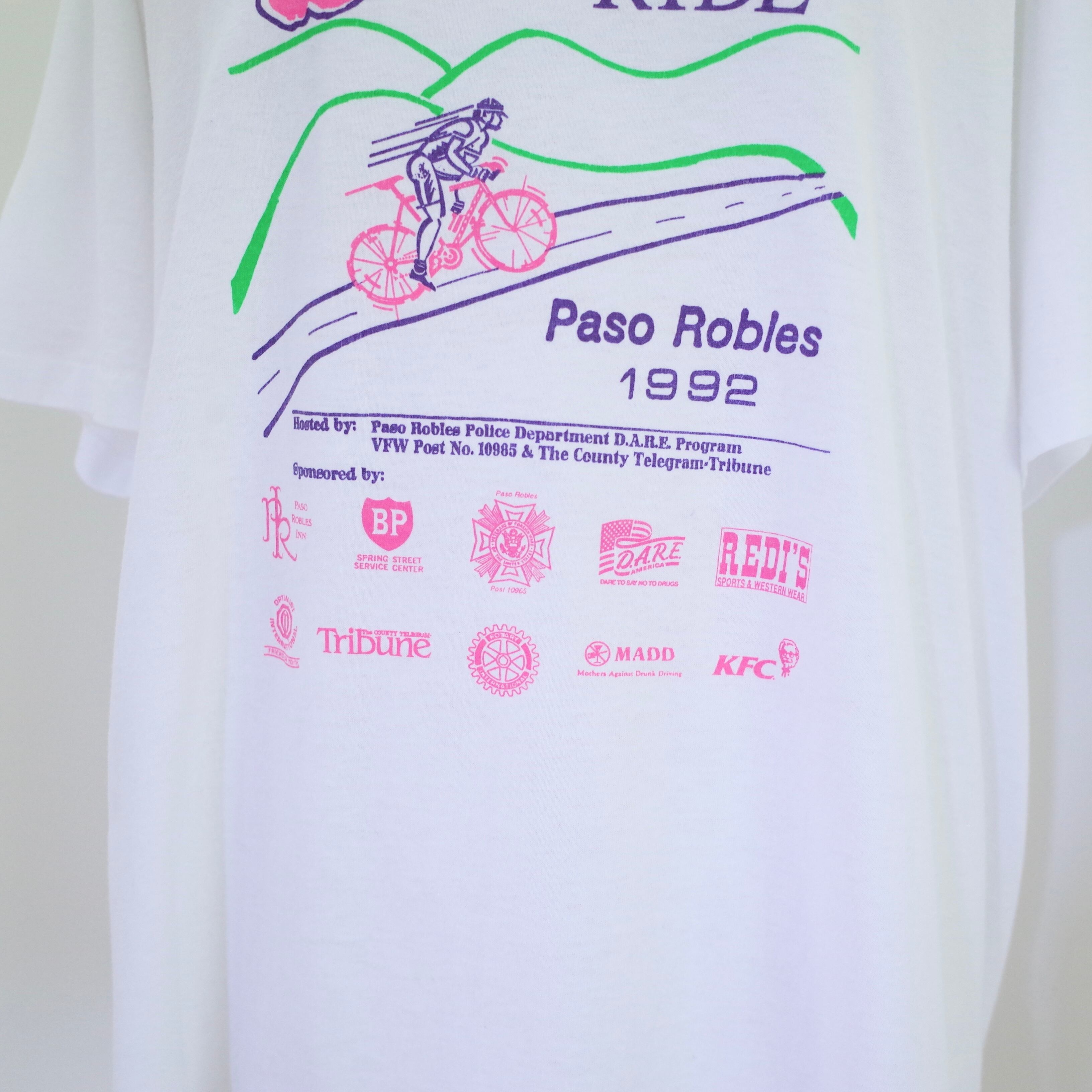 90年代アメリカ製SCEEN STARSボディのTシャツ。1992年にカリフォルニアのパソ・ロブレスで行われたロードバイクのイベントtee。スポンサー企業のロゴがたくさん入った一枚。ネオンカラーのプリントもGoodです◎