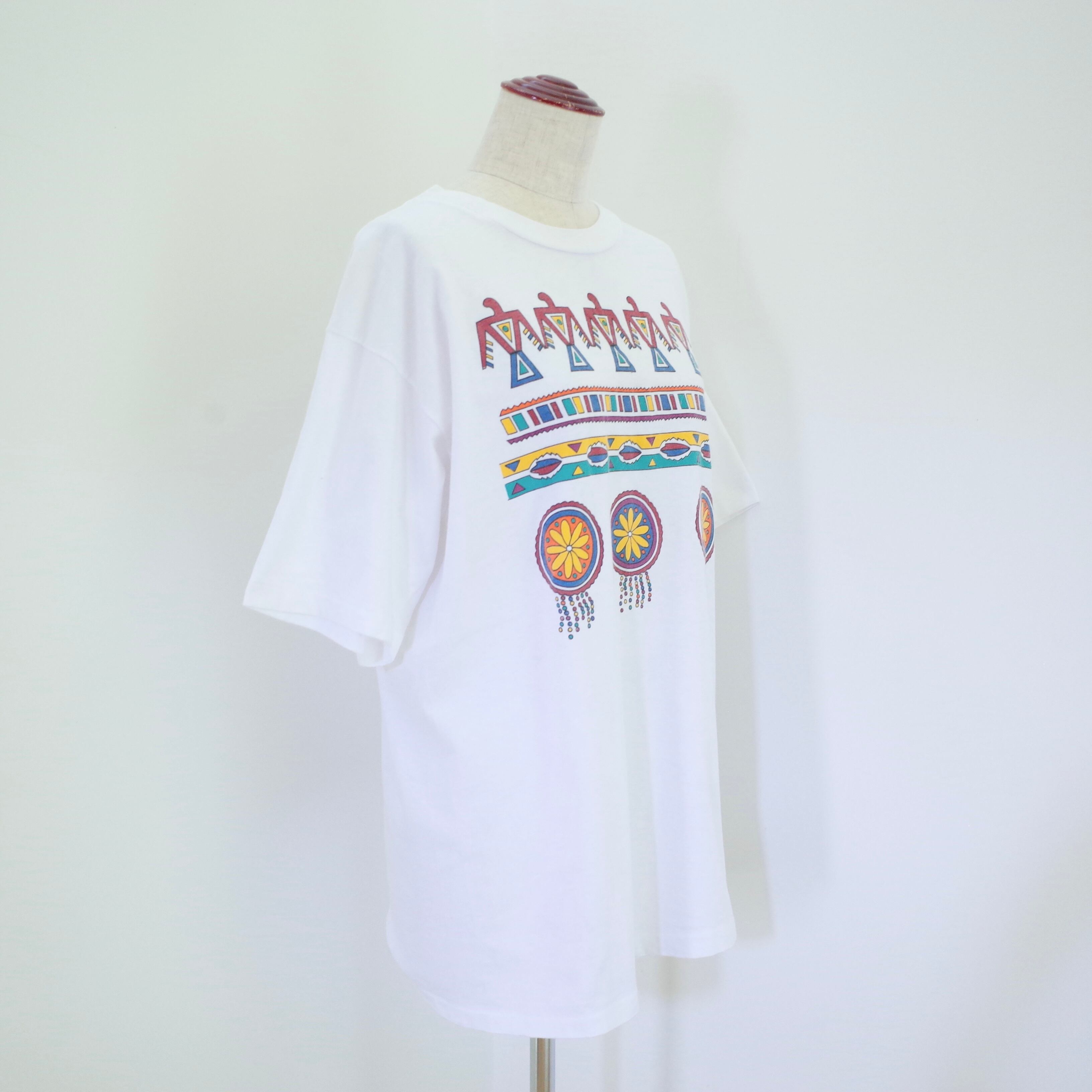 90年代アメリカ製、カラフルなトライバル柄プリントがかわいいTシャツです。インディアンに伝わるサンダーバードやコンチョのモチーフが描かれた一枚。