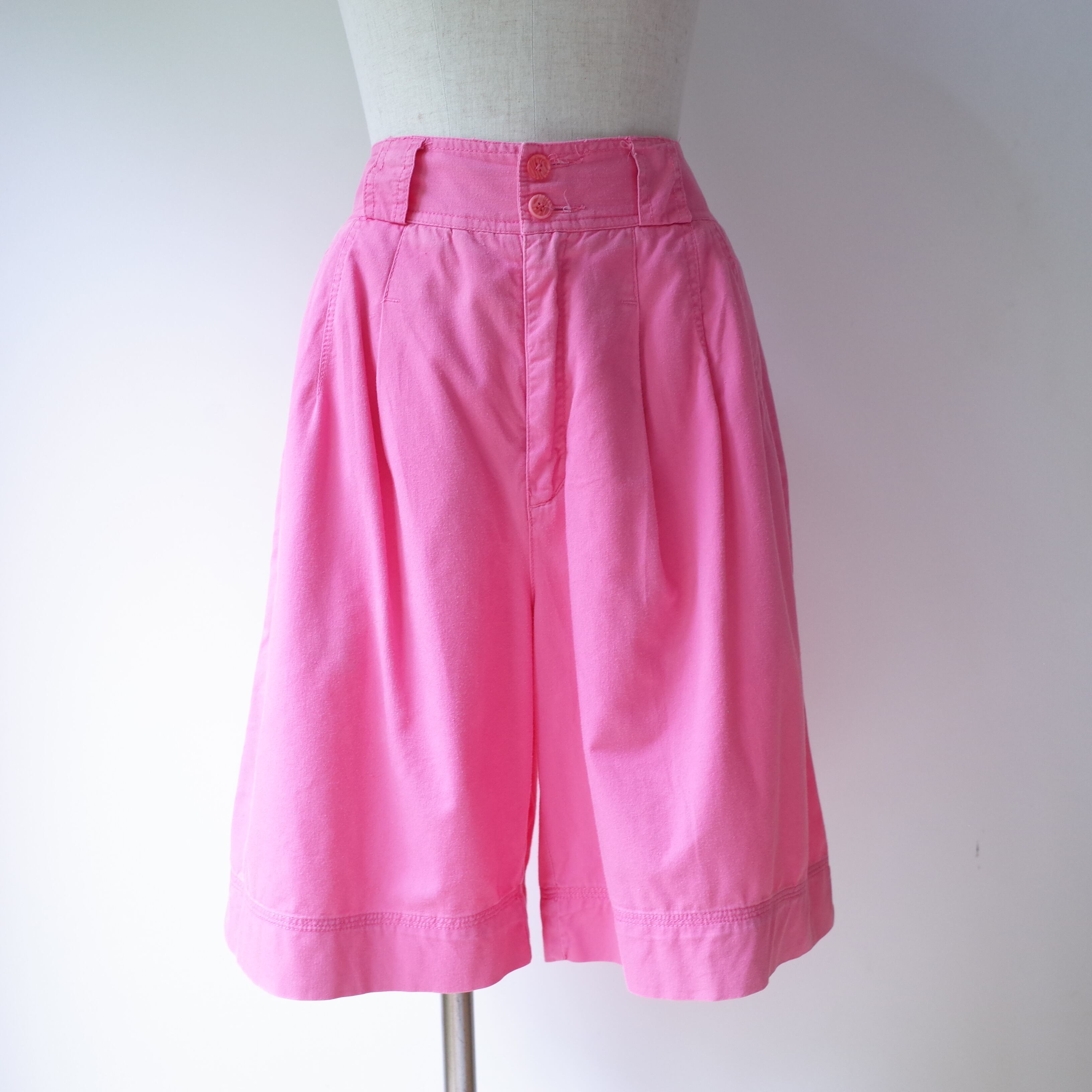 ピンクのカラーがかわいいESPRITのショートパンツ。1980〜90年代に人気だったカリフォルニア発のラグジュアリーアパレルブランド「エスプリ」。薄手のコットン素材、ツータックでキュロットのように広がった程よくボリュームのあるシルエットが、暑い季節でも涼しい穿き心地のショートパンツです。ハイウエストなのでタックインしたスタイリングも◎