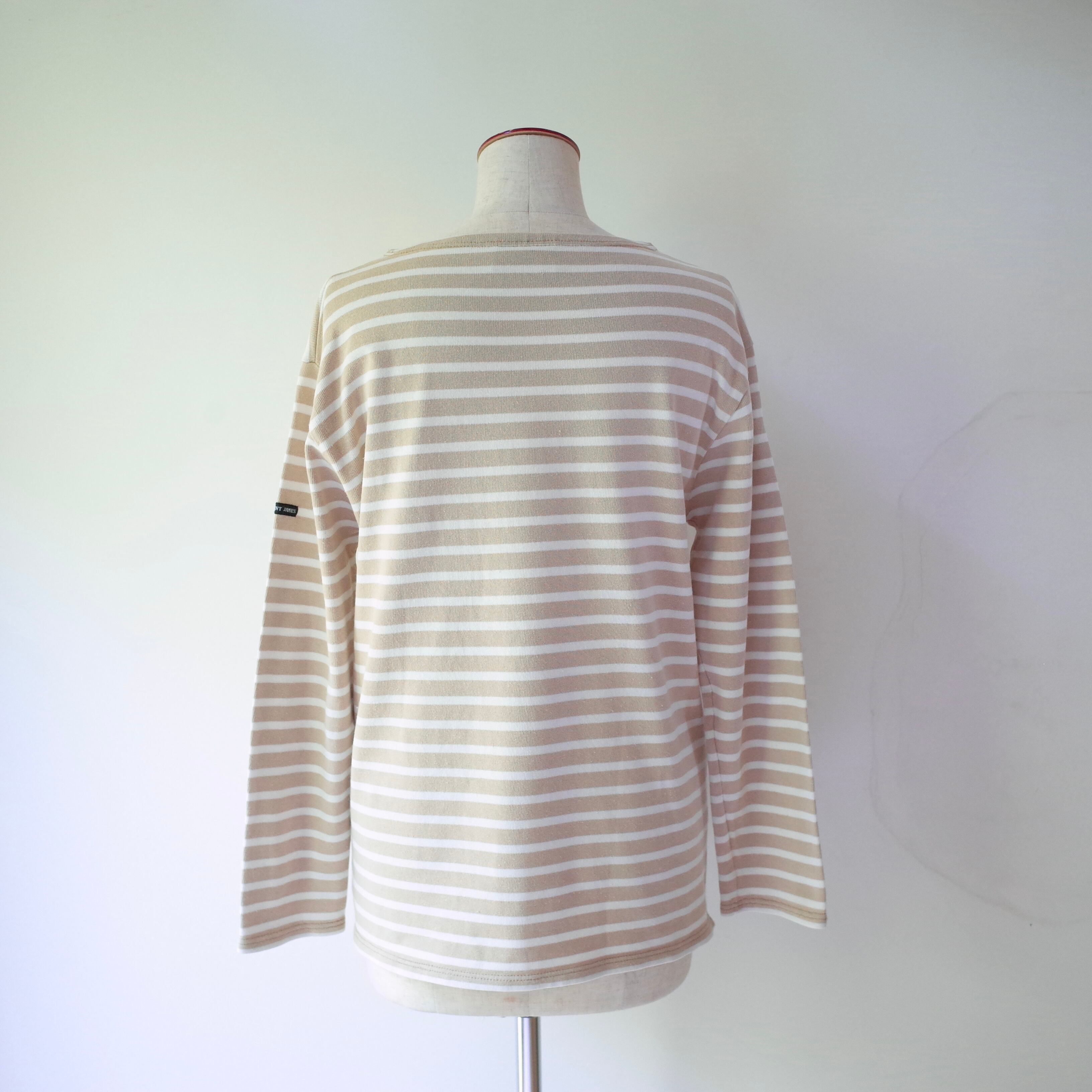 80年代フランス製Saint Jamesのバスクシャツ。ホワイトとベージュのボーダーが、フランスのエスプリを感じさせます。海の暮らしから生まれた実用的なデザインとコットン100%の素材は大変丈夫で、着込んで洗濯を繰り返していくうちに、だんだんと風合いが出て、ニュアンスを保ちながら長く愛用することができます。