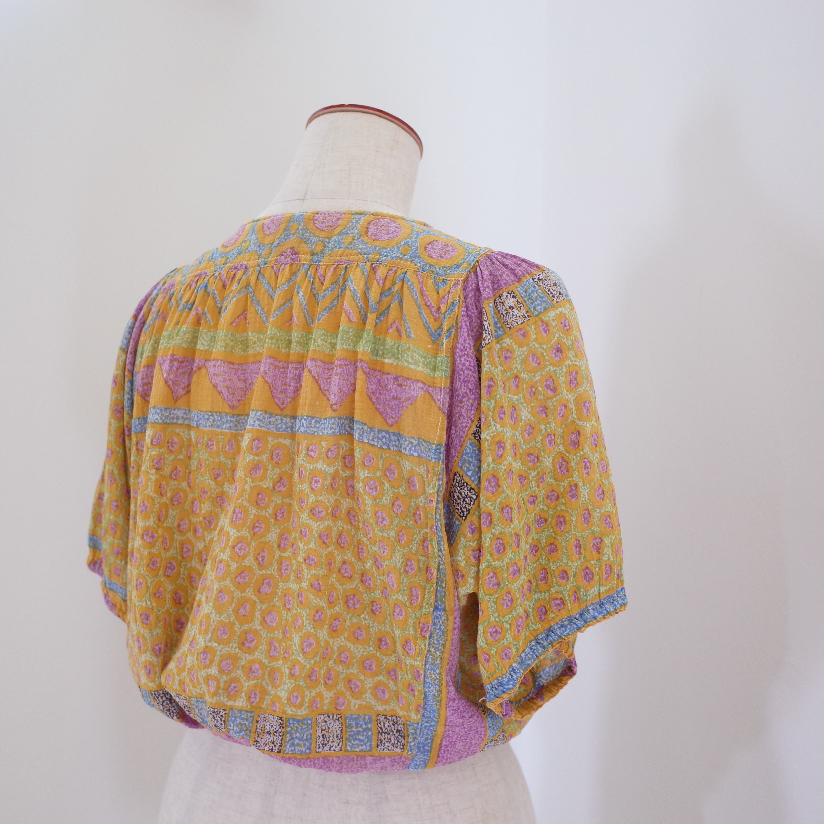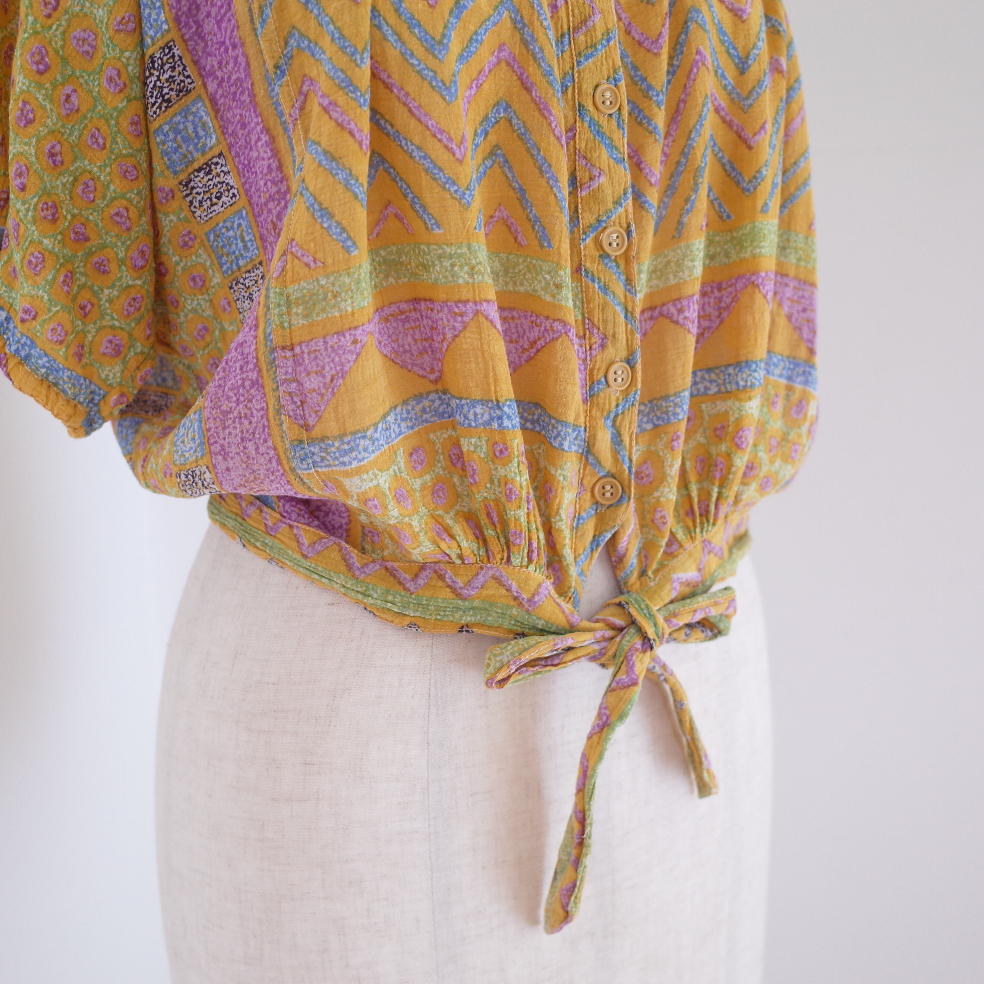 インドコットンのエスニックな柄が可愛いブラウス。サラサラした薄手のコットン素材が涼しげな一枚。丈が短めなので、ハイウエストのボトムとのバランスが抜群です。